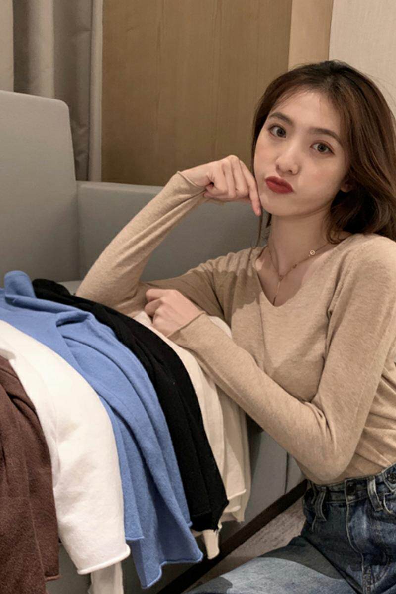 Трикотажный лонгслив, осенний цветной базовый свитер, большой размер, V-образный вырез, подходит для полных девушек, в западном стиле