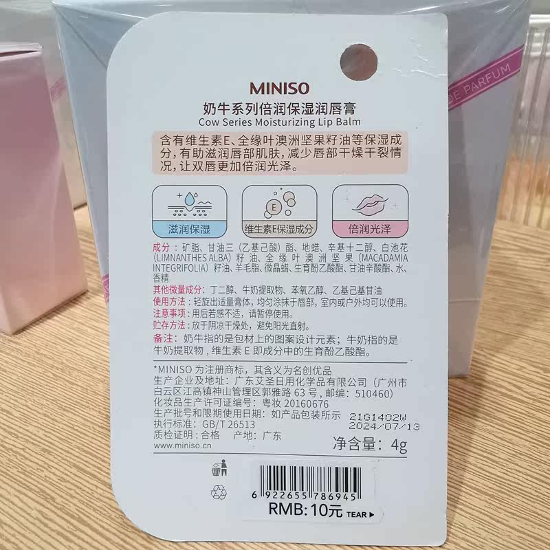 Miniso, увлажняющий водостойкий защитный бальзам для губ, против трещин, 4г