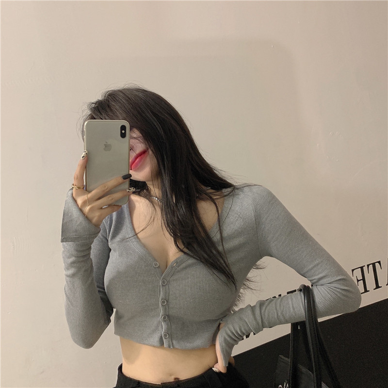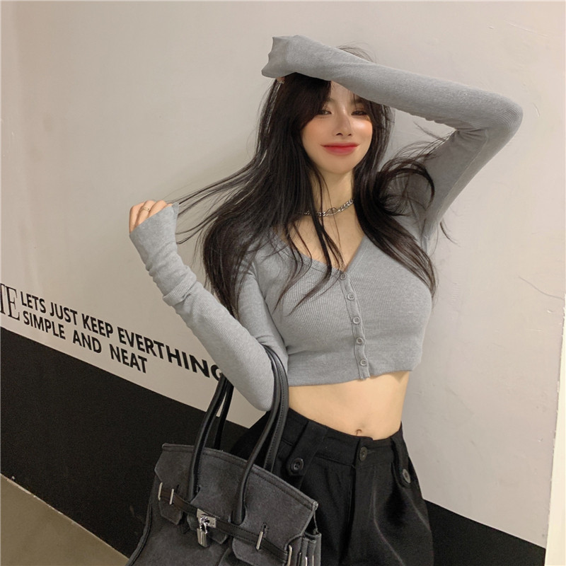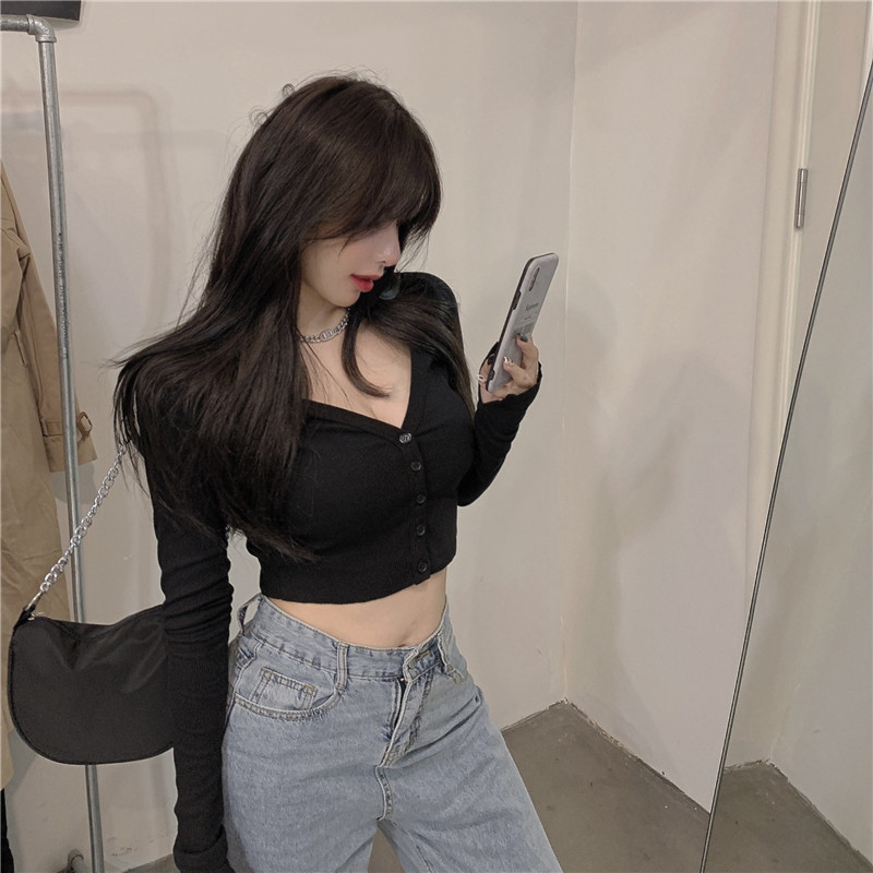 Базовый кардиган, осенняя сексуальная футболка, черный короткий лонгслив, V-образный вырез, в обтяжку