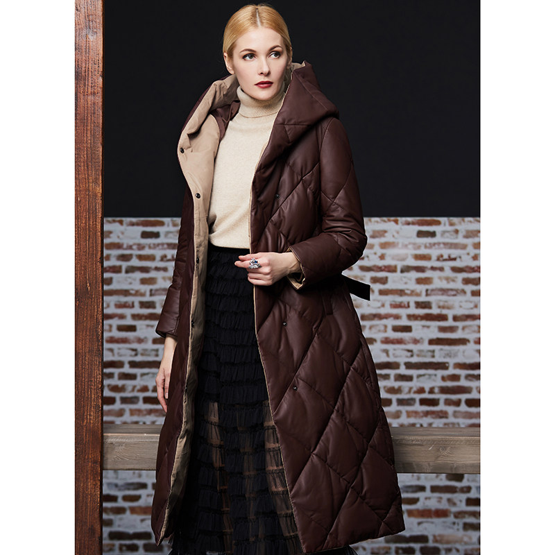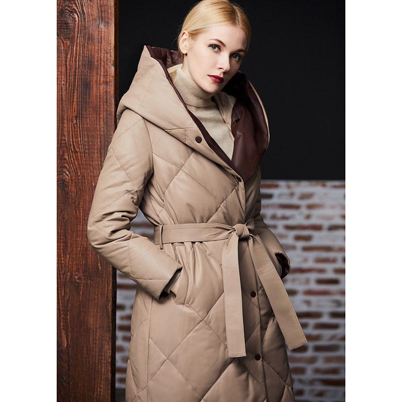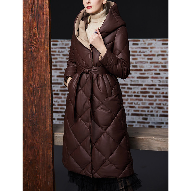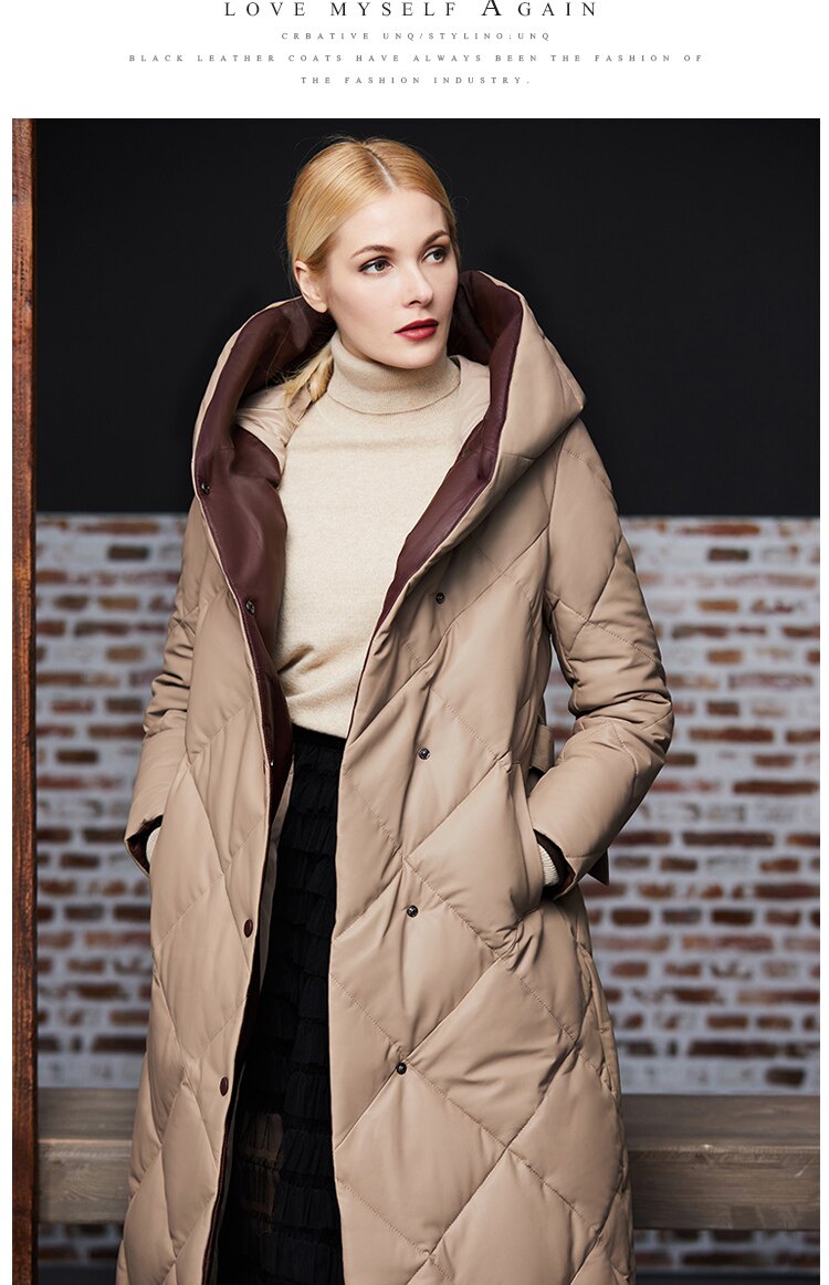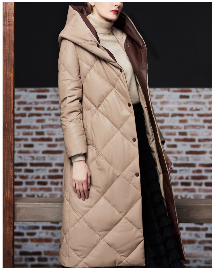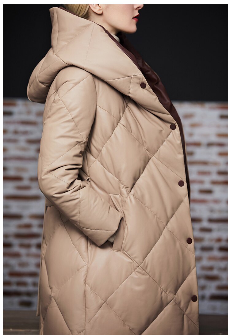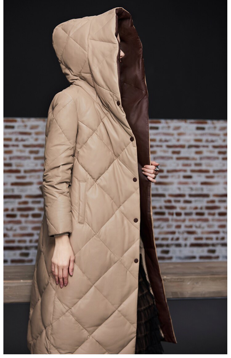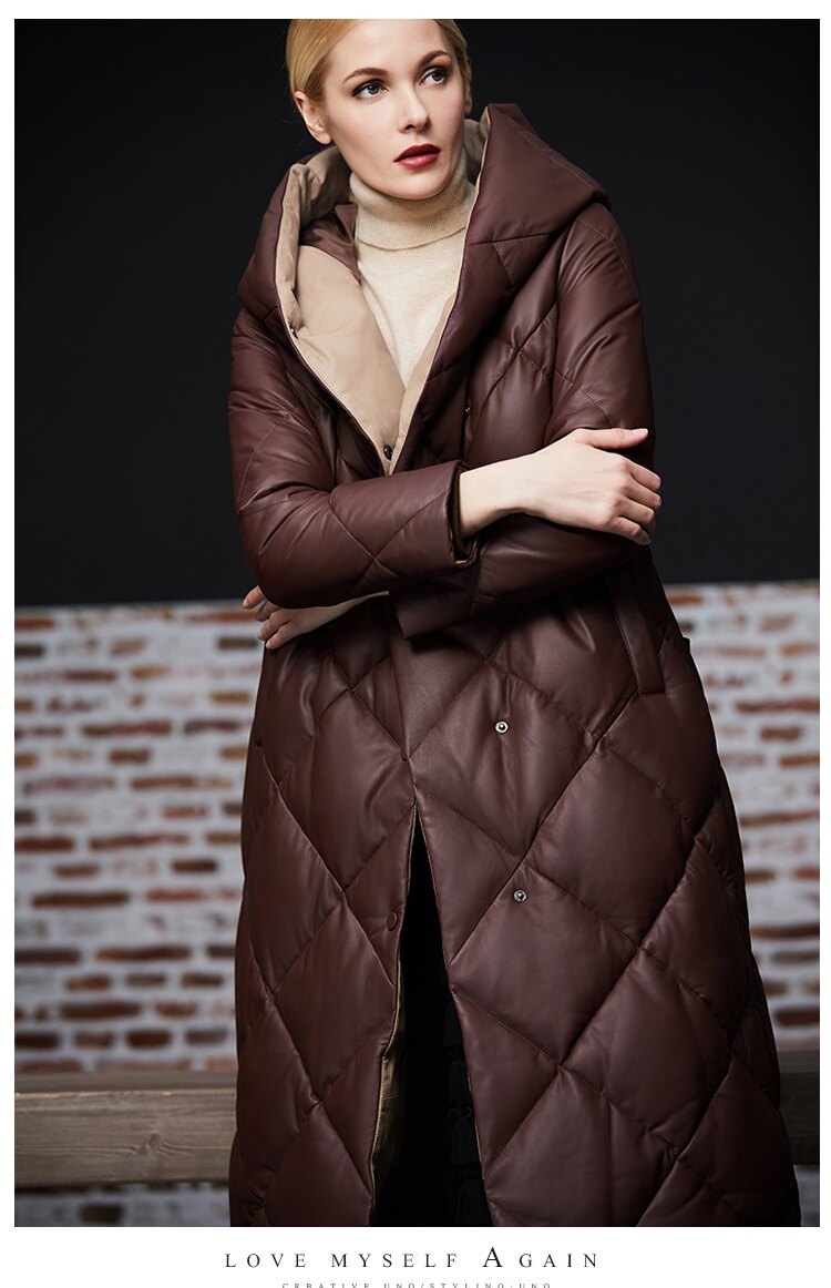 Длинный утепленный пуховик, европейский стиль, длина макси, из натуральной кожи