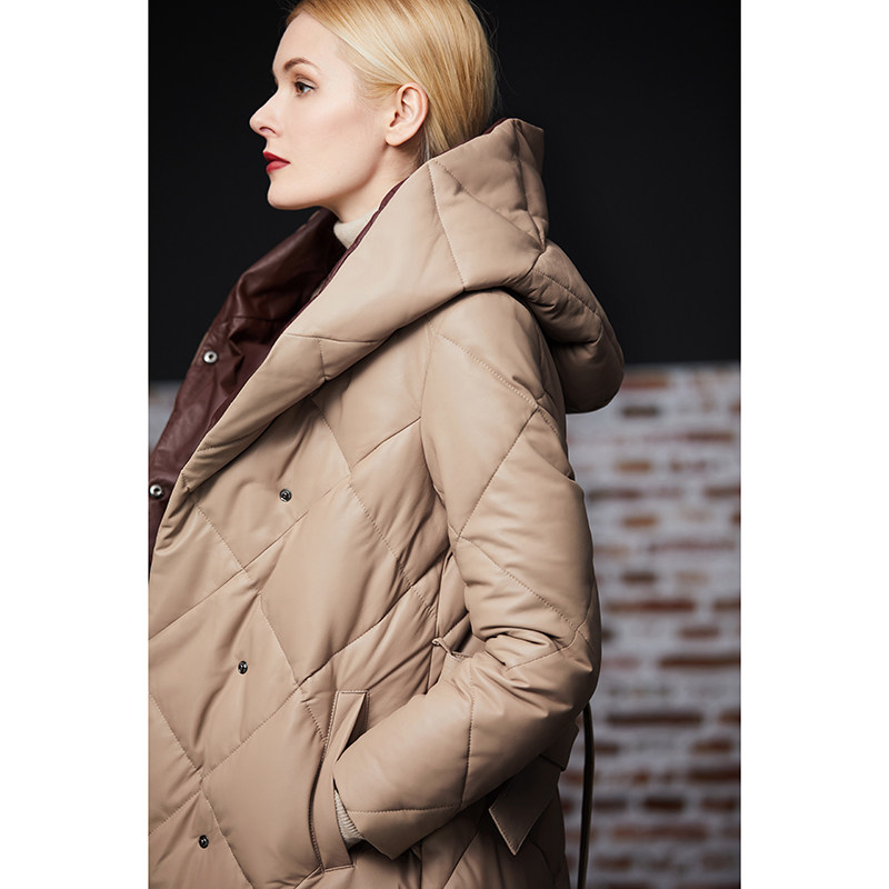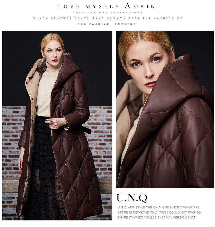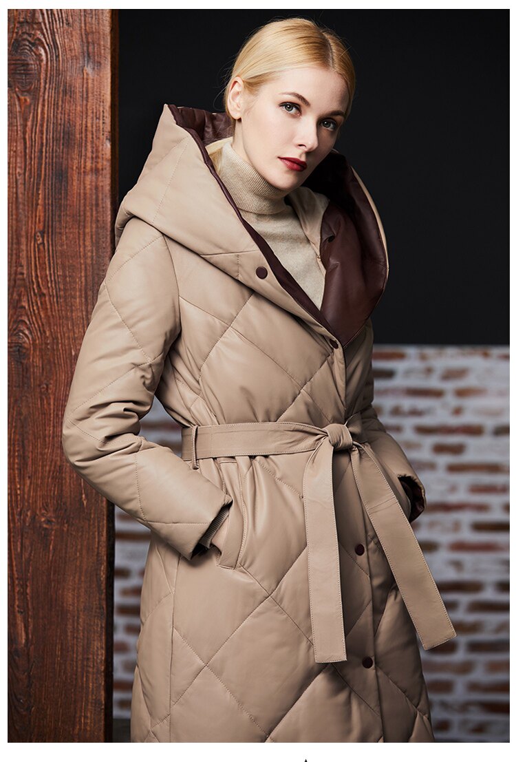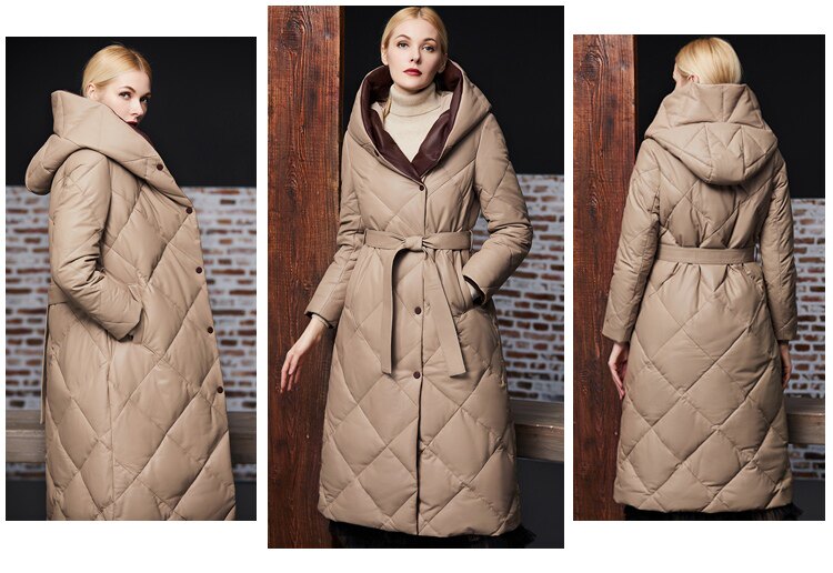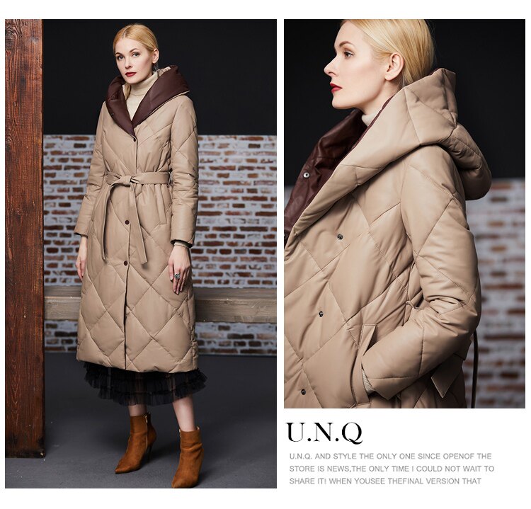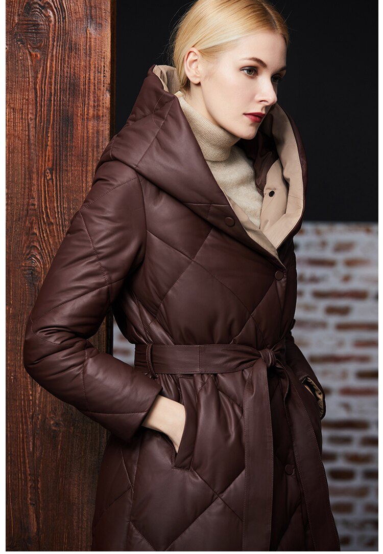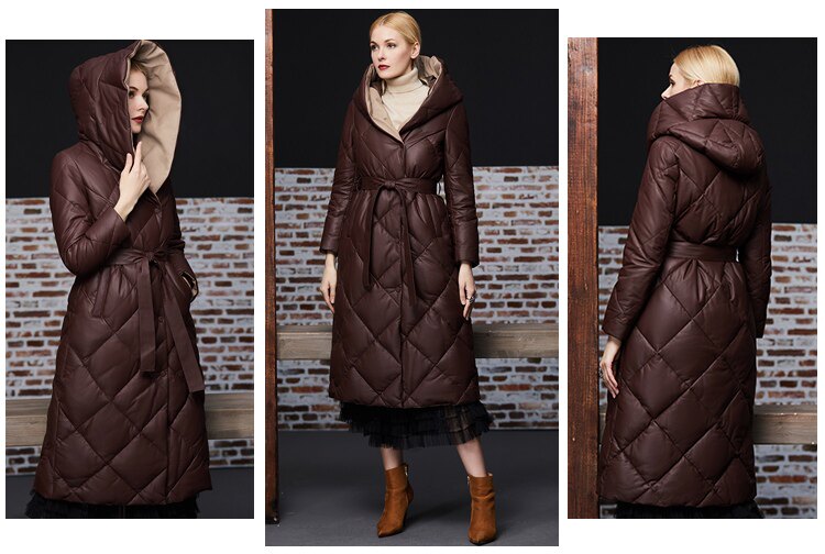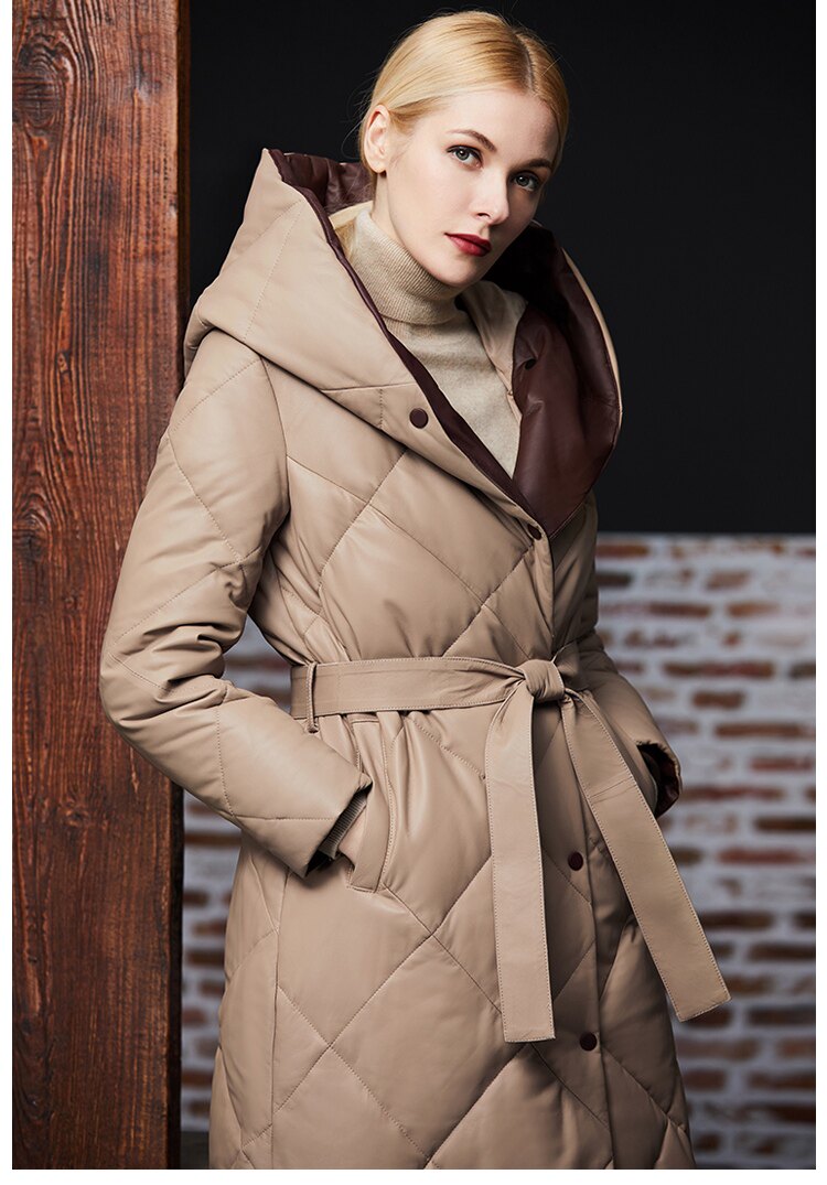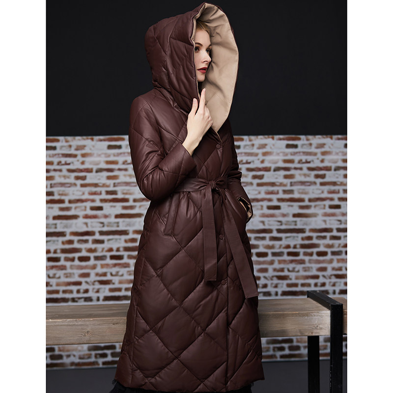 Длинный утепленный пуховик, европейский стиль, длина макси, из натуральной кожи