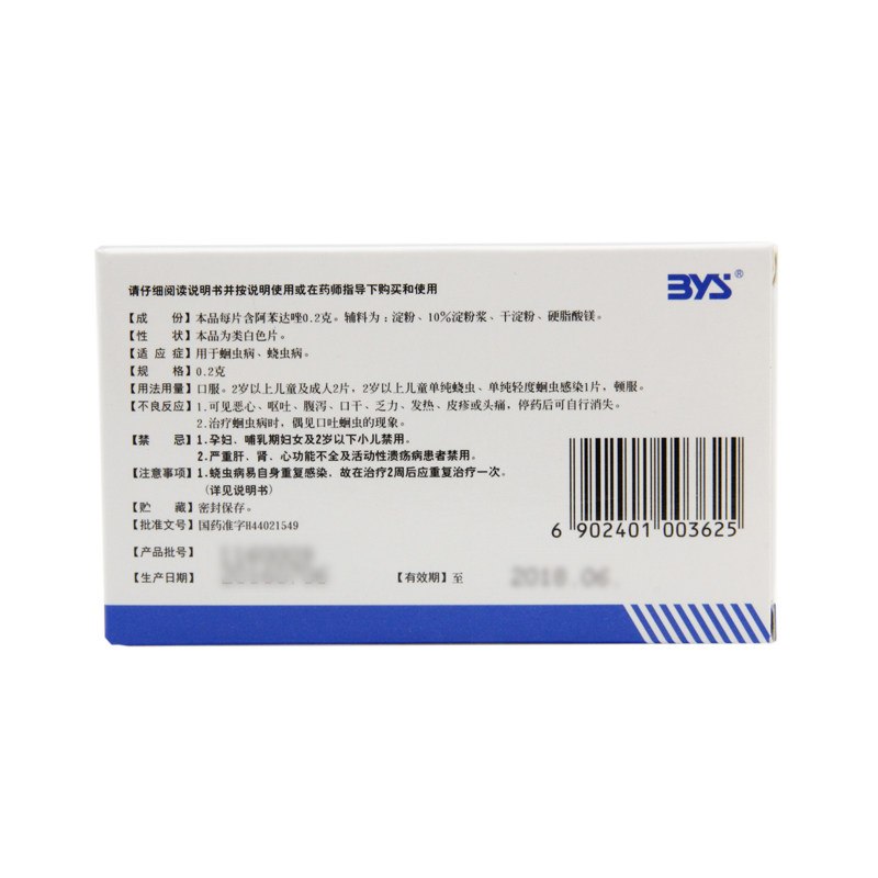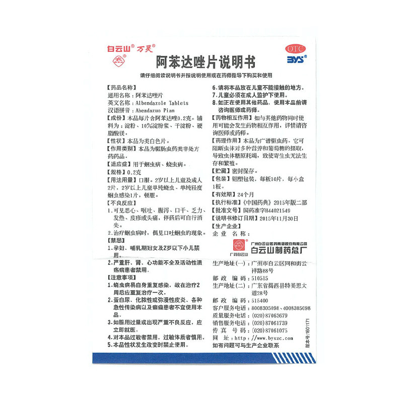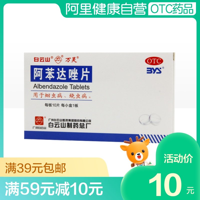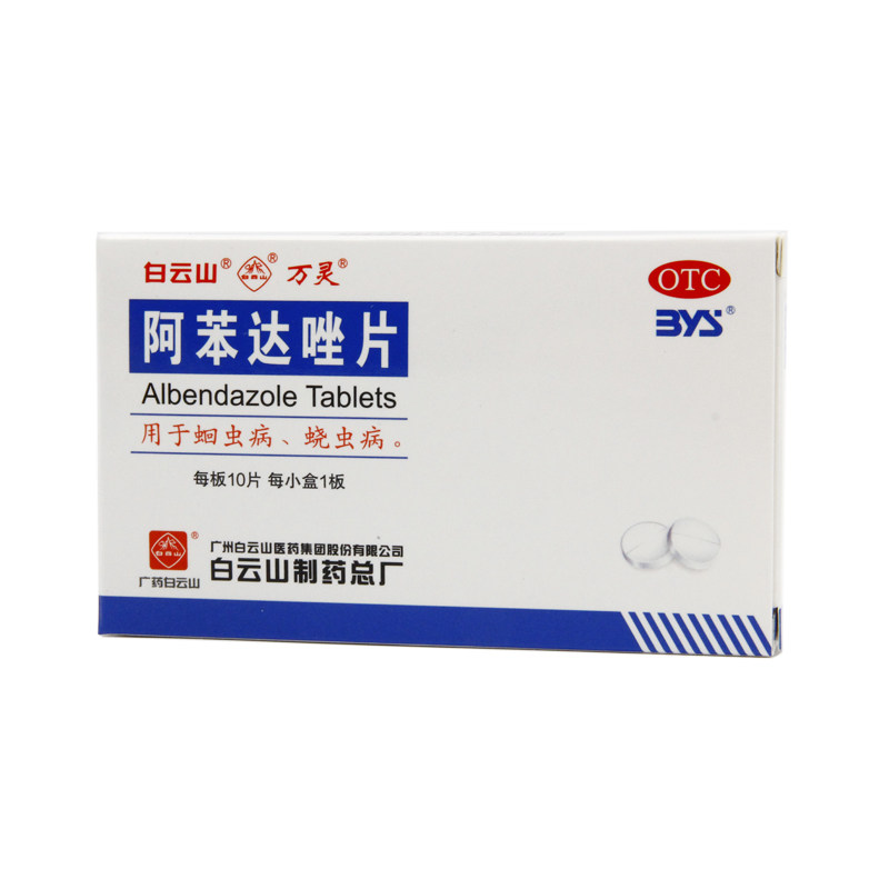 白云山 Таблетки Альбендазола 0,2 г * 10 таблеток/коробка, дегельминтизация аскаридоза, молярные, специальные оральные паразиты
