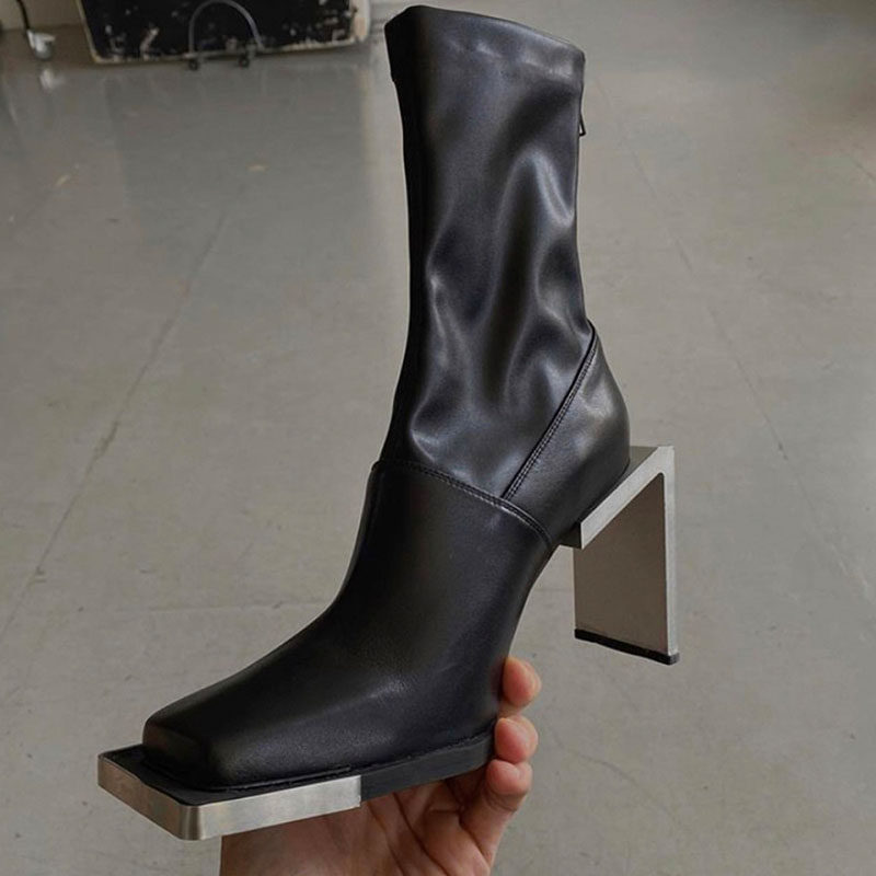 Эластичные короткие сапоги, металлические высокие ботинки, европейский стиль, коллекция 2021, из натуральной кожи