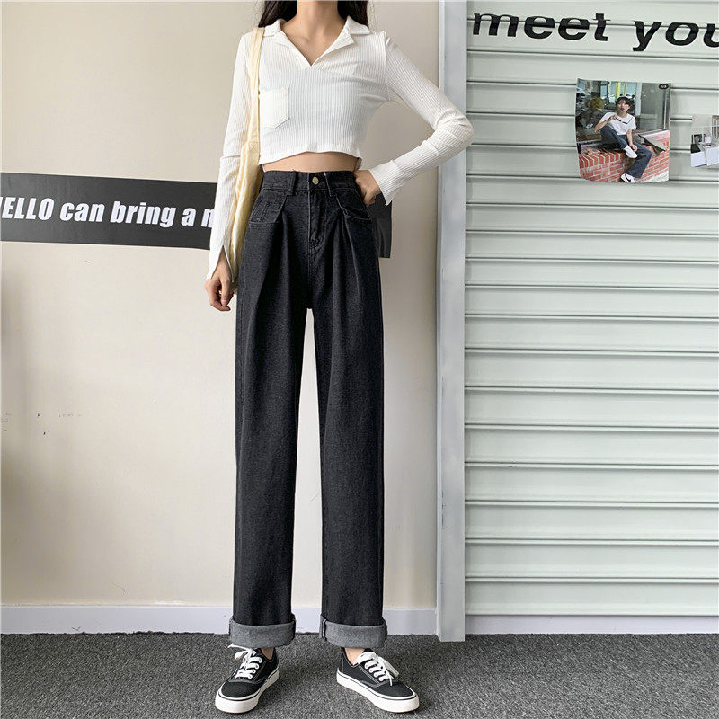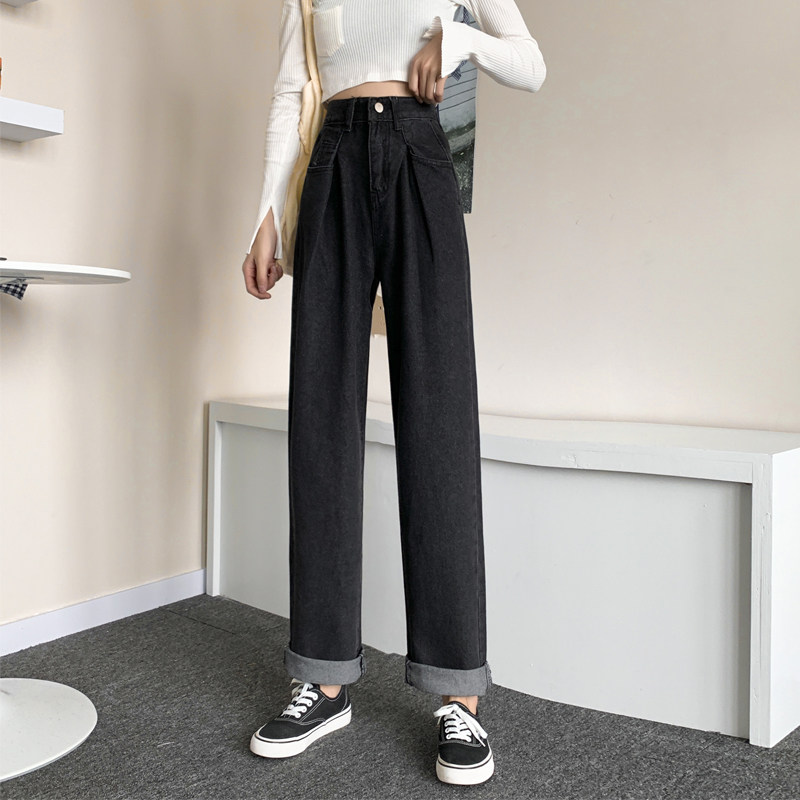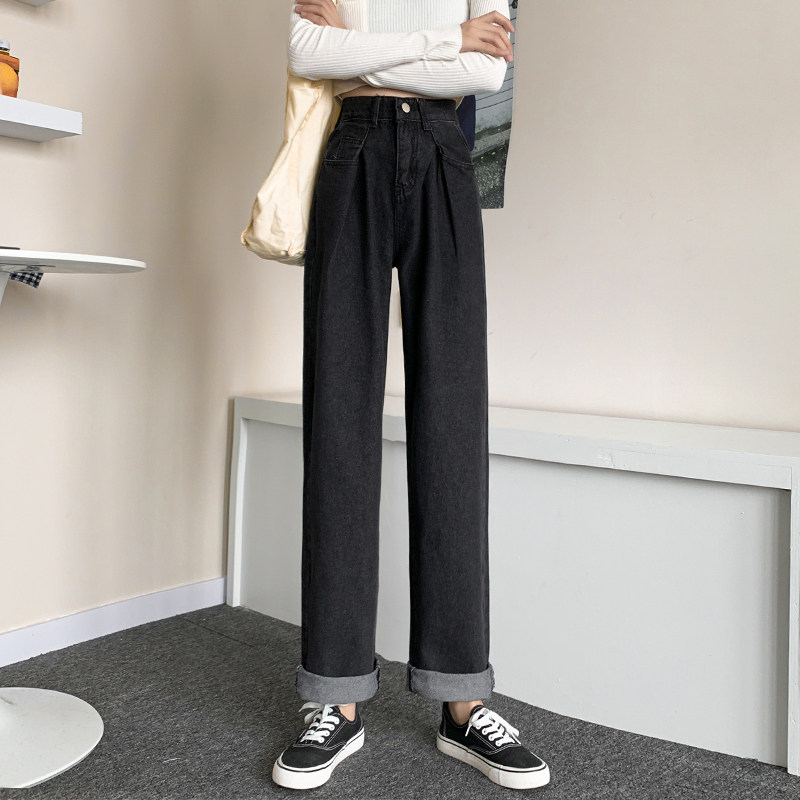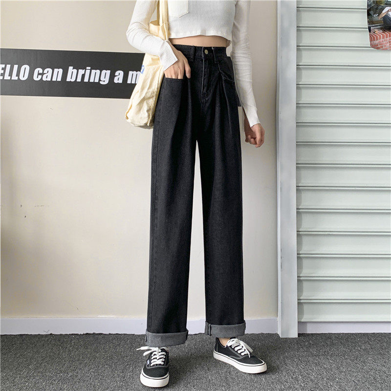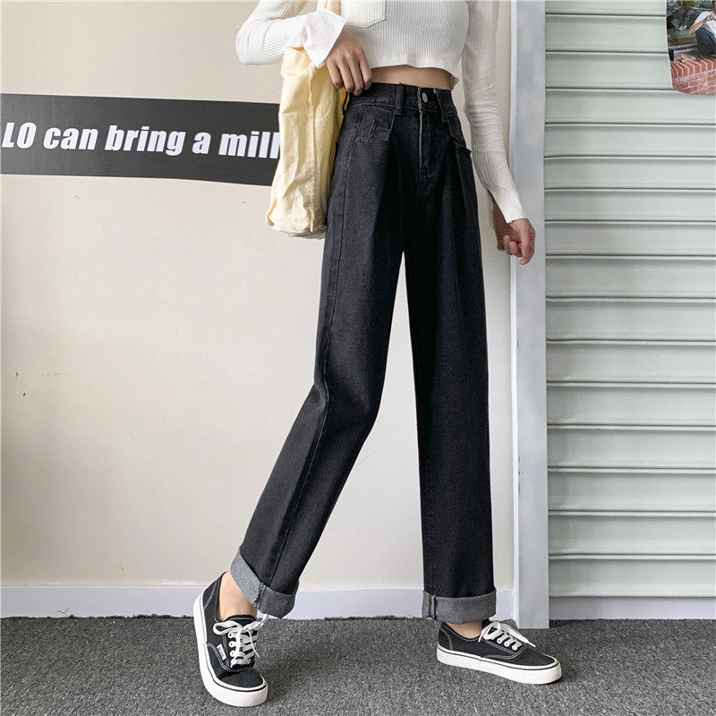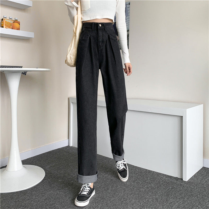 Осенние черные джинсы, штаны, свободный прямой крой, высокая талия, большой размер