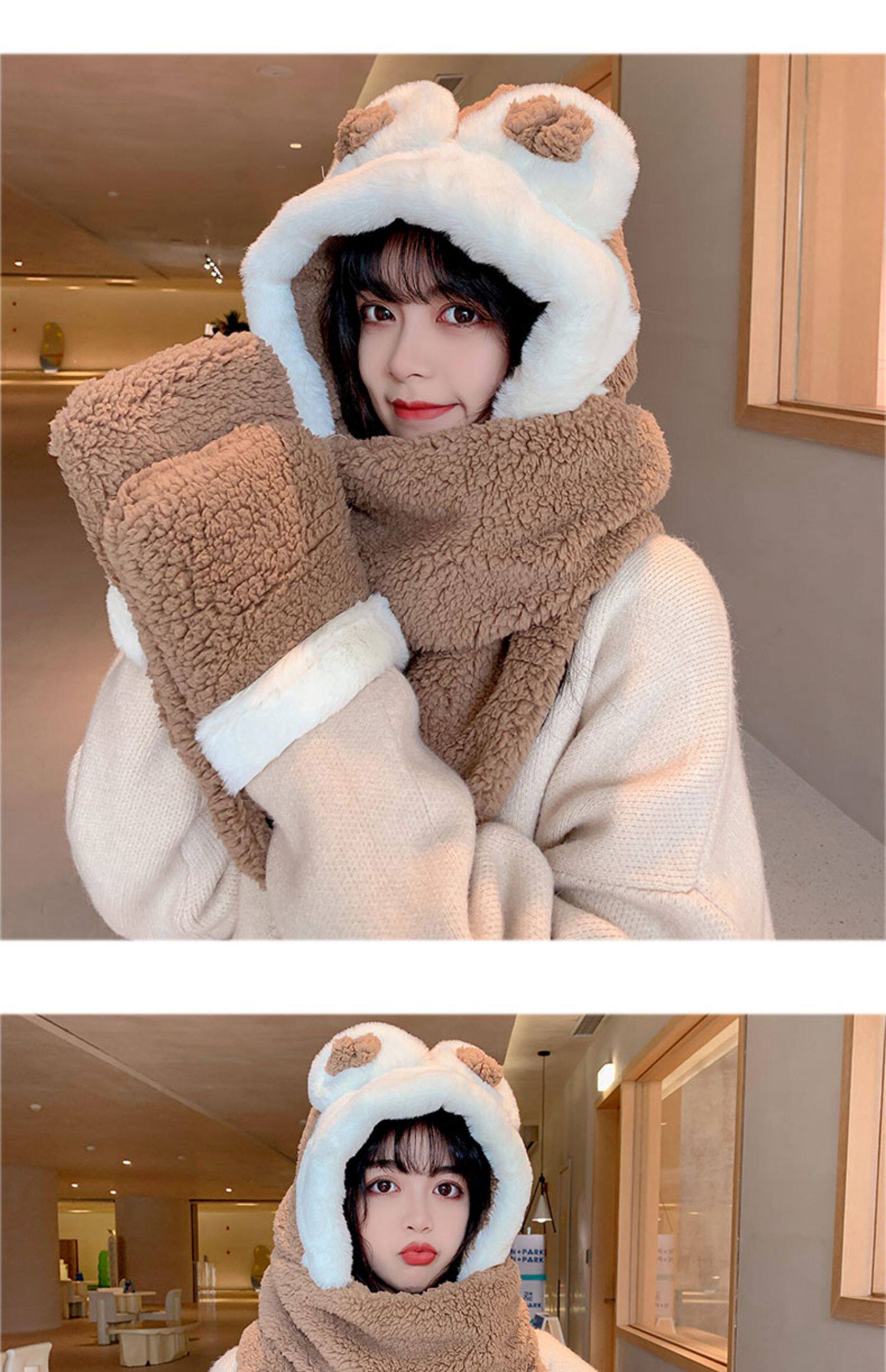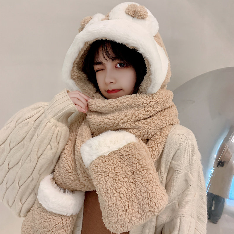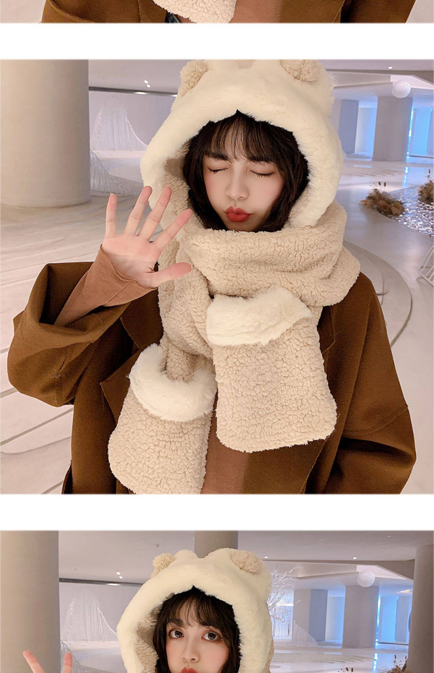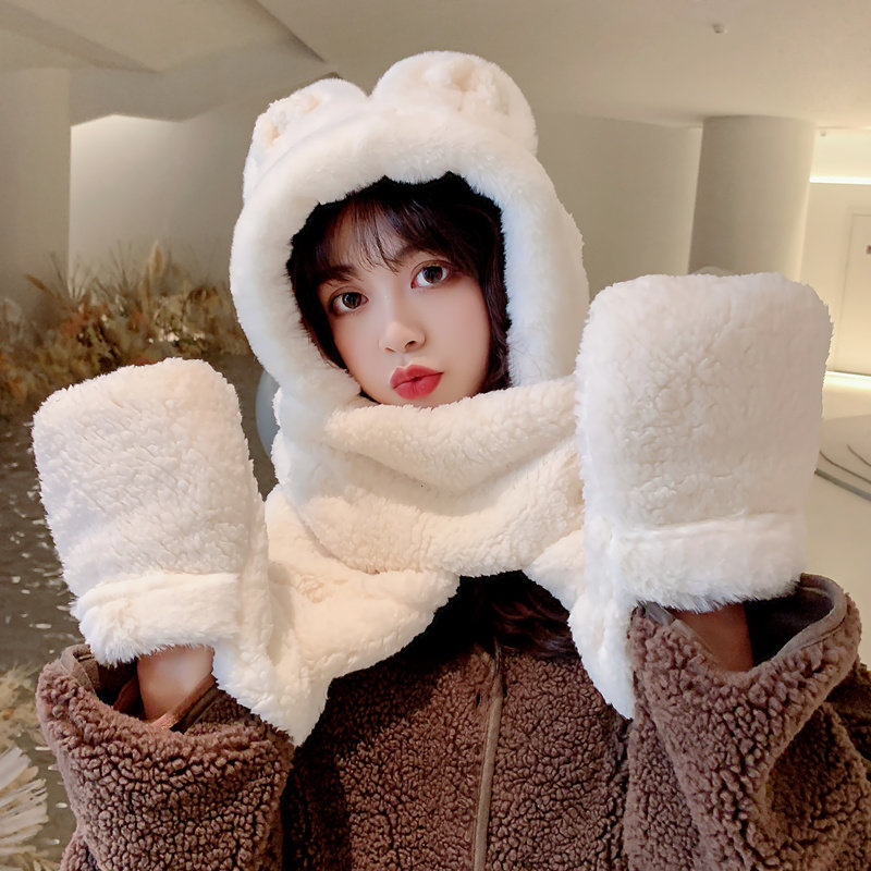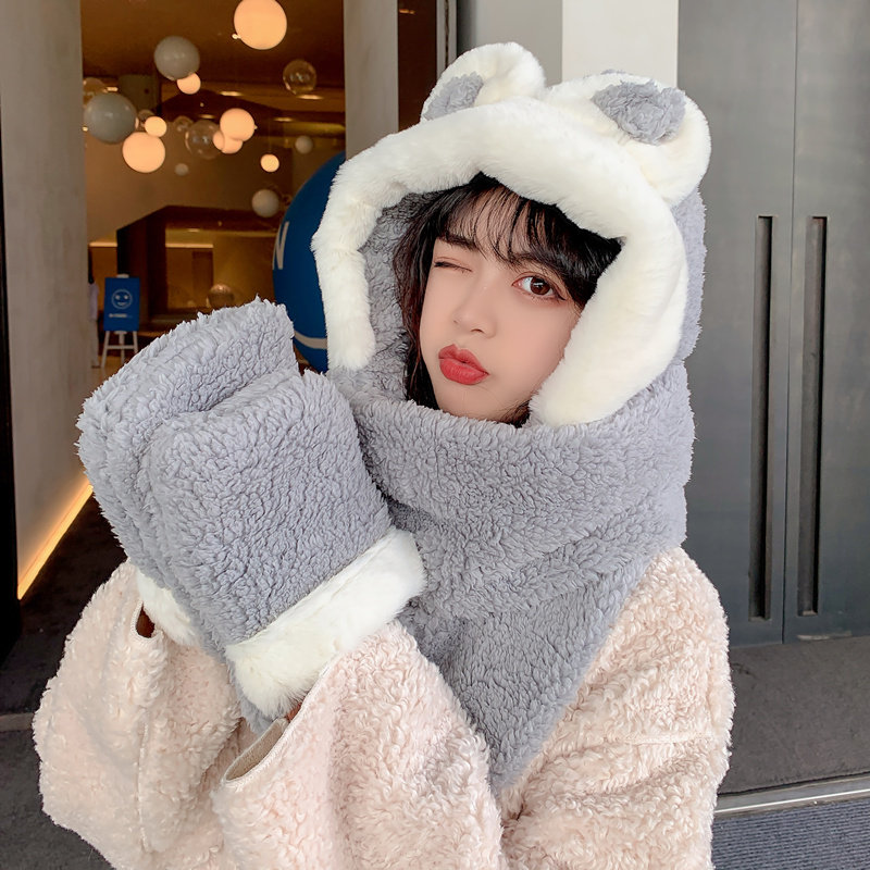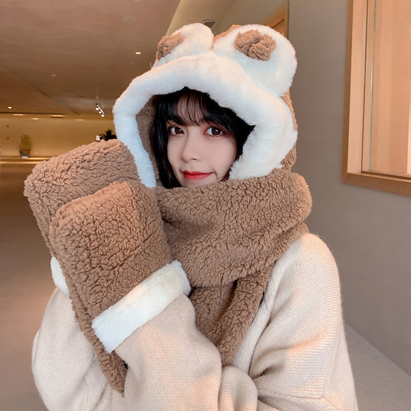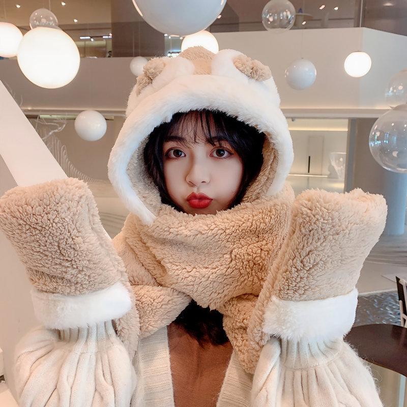 Демисезонная шапка, универсальный бархатный милый шарф, удерживающие тепло перчатки для школьников и студентов, комплект, в корейском стиле, 3 предмета