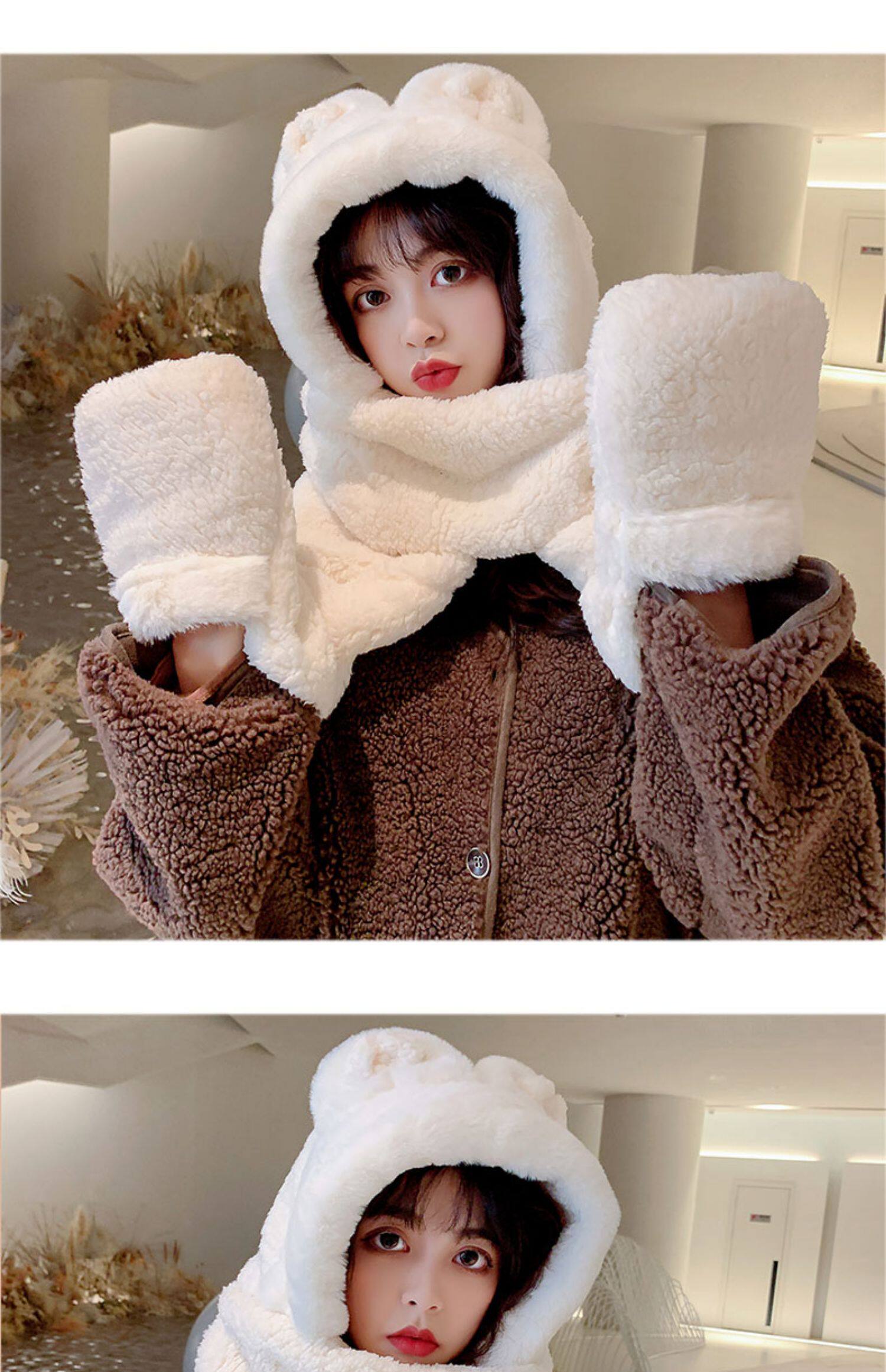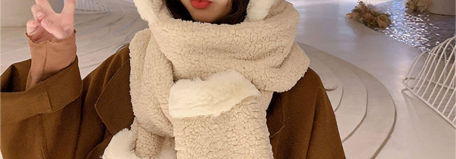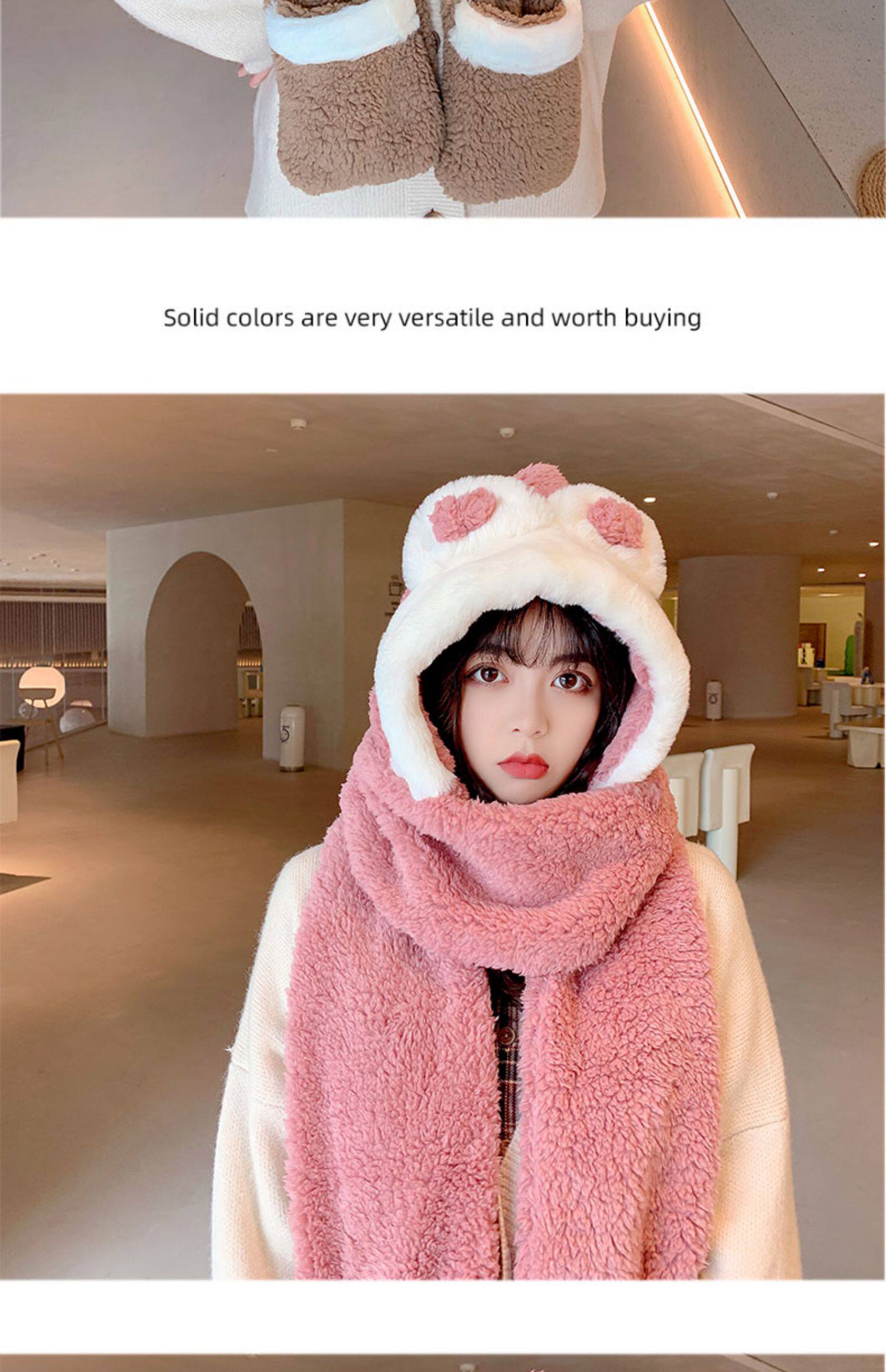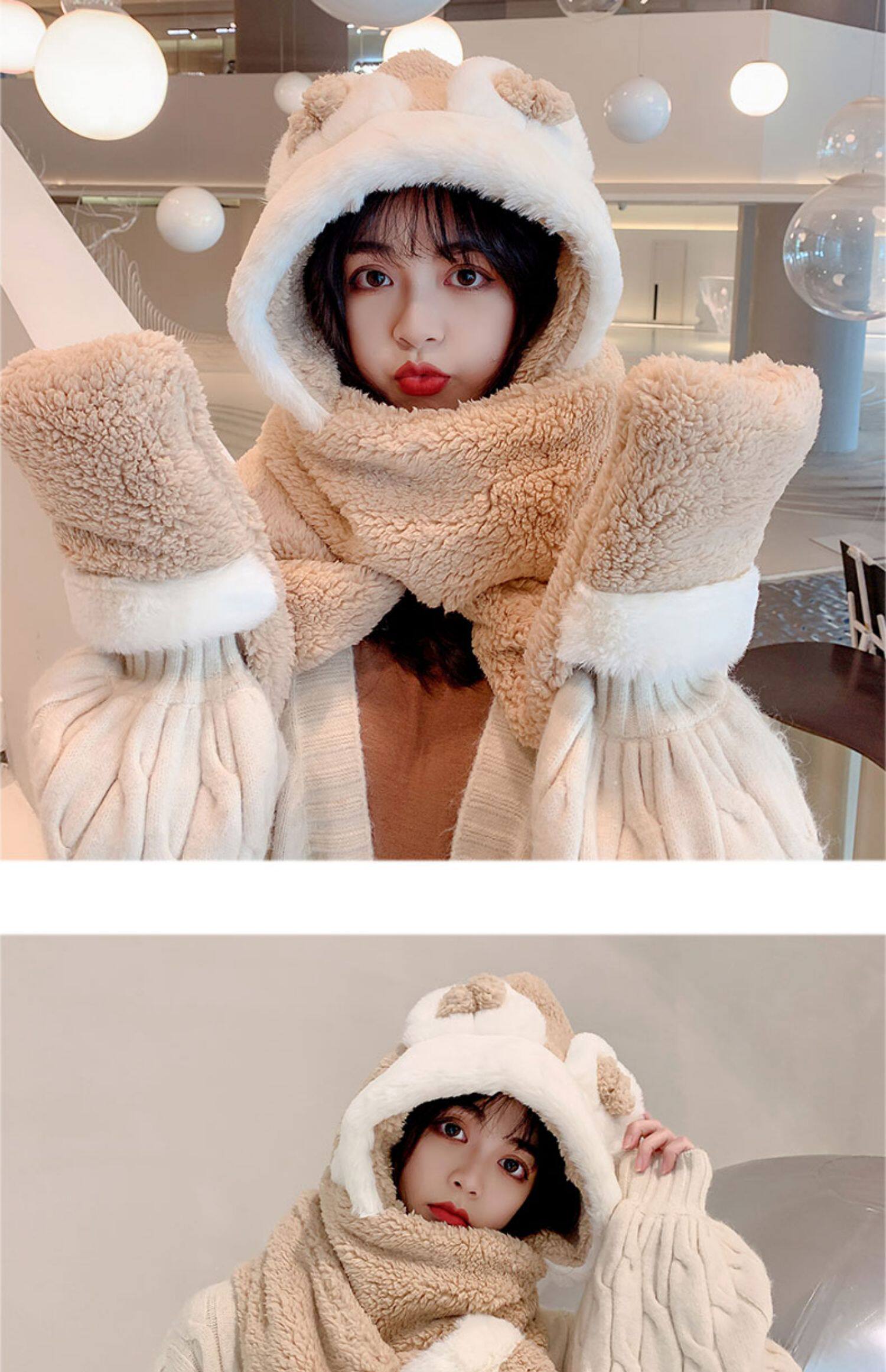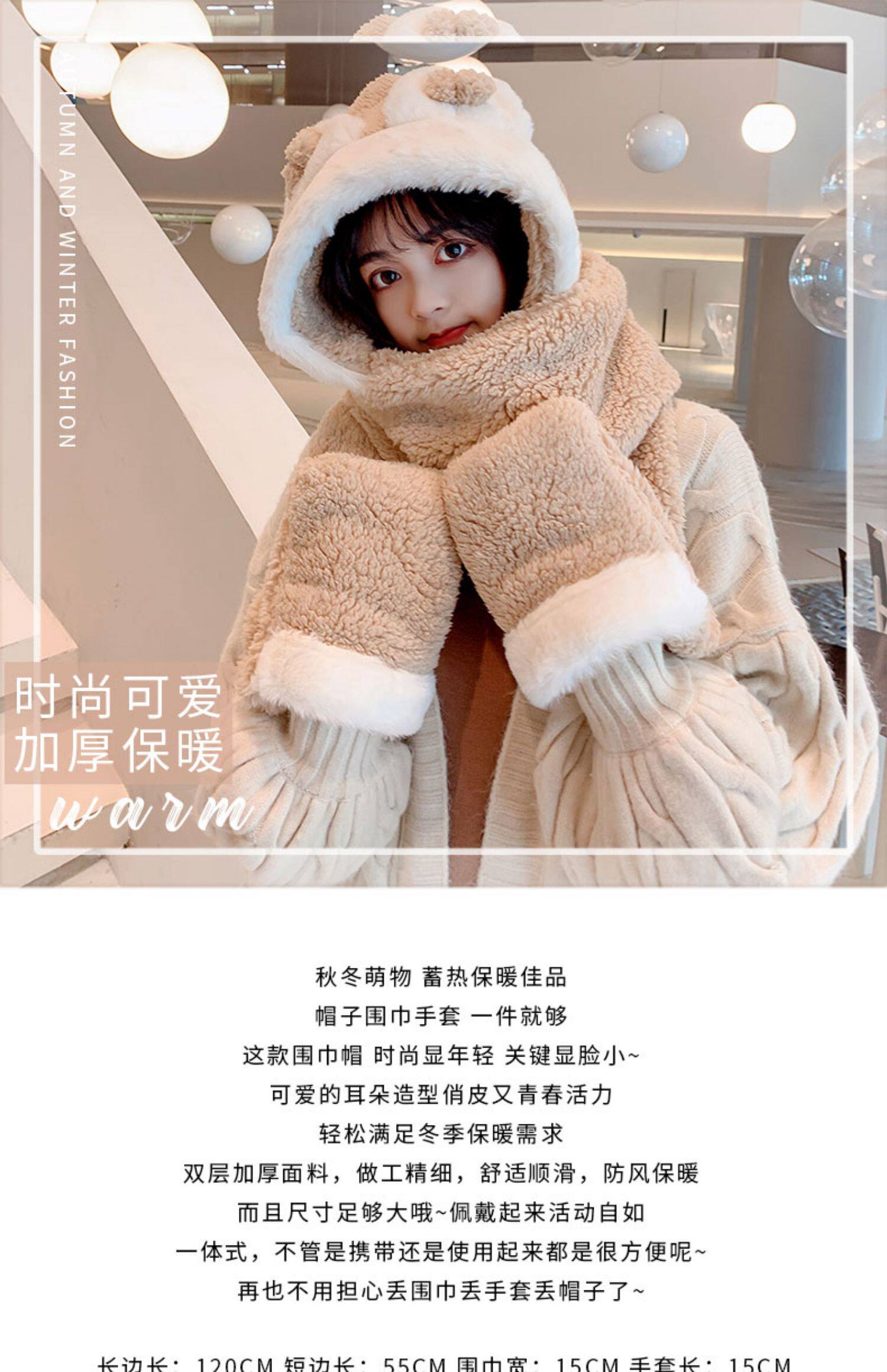 Демисезонная шапка, универсальный бархатный милый шарф, удерживающие тепло перчатки для школьников и студентов, комплект, в корейском стиле, 3 предмета