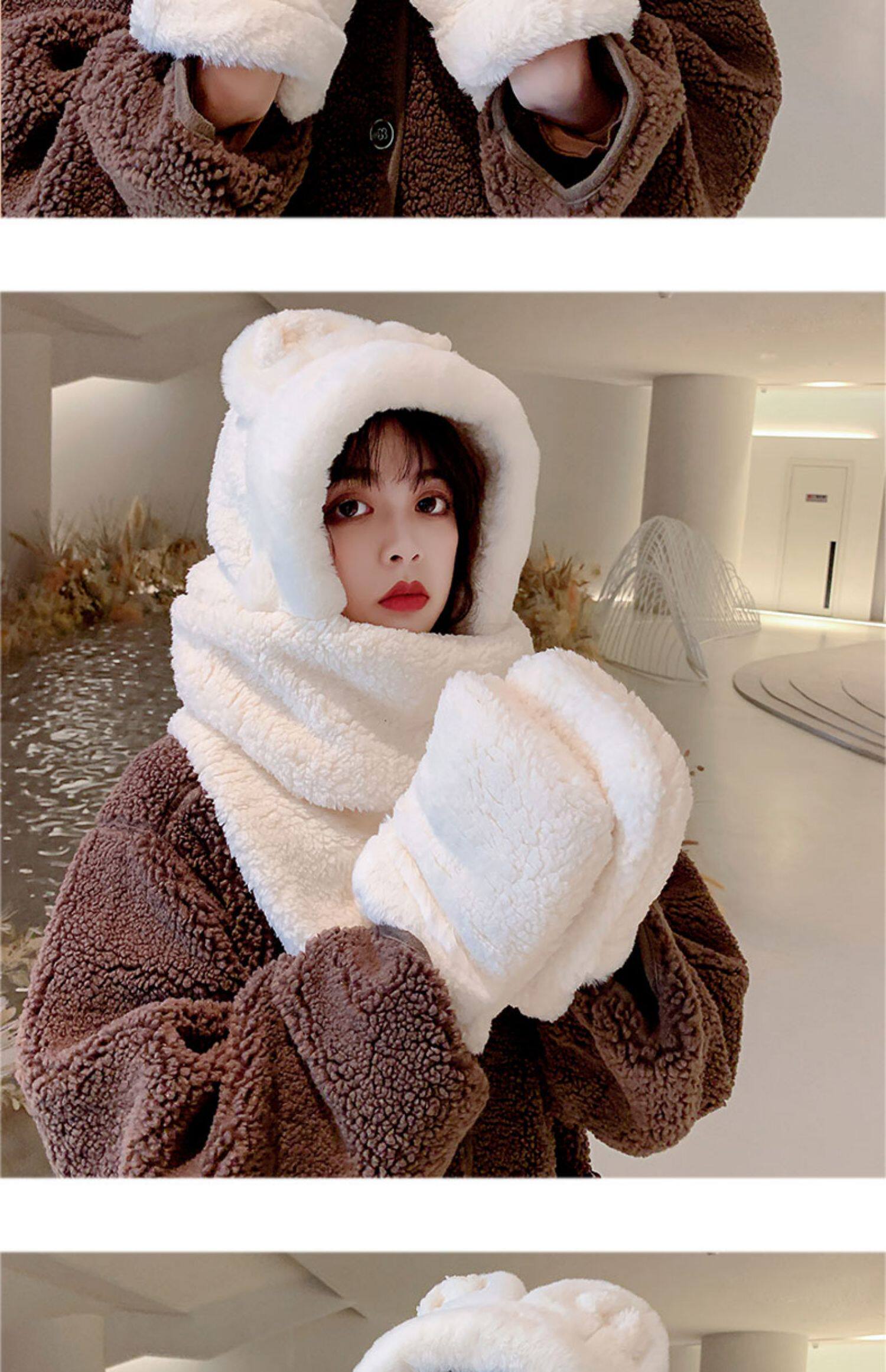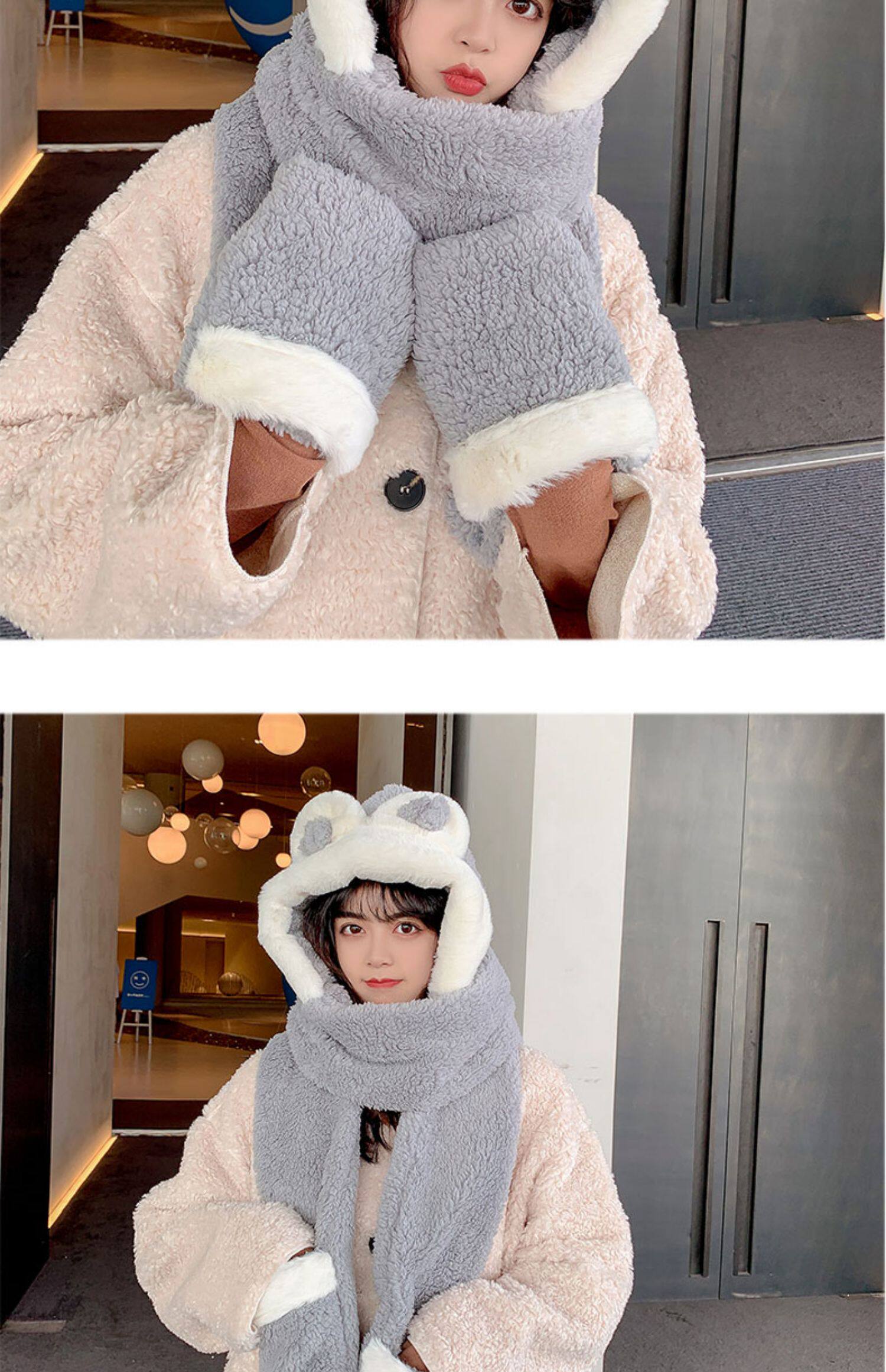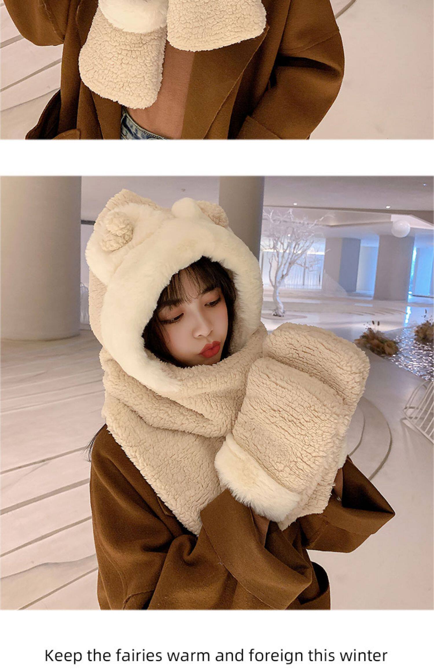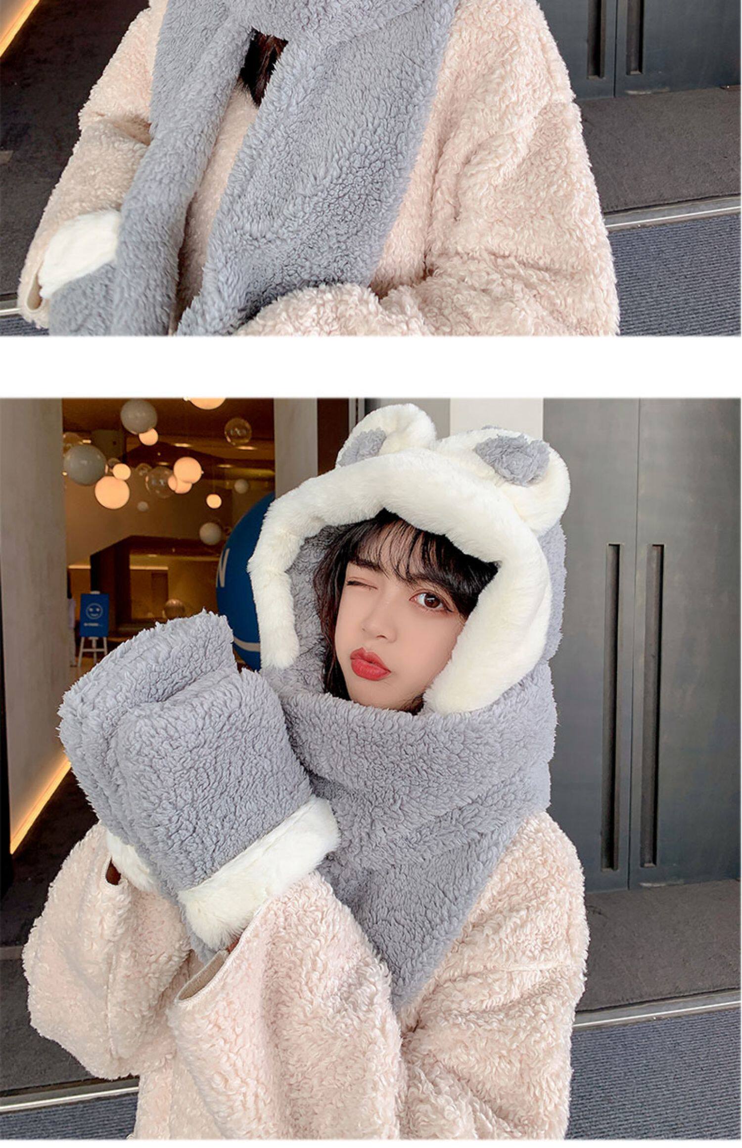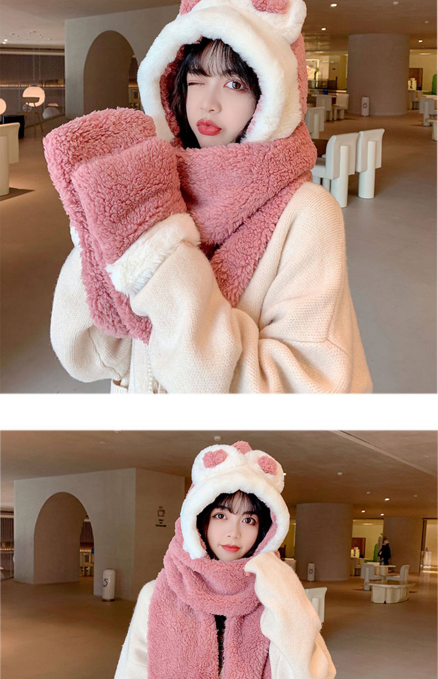 Демисезонная шапка, универсальный бархатный милый шарф, удерживающие тепло перчатки для школьников и студентов, комплект, в корейском стиле, 3 предмета