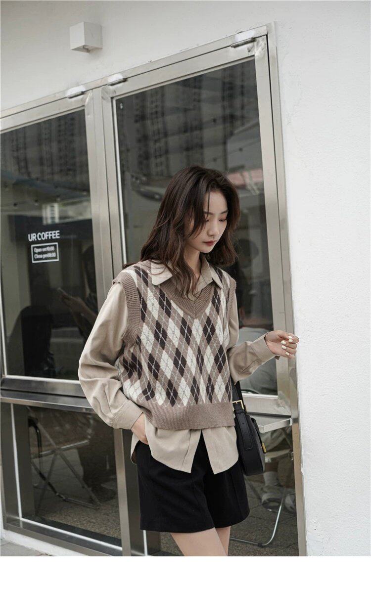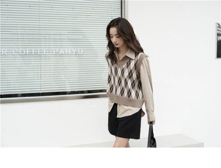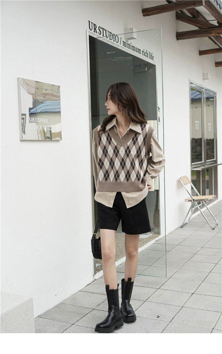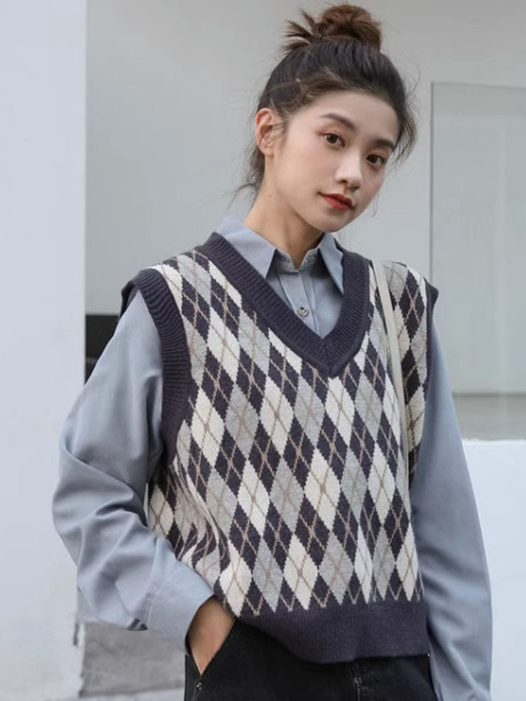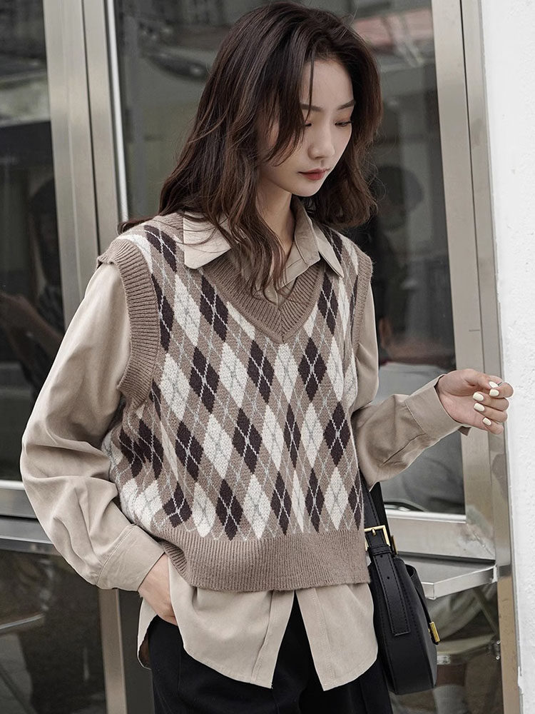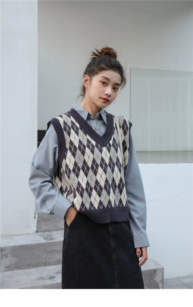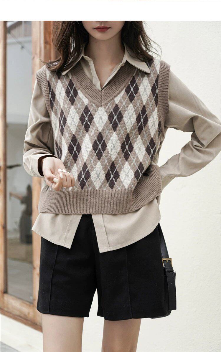 Свитер без рукавов, жилет, ретро трикотажный короткий комплект с ромбовидным узором, куртка, в корейском стиле