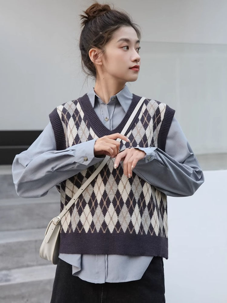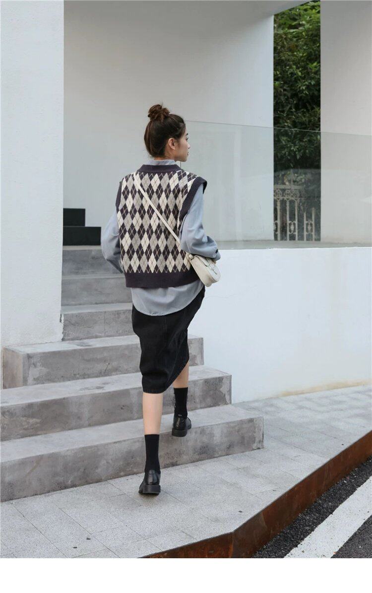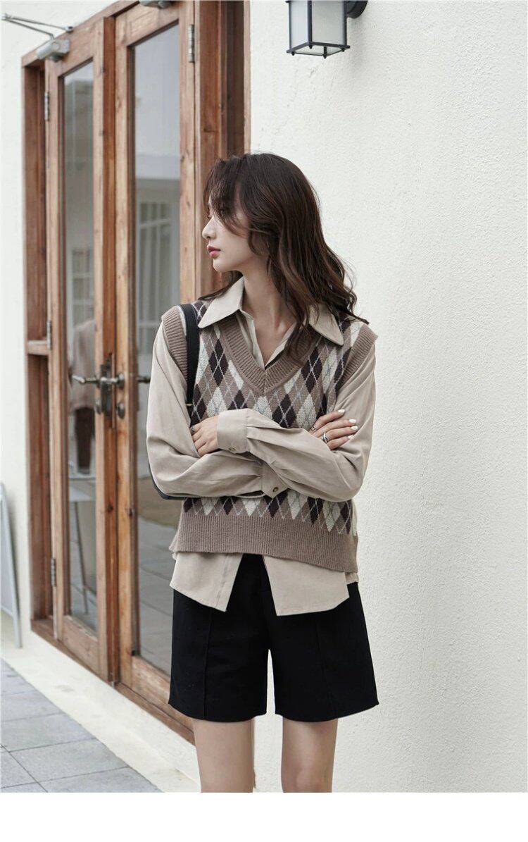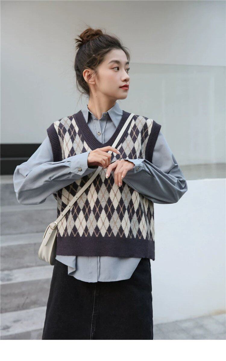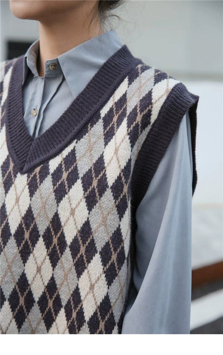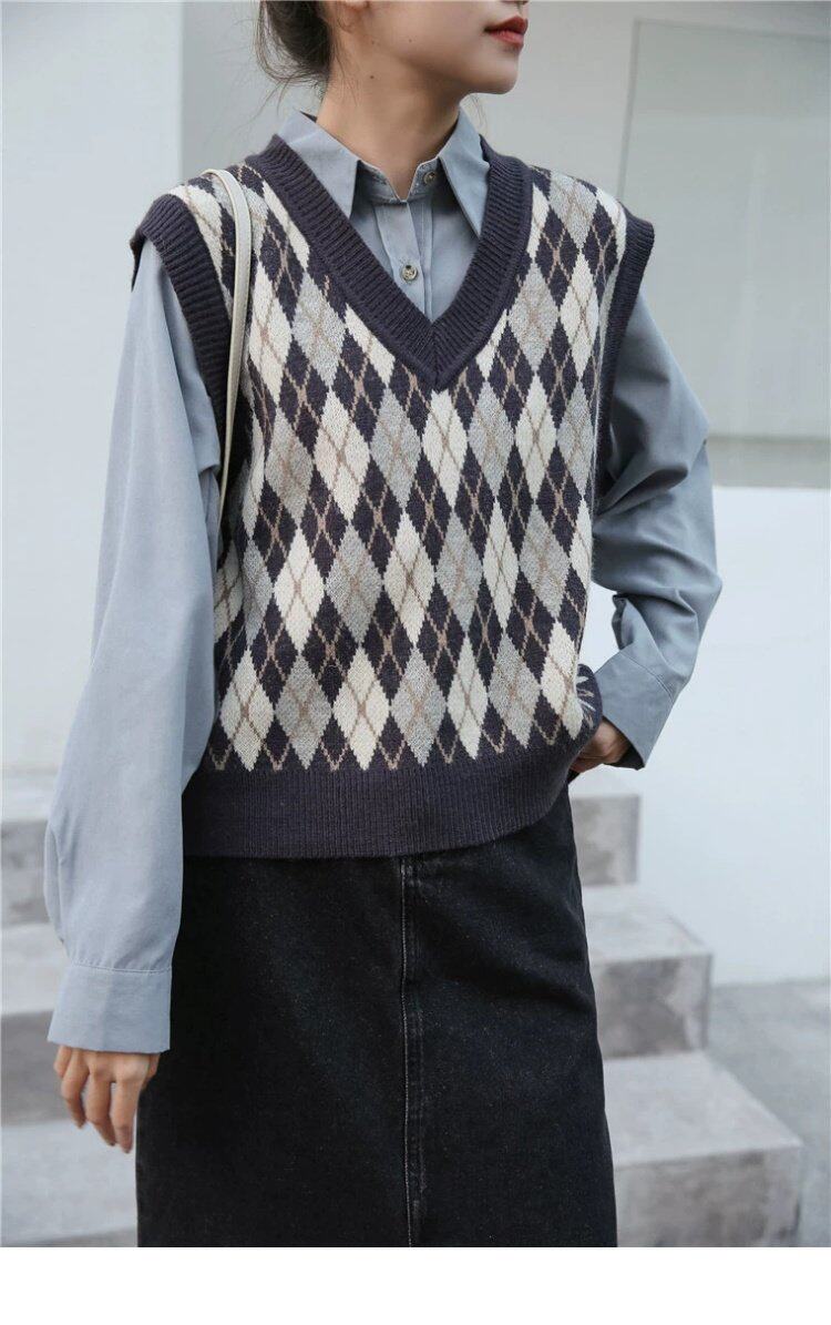 Свитер без рукавов, жилет, ретро трикотажный короткий комплект с ромбовидным узором, куртка, в корейском стиле