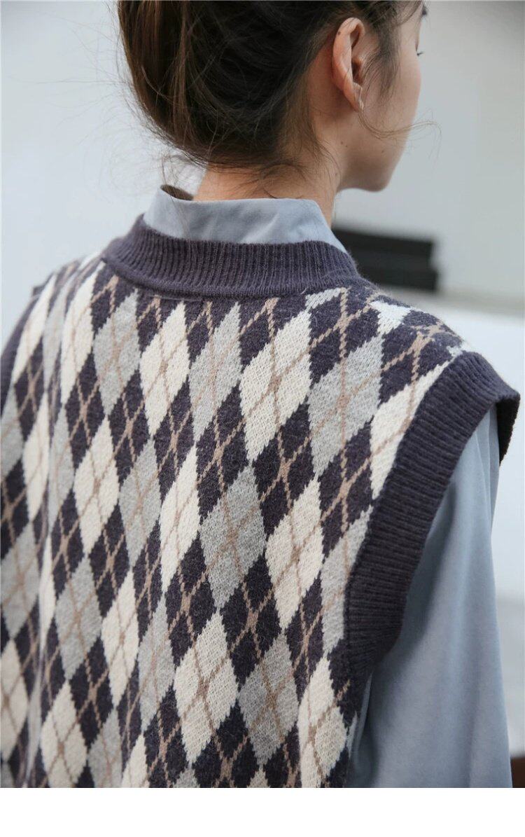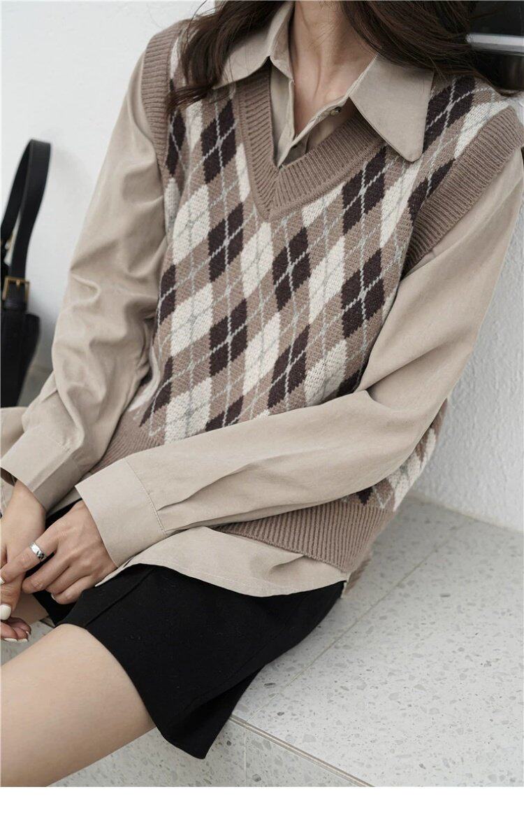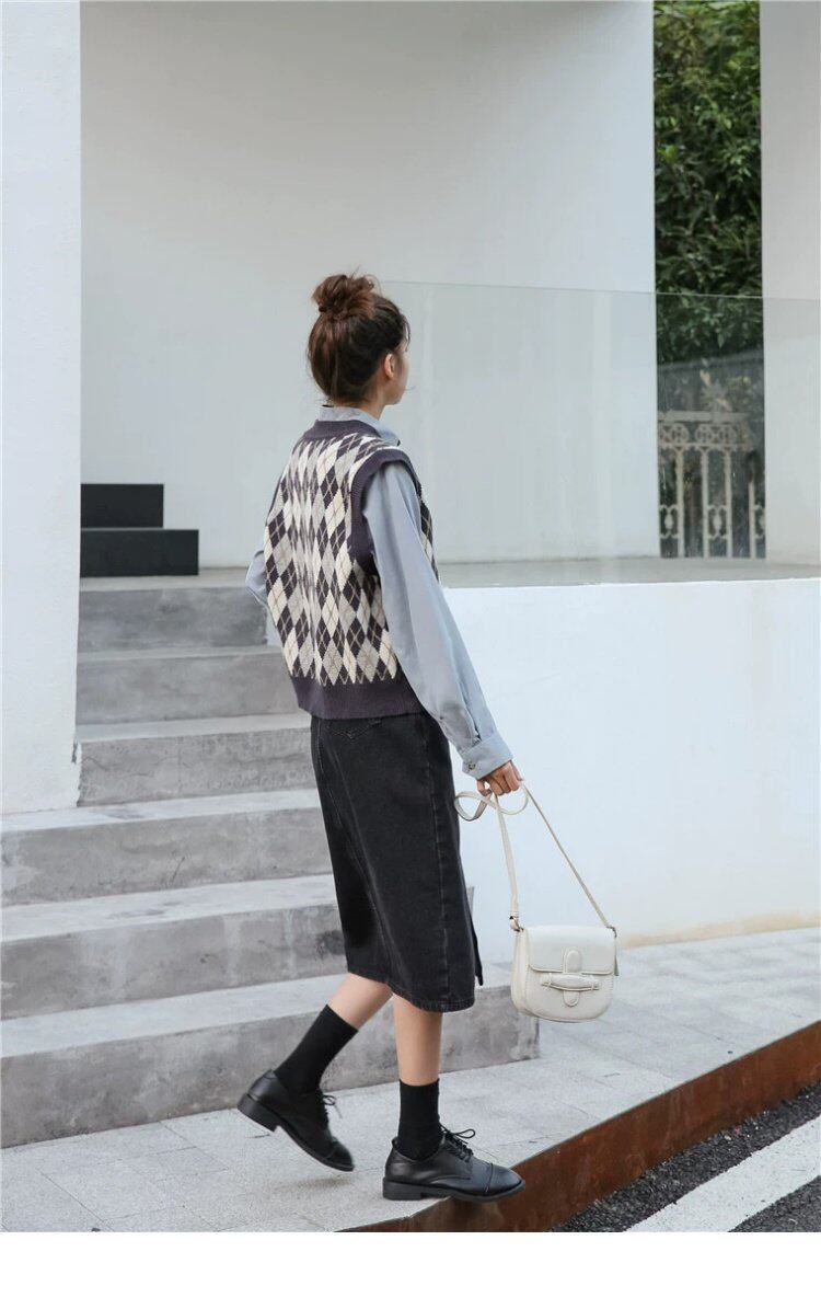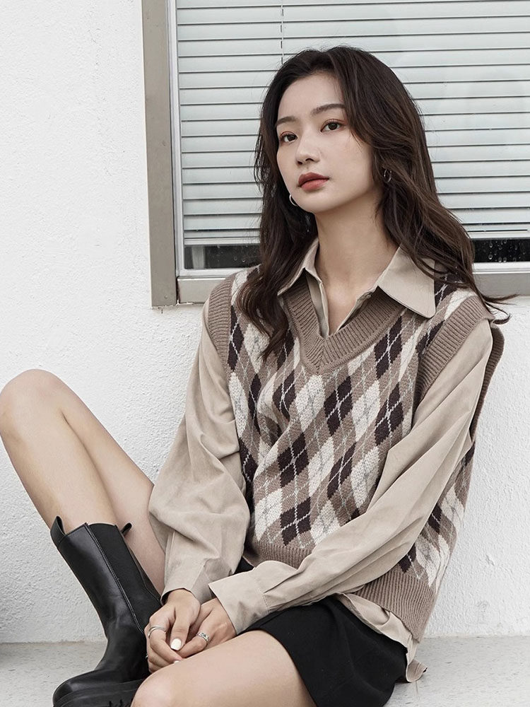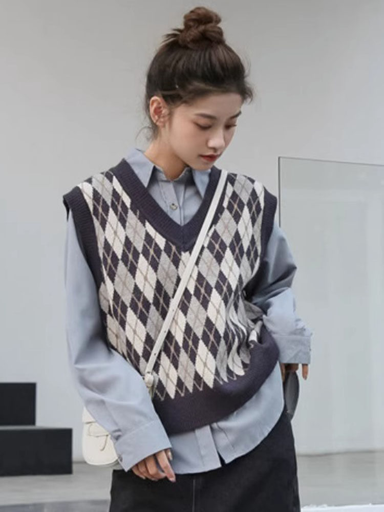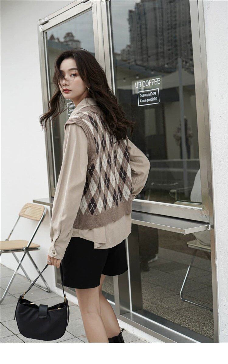Свитер без рукавов, жилет, ретро трикотажный короткий комплект с ромбовидным узором, куртка, в корейском стиле
