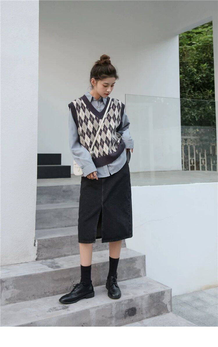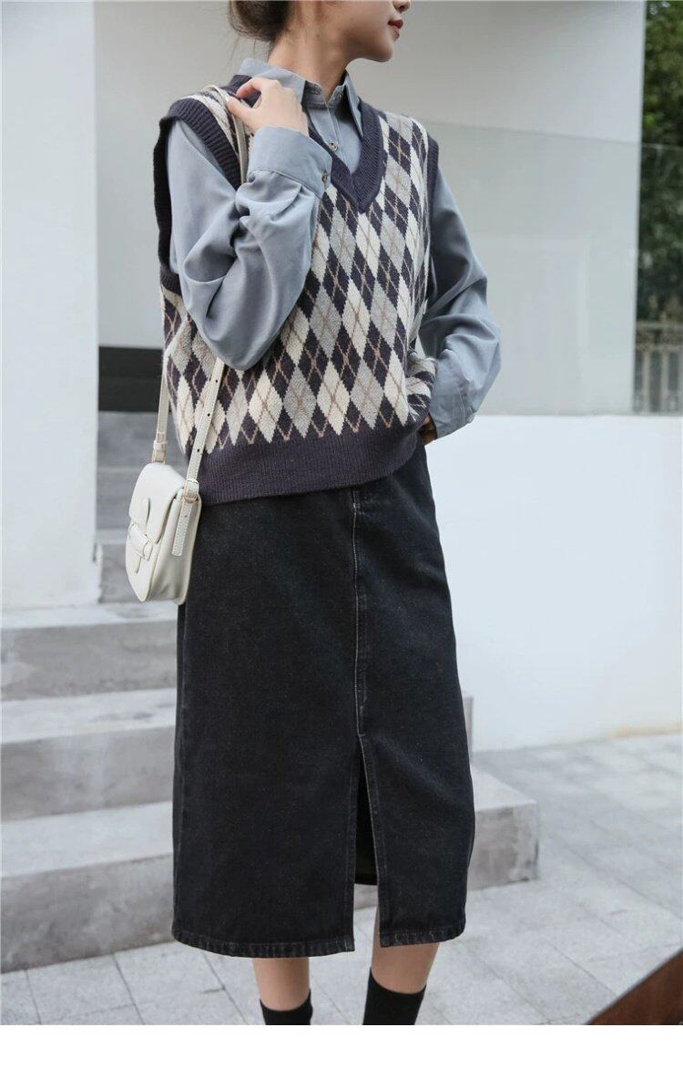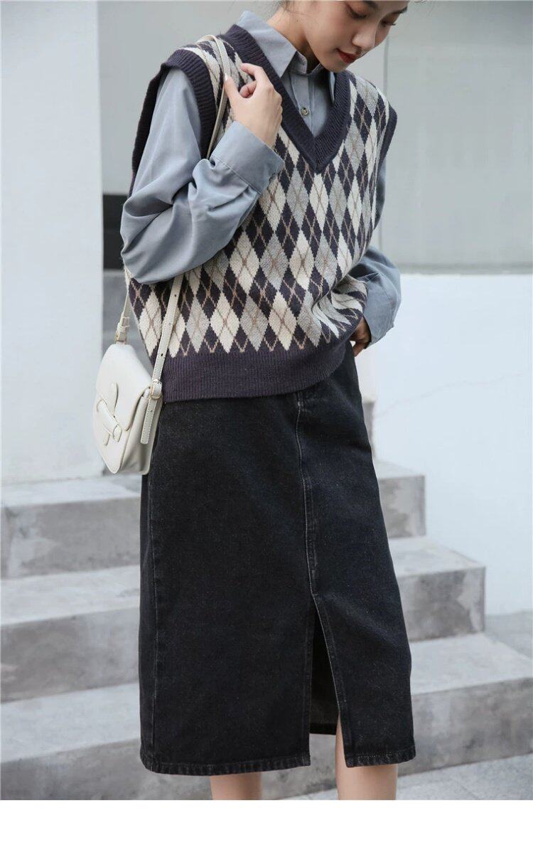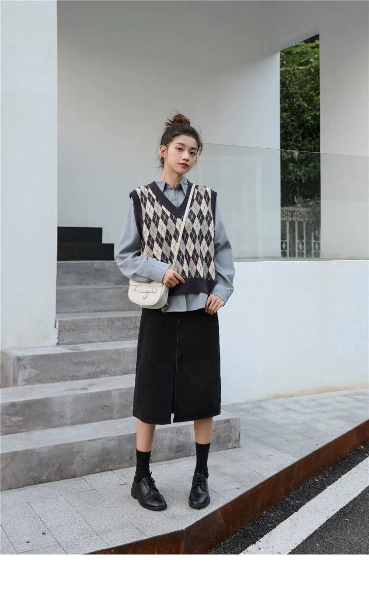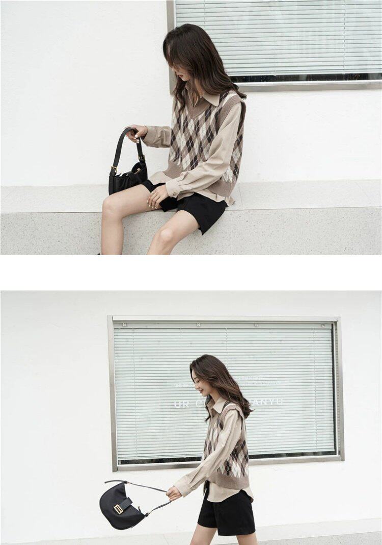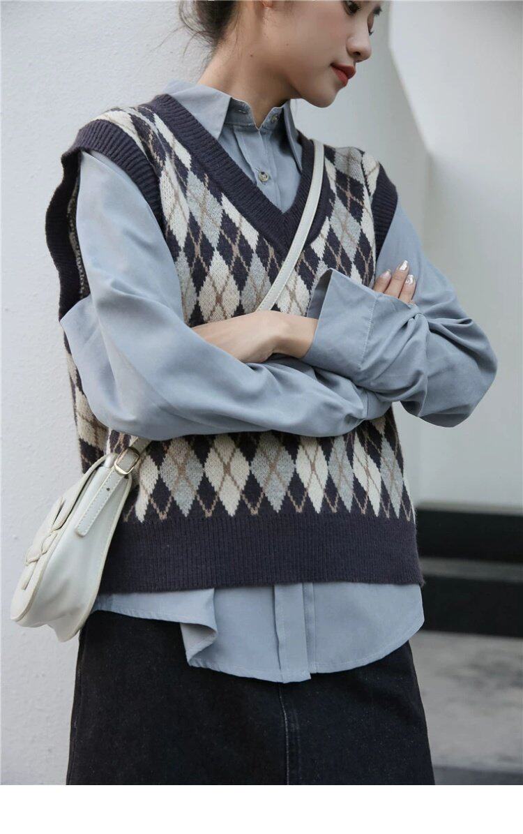 Свитер без рукавов, жилет, ретро трикотажный короткий комплект с ромбовидным узором, куртка, в корейском стиле