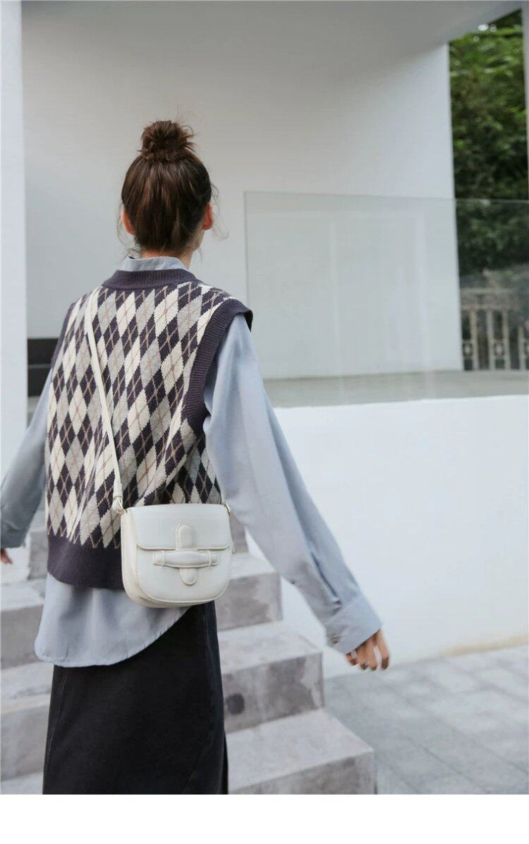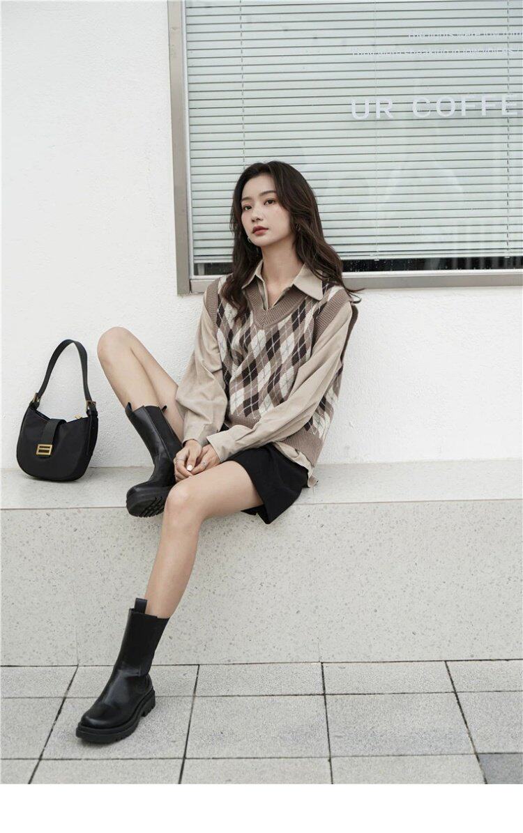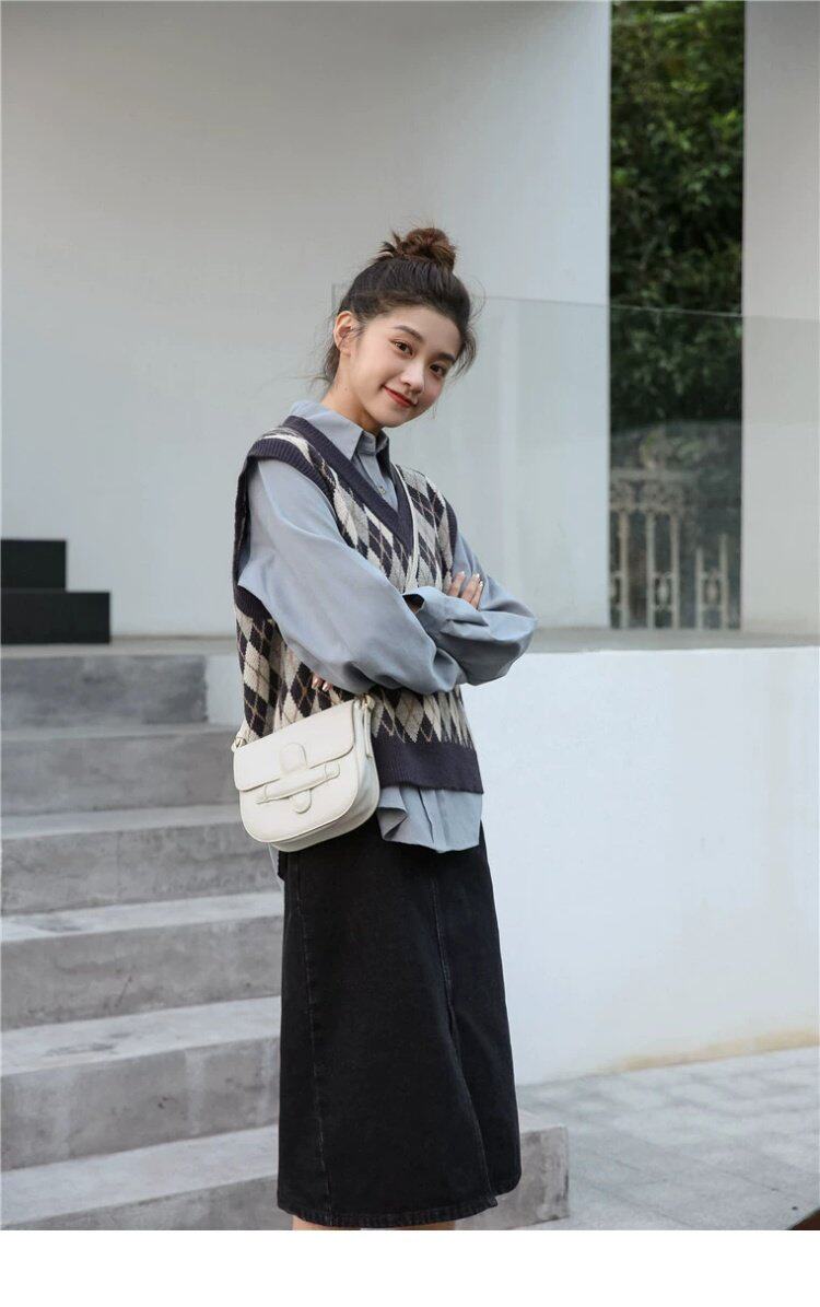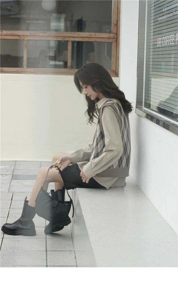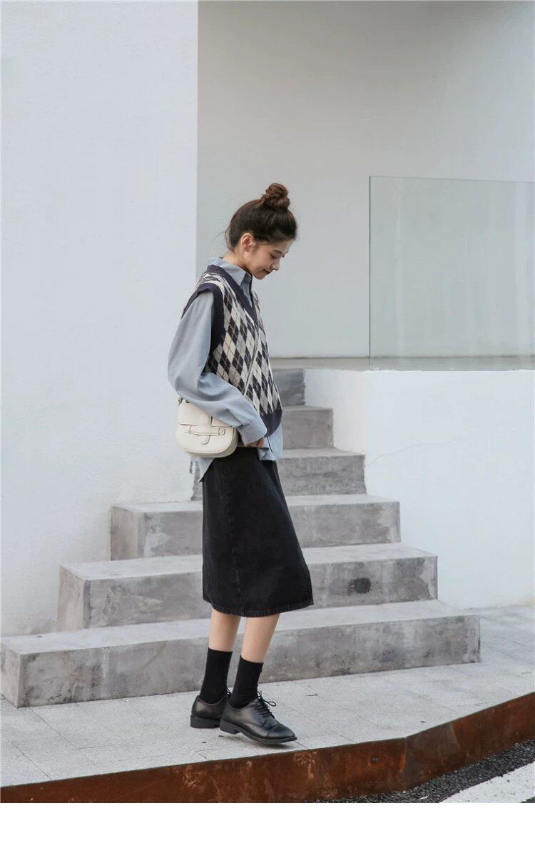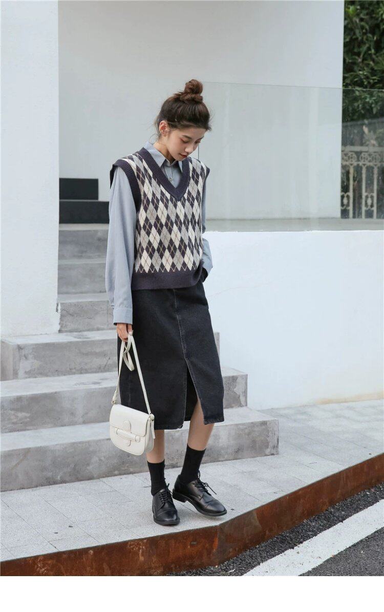 Свитер без рукавов, жилет, ретро трикотажный короткий комплект с ромбовидным узором, куртка, в корейском стиле