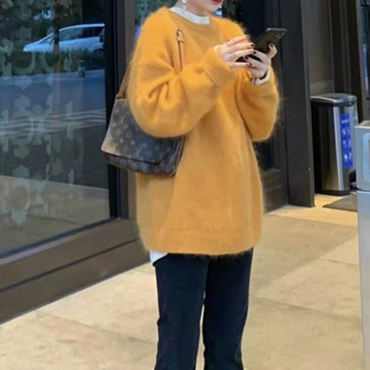 Рыжий свитер, весенний трикотажный комплект с круглым воротником, свободный крой, тренд сезона