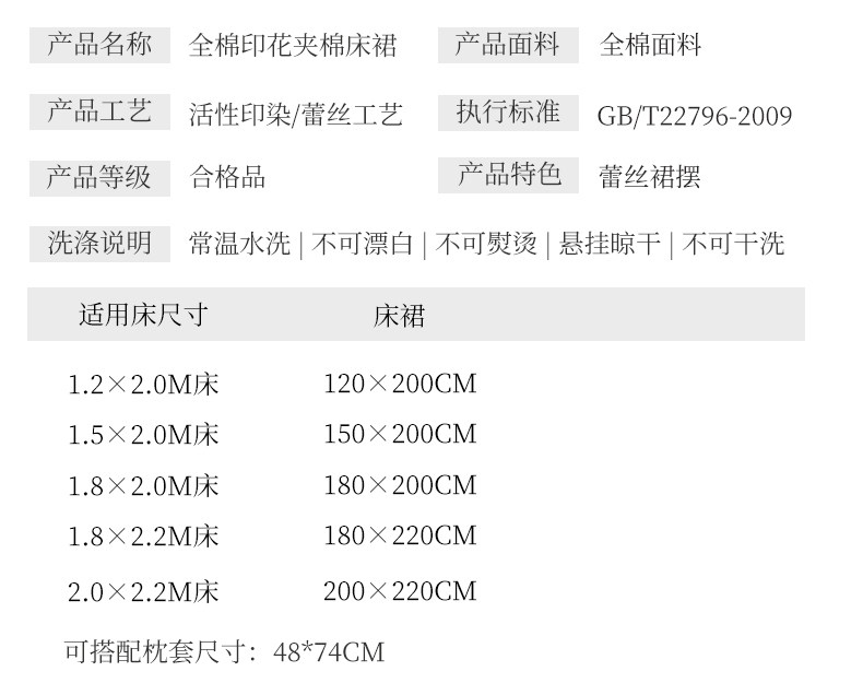 | Размеры простыней/кроватей: | 120cmx200cm Pure Cotton Bend Юбка, 150cmx200cm Pure Cotton Bend Юбка, 180cmx200cm Хлопта, 180cmx220cm хлопчатобумажная юбка для хлопчатобумажной кровати, 200cmx220cm Комплексная юбка для хлопчатобумажной кровати, 120смx200см (хлопковая юбка + пара наволочек), 150смx200см (хлопковая юбка + пара наволочек), 180смx200см (хлопковая юбка + пара наволочек), 180смx220см (хлопковая юбка + пара наволочек), 200смх220см (хлопковая юбка + пара наволочек) |