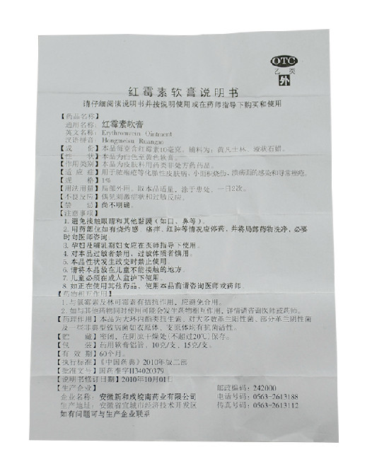 新和成 Эритромицин мази 10G*1 филе/коробка прыщей, ожоги прыщей, язвенные сливки, гнойная кожная инфекция