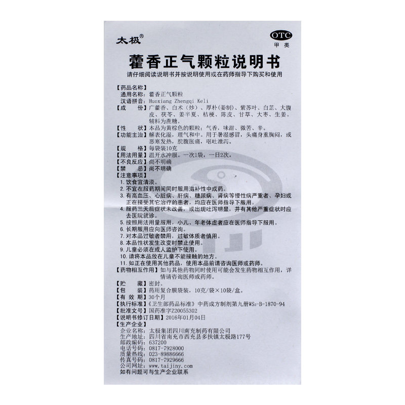 太极 Хуоксианг Чжэнки Гранулы 10G*10 мешков/коробка летнего влажного холодного пищеварения, горячая головная боль, диарея