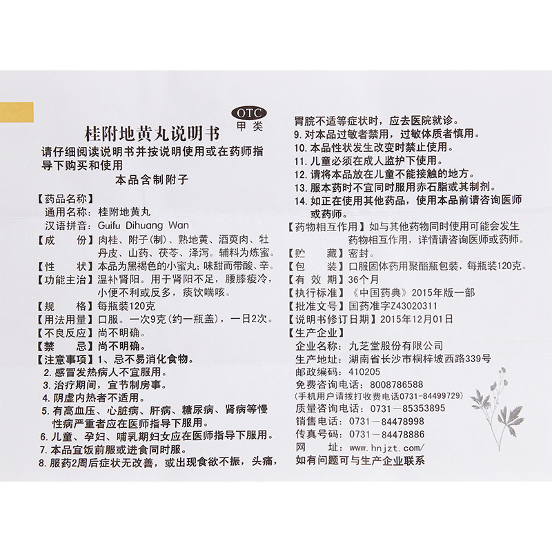 九芝堂 Gui fu dihuang Таблетки 120g*1 бутылка/температура коробка Тоническая почка ян, дефицит почки ян, неблагоприятная частота мочи