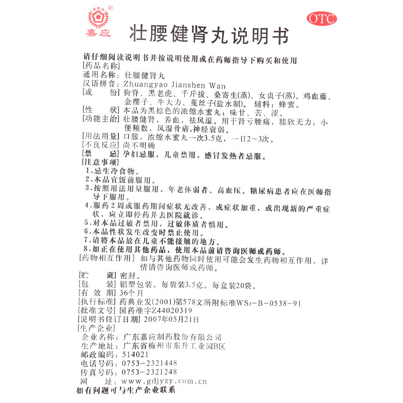 嘉应牌 Zhuangyao Kenyhen Pill 3,5 г*20 мешков/коробки, чтобы удалить ревматизм потерю почек поясничный
