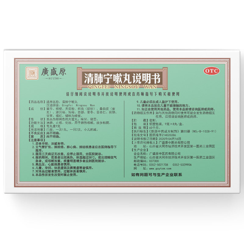 广盛原 Qingfei ning ning coush таблетки 9g*8 таблетки Akashi Medicine Lunge Konh, мокрота, прозрачный кашель, кашель, кашель, холодная, холодная пневмония