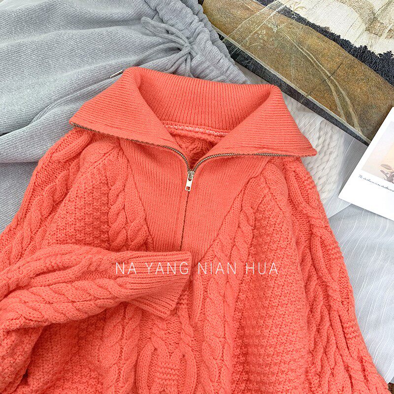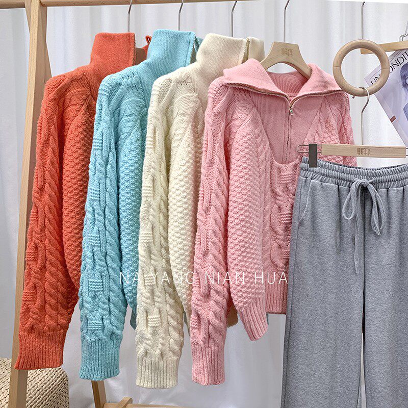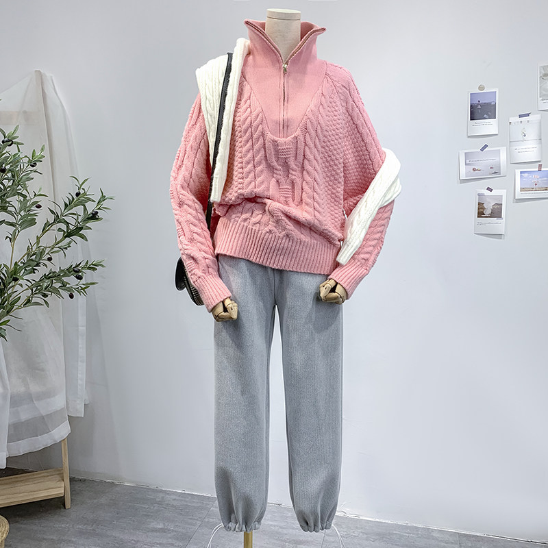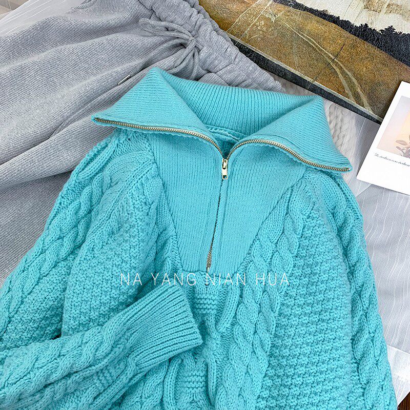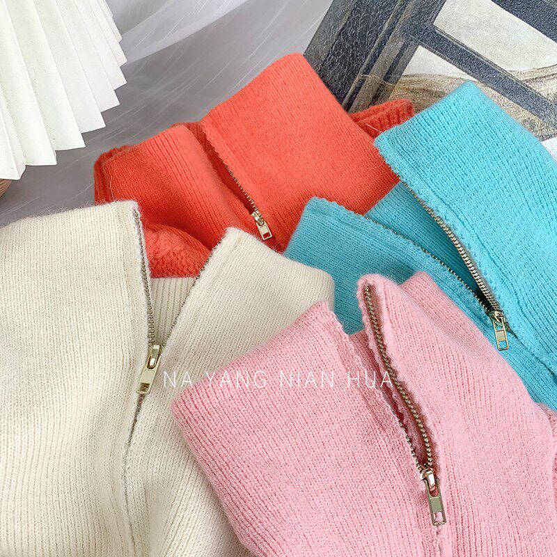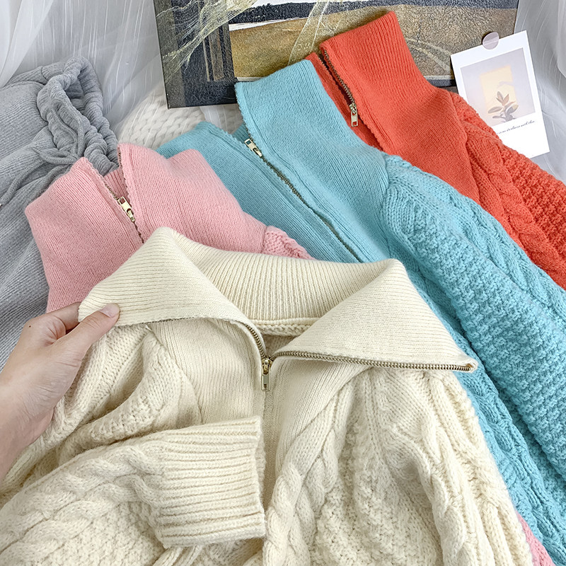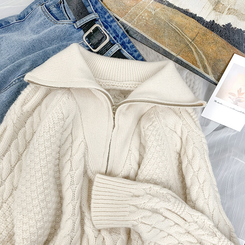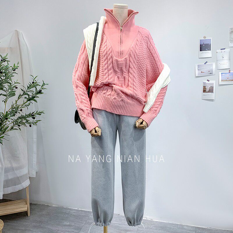 Демисезонный свитер с молнией, ретро трикотажные джинсы с начесом, в корейском стиле