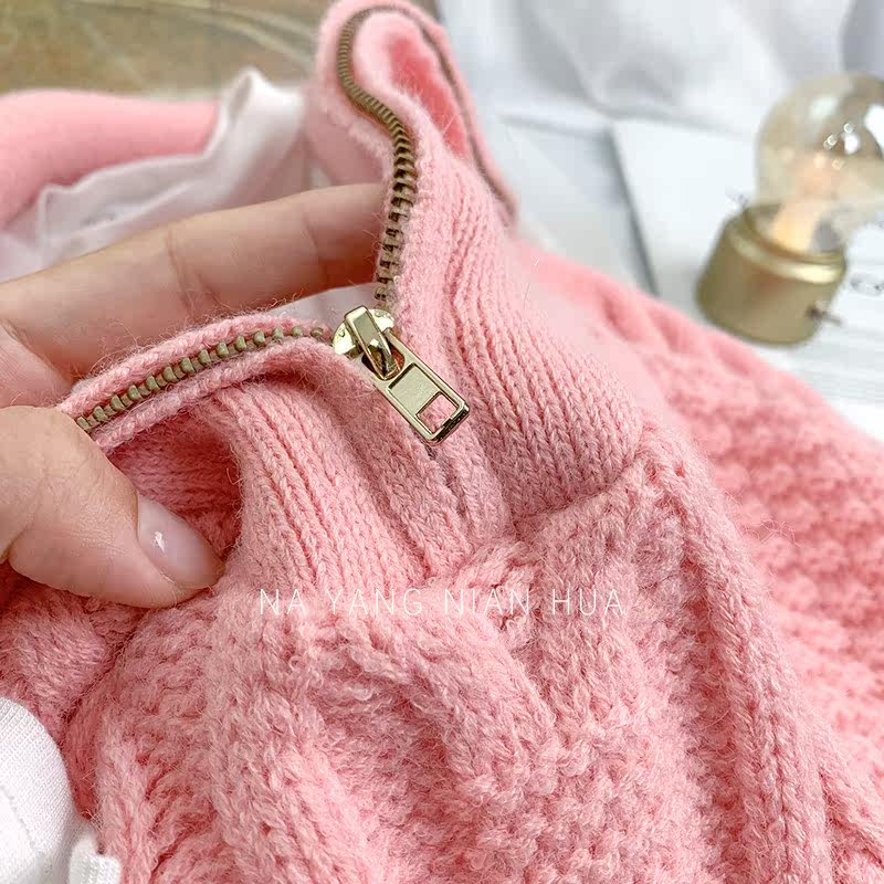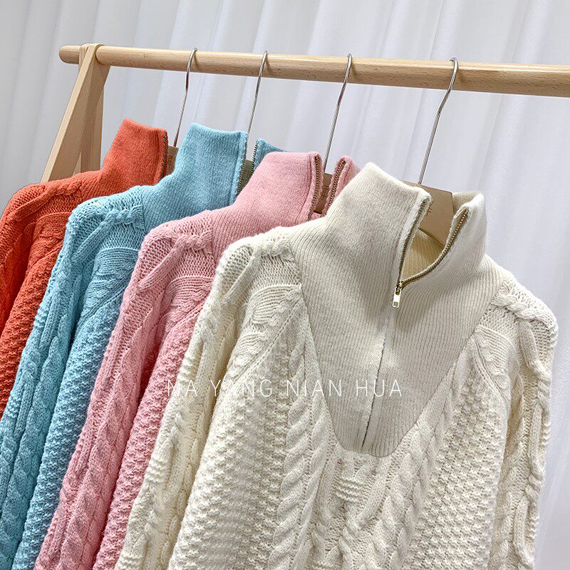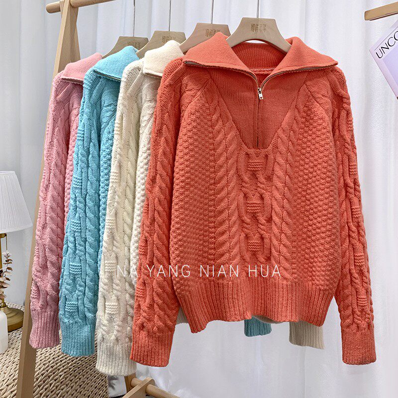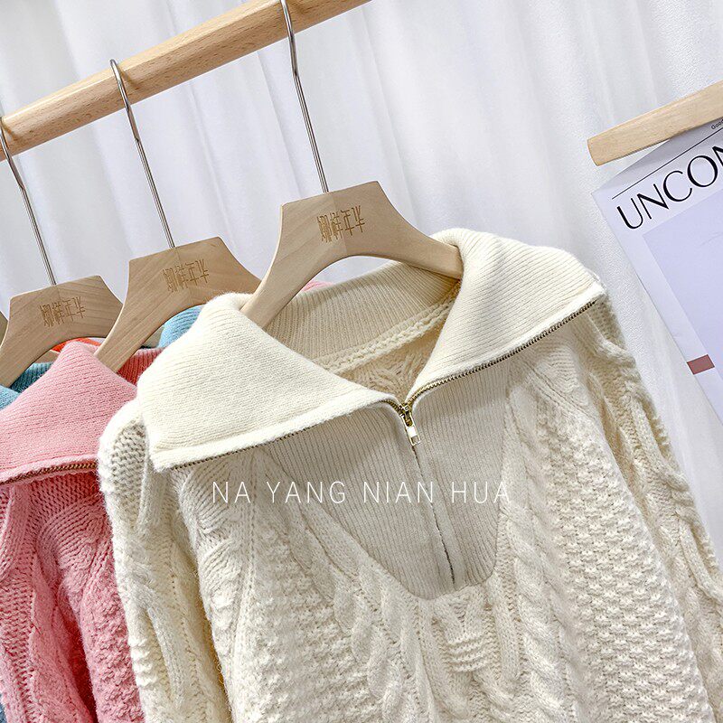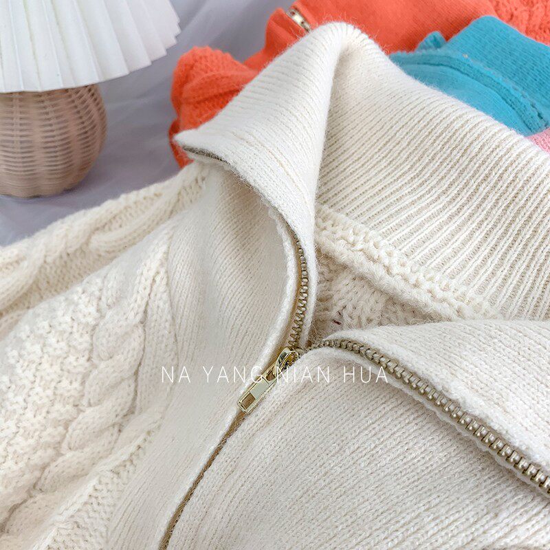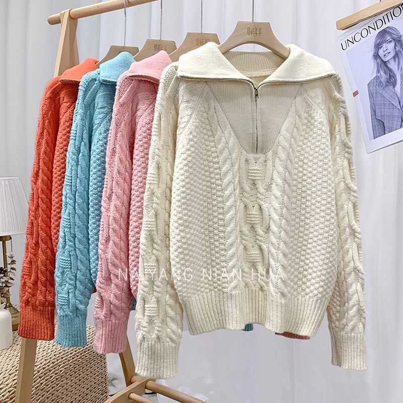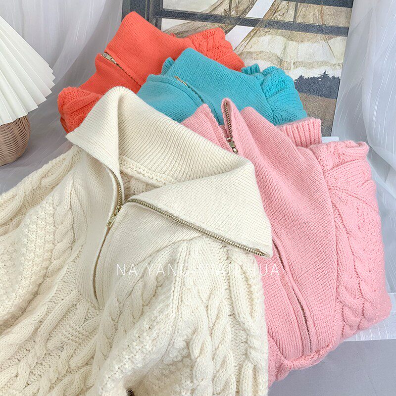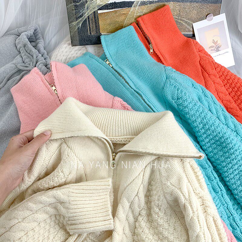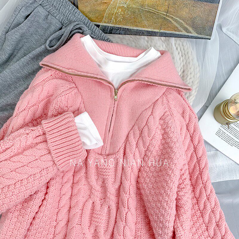 Демисезонный свитер с молнией, ретро трикотажные джинсы с начесом, в корейском стиле