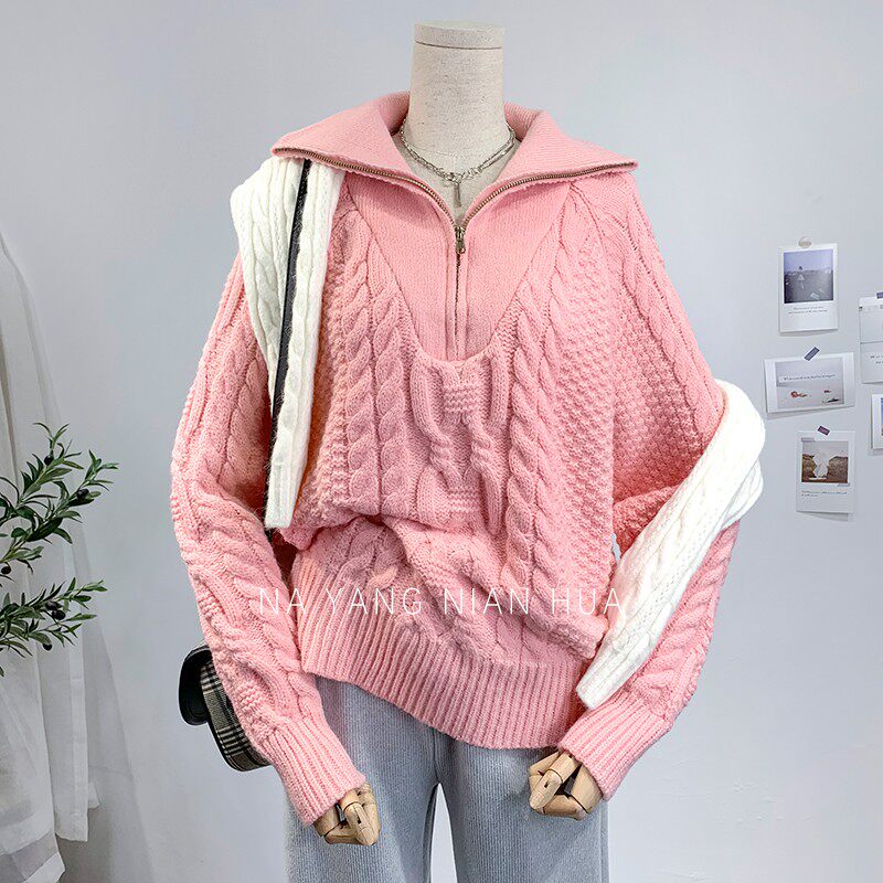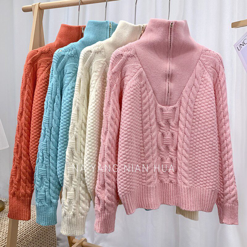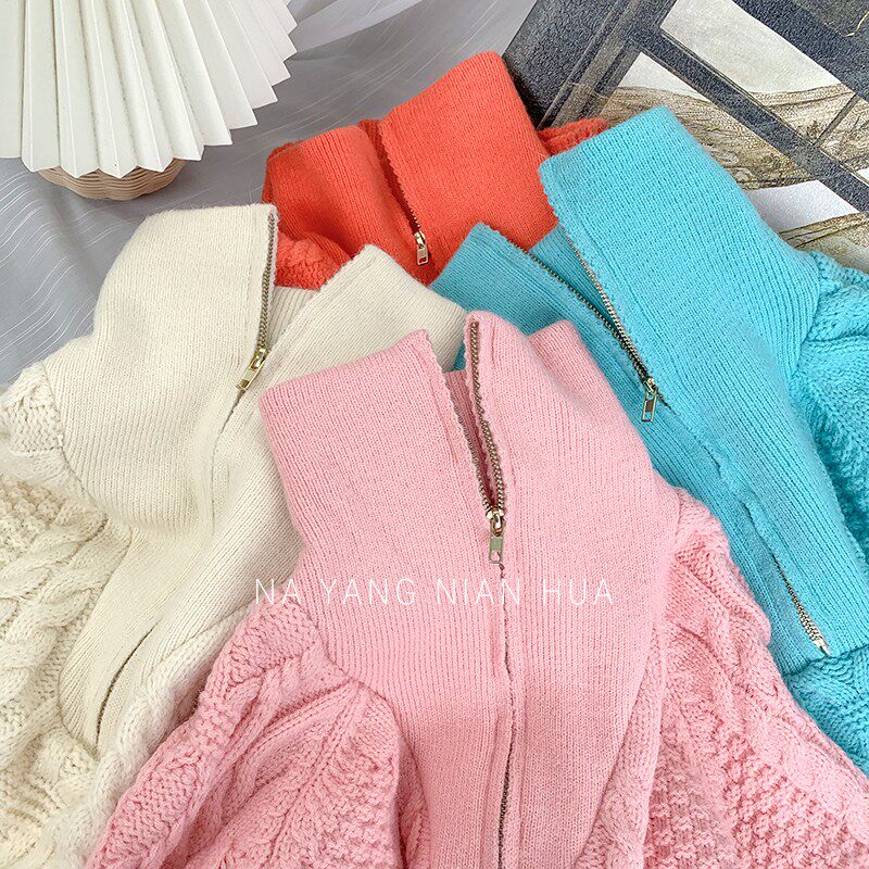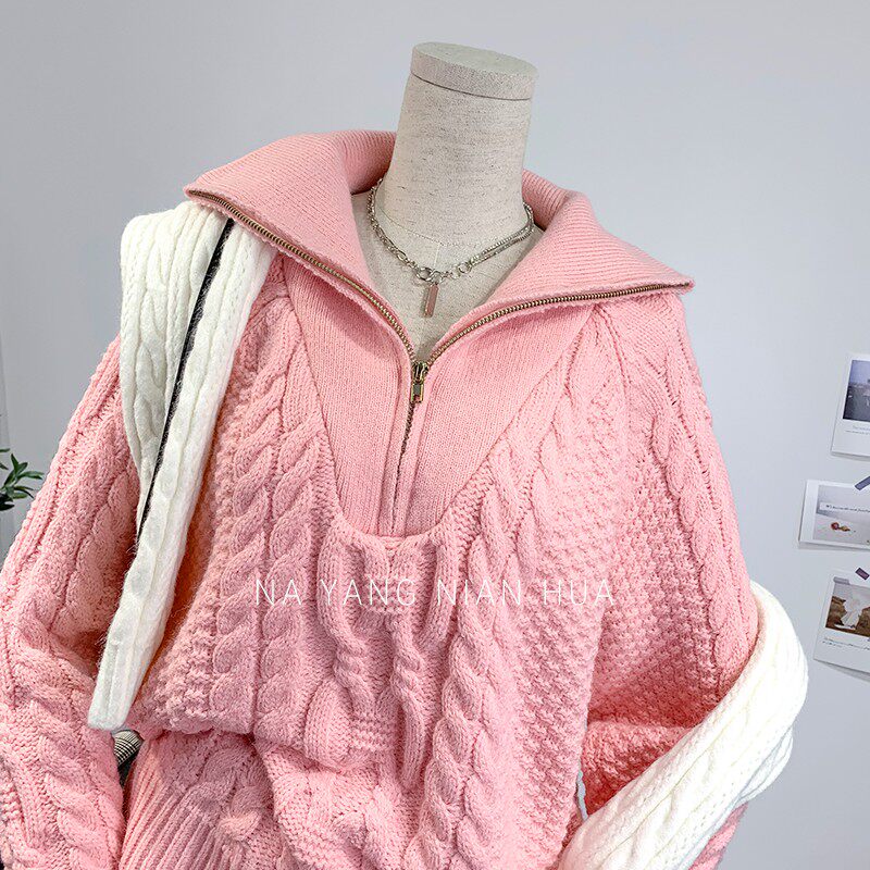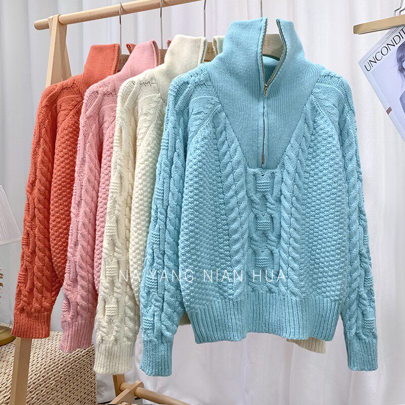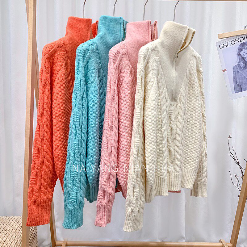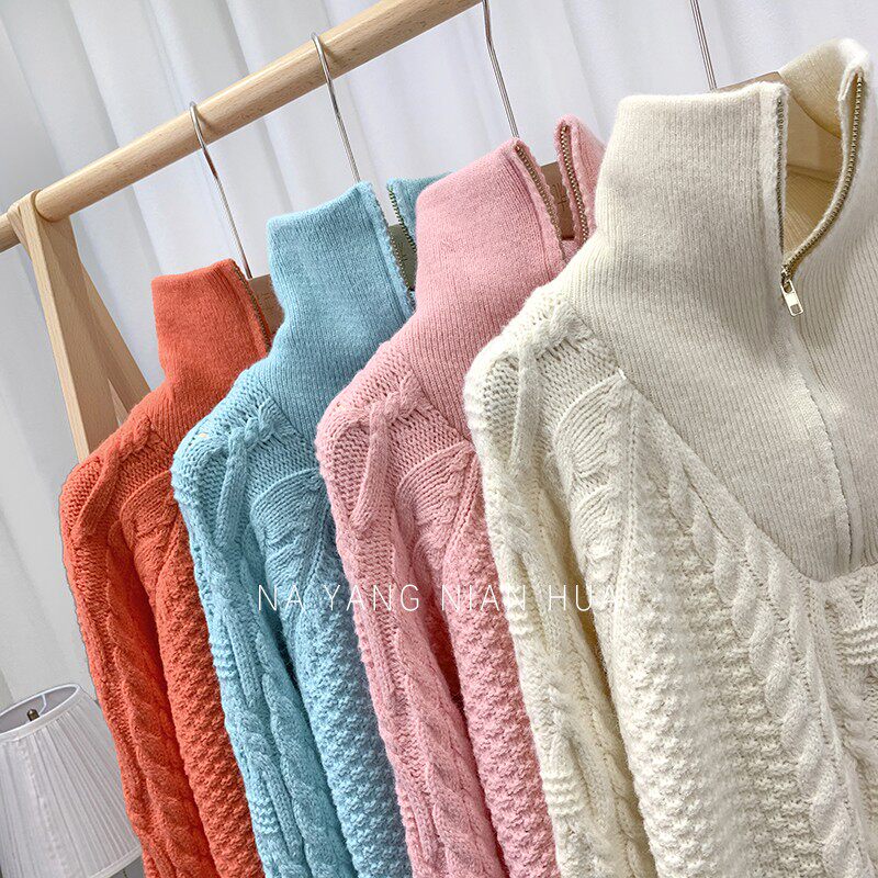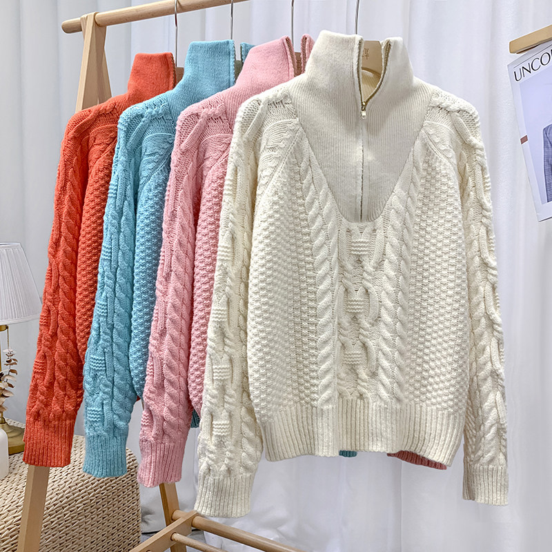 Демисезонный свитер с молнией, ретро трикотажные джинсы с начесом, в корейском стиле