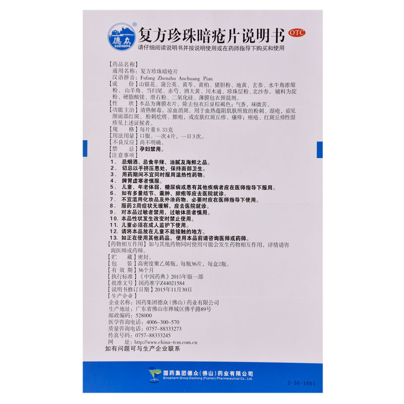 德众 Составные таблетки от прыщей жемчужины 0,33 г*36 Таблетки*2 бутылки/коробка для экземы прыщей, зуд, прыщей, прыщей
