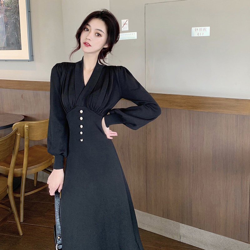 Приталенное платье, базовая длинная юбка, французский стиль, V-образный вырез, рукава фонарики