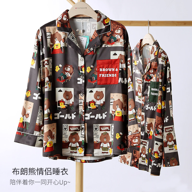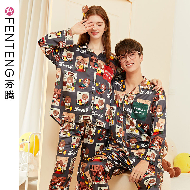芬腾 Осенняя пижама для влюбленных, шелковый лонгслив, кардиган, комплект, в корейском стиле