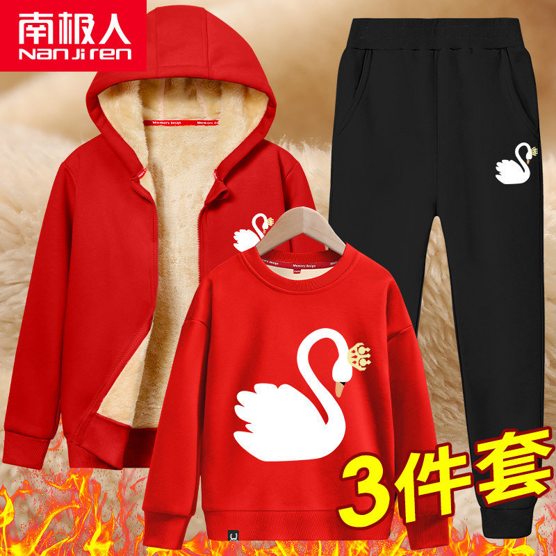 Утепленный осенний демисезонный детский комплект, удерживающий тепло красный спортивный костюм, увеличенная толщина, в западном стиле, подходит для подростков, 3 предмета