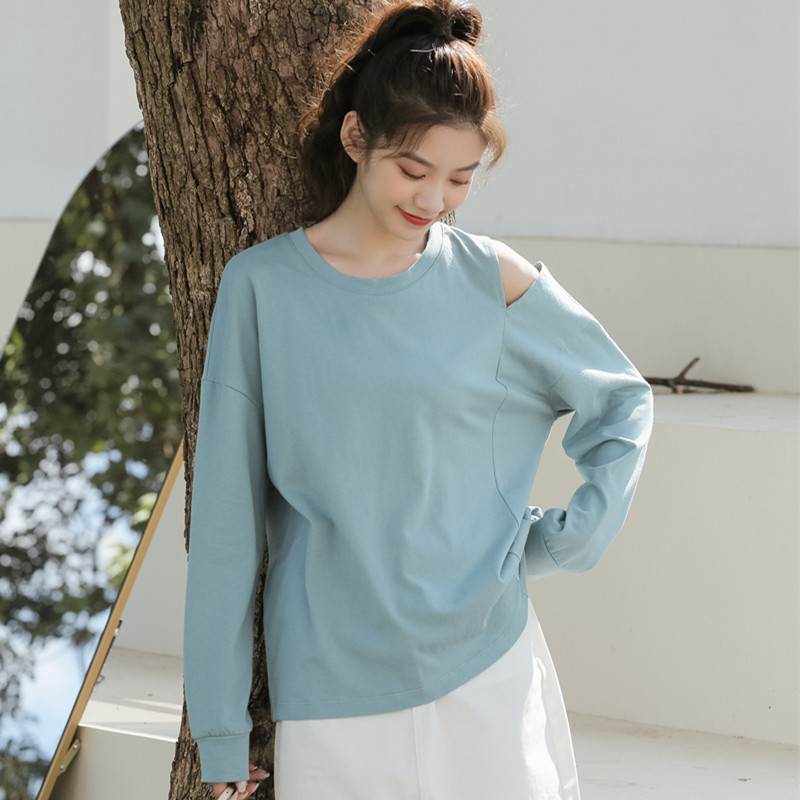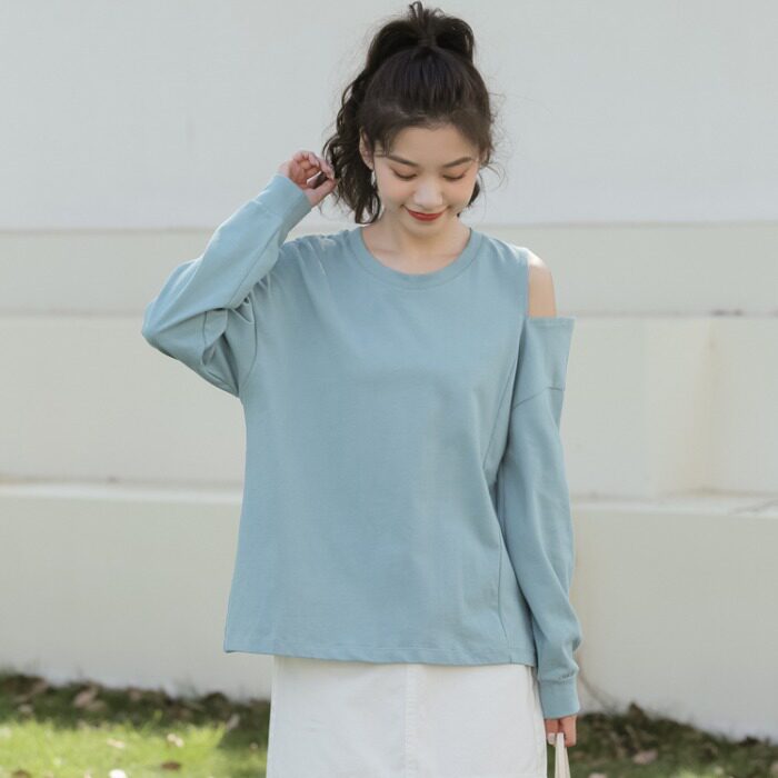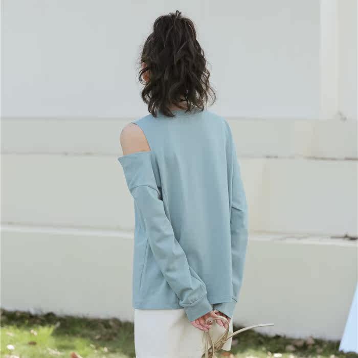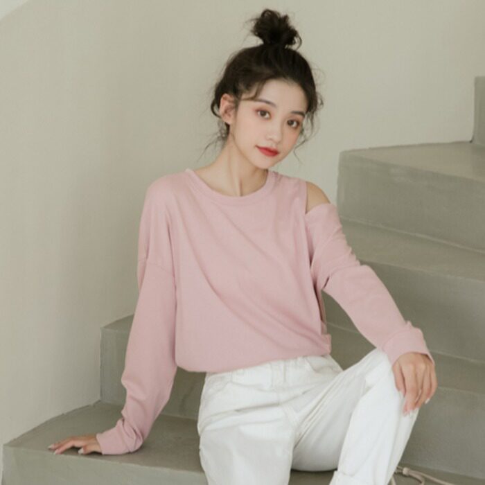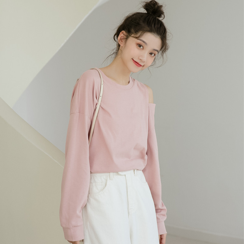 Милый крутой топ, популярная в этом году нижняя рубашка, бело-розовая футболка с длинными рукавами, женская сдержанная открытая футболка до половины плеча