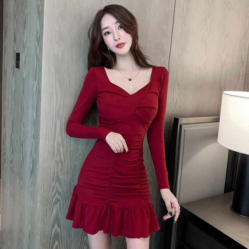 Лонгслив, платье, весенний приталенный корсет, базовая мини-юбка, тренд сезона, V-образный вырез, с акцентом на бедрах, крой «рыбий хвост»