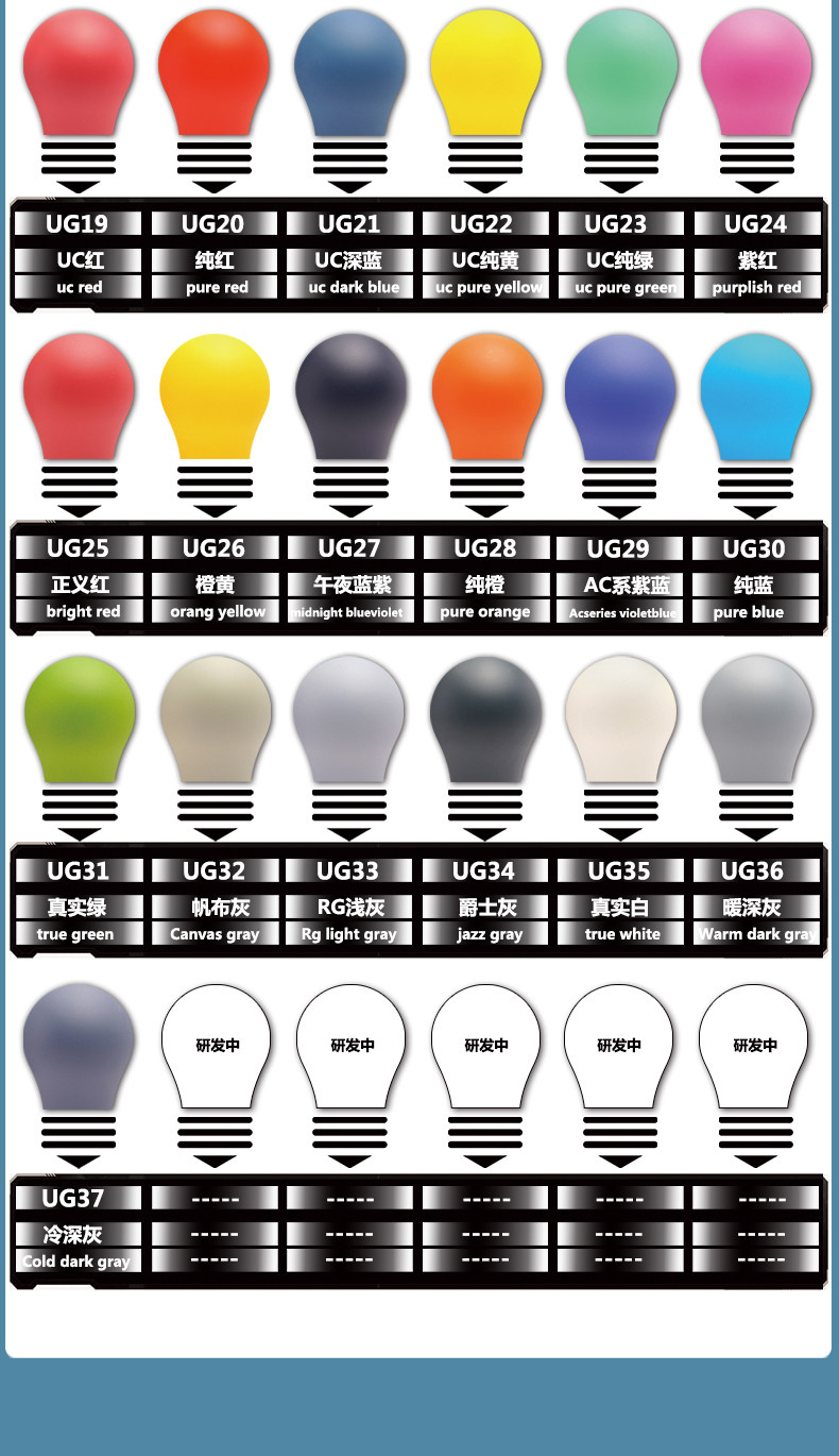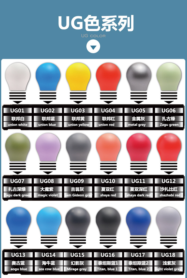 | Классификация цветов: | UG25 Справедливость Красный 60мл, UG26 апельсин 60мл, UG27 темно-синий фиолетовый 60мл, UG28 Чистый апельсин 60мл, UG29 AC Фиолетовый Синий 60мл, UG30 чистый синий 60мл, UG31 Настоящий зеленый 60мл, UG32 канвас серый 60мл, UG33 Rg светло-серый 60мл, UG34 джазовый серый 60мл, UG35 Настоящий белый 60мл, UG36 теплый темно-серый 60мл, UG37 Холодный темно-серый 60мл |