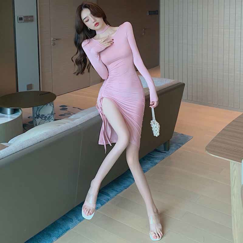 Розовое сексуальное трикотажное платье, приталенный корсет, длинная юбка, французский стиль, с акцентом на бедрах, длина макси