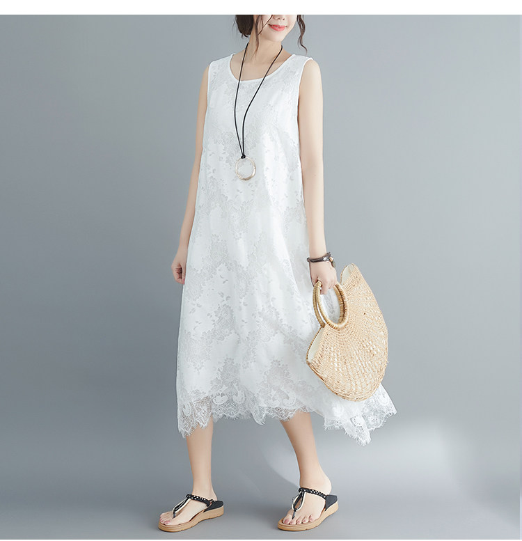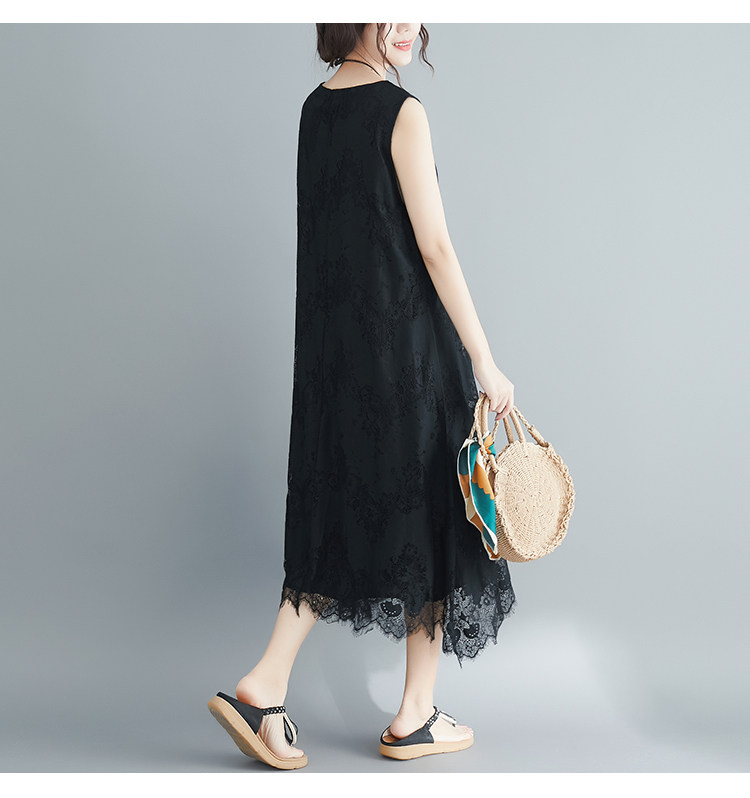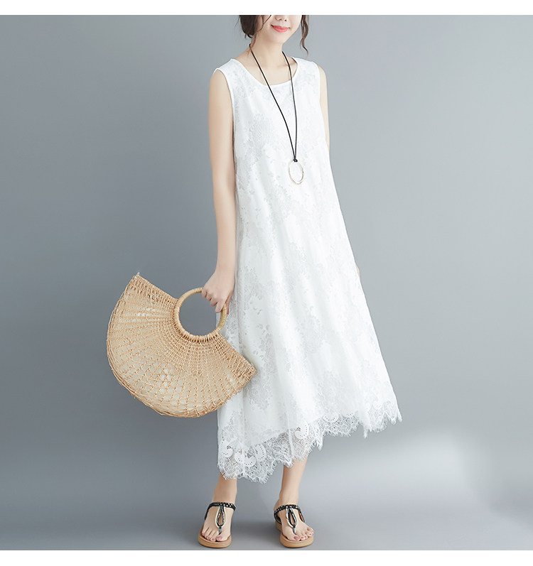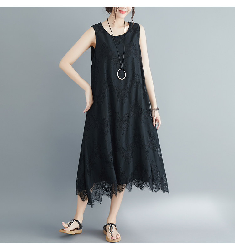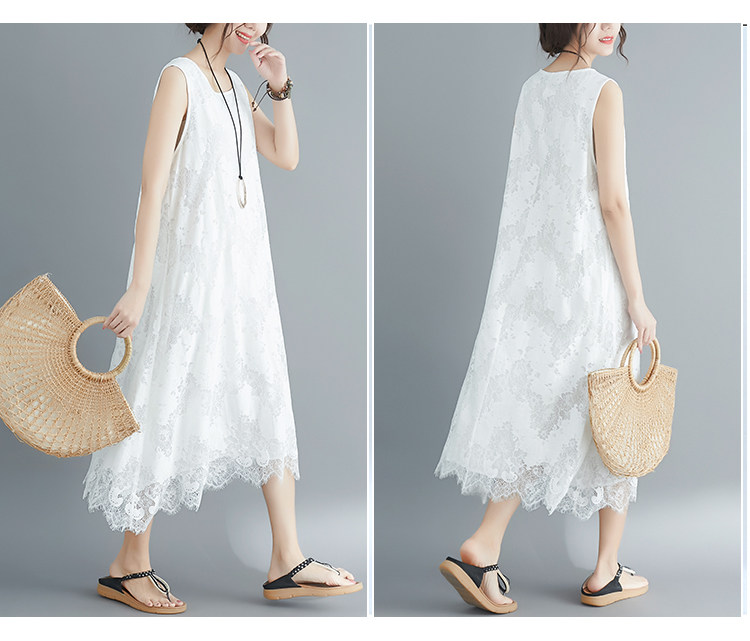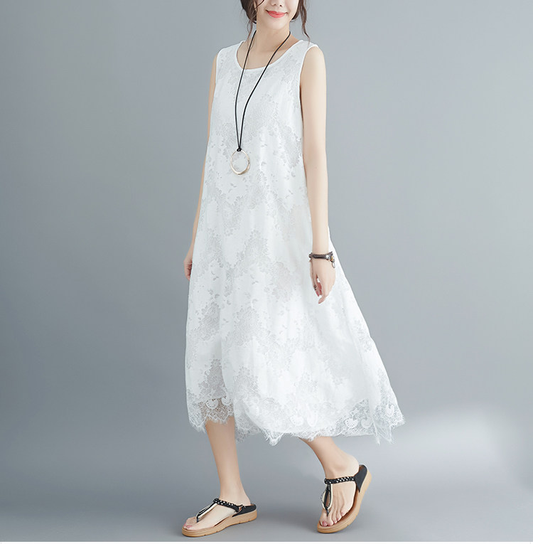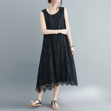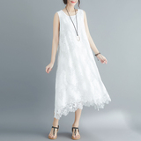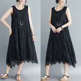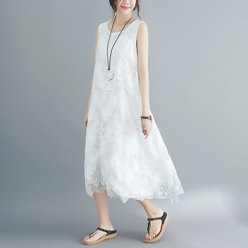 Летняя одежда, кружевное платье без рукавов без рукавов, длинная юбка, свободный крой, А-силуэт, большой размер, средней длины, городской стиль