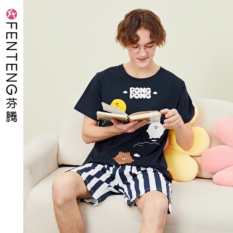 芬腾 Хлопковая пижама, хлопковый мультяшный тонкий комплект подходит для мужчин и женщин, для влюбленных, в корейском стиле