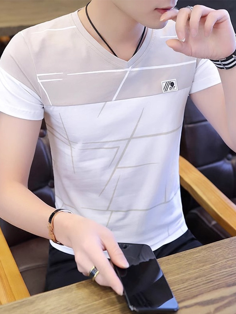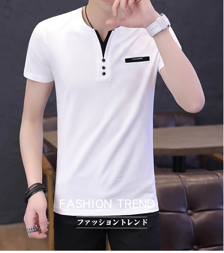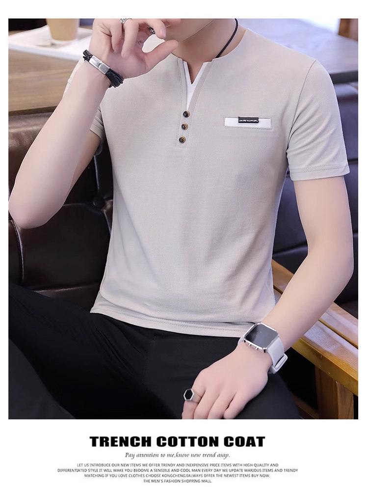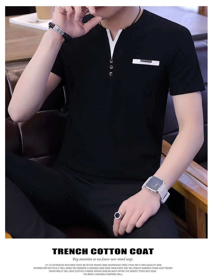 Мужская модная хлопковая футболка с коротким рукавом, универсальная летняя футболка polo, V-образный вырез, облегающий крой