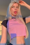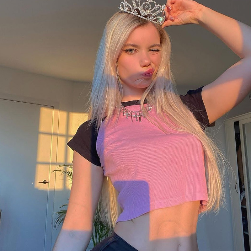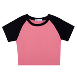 Tide, ретро розовая трикотажная футболка с коротким рукавом с круглым воротником, в американском стиле, высокая талия