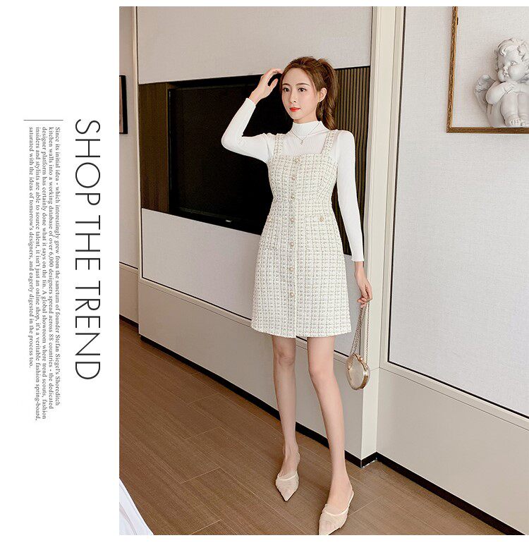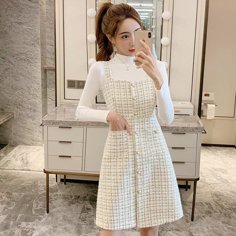 Демисезонная майка, шерстяные подтяжки, платье, комплект, юбка, французский стиль, в стиле Шанель, эффект подтяжки