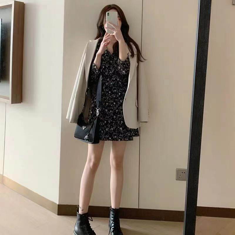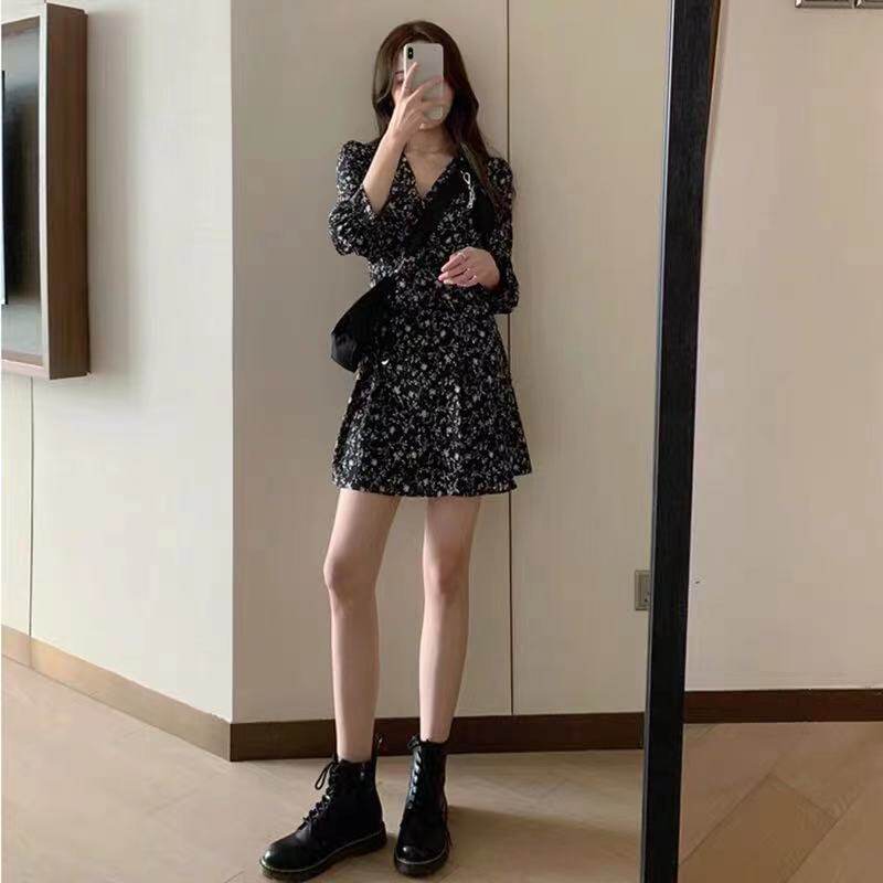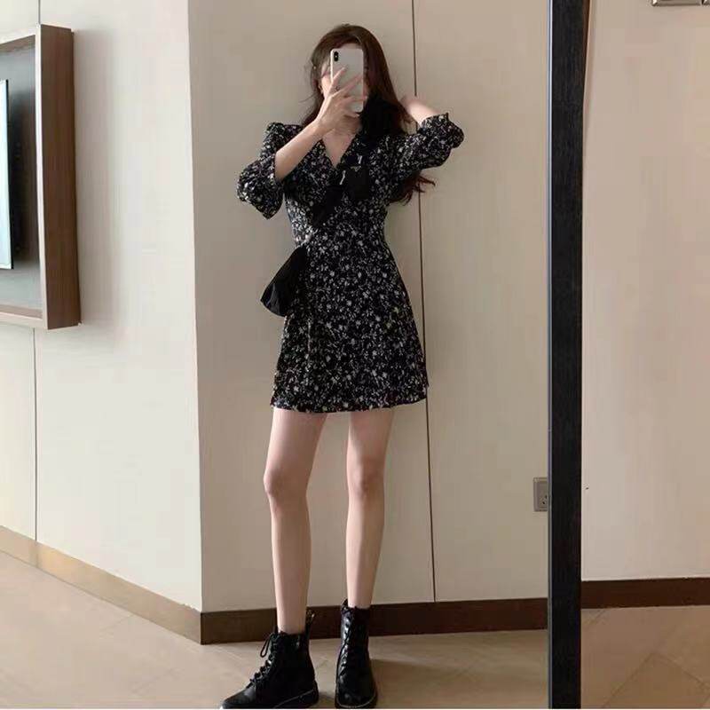 Весеннее короткое сексуальное базовое платье, 2021 года, тренд сезона, городской стиль, французский стиль, в цветочек, V-образный вырез, подходит для подростков
