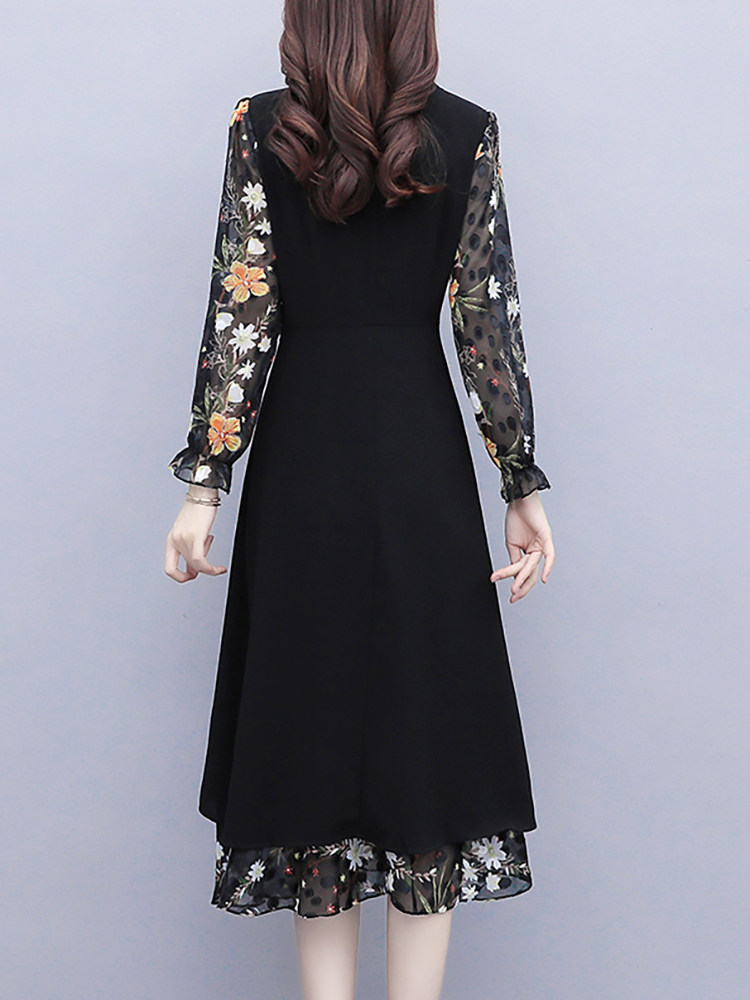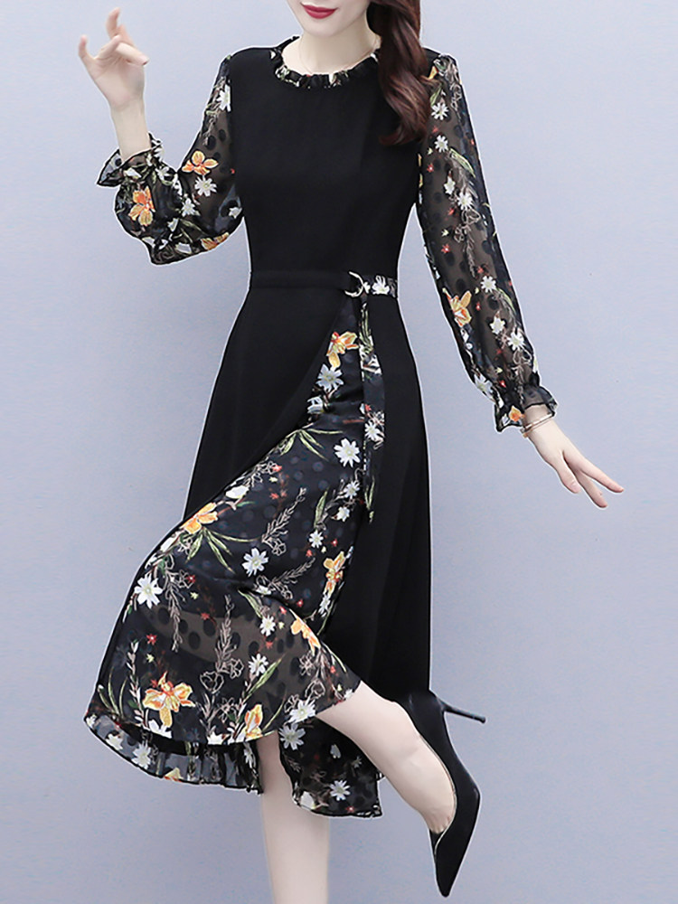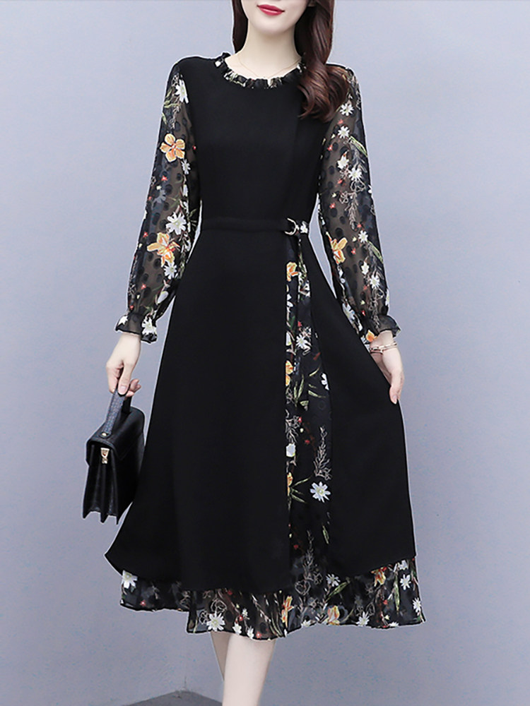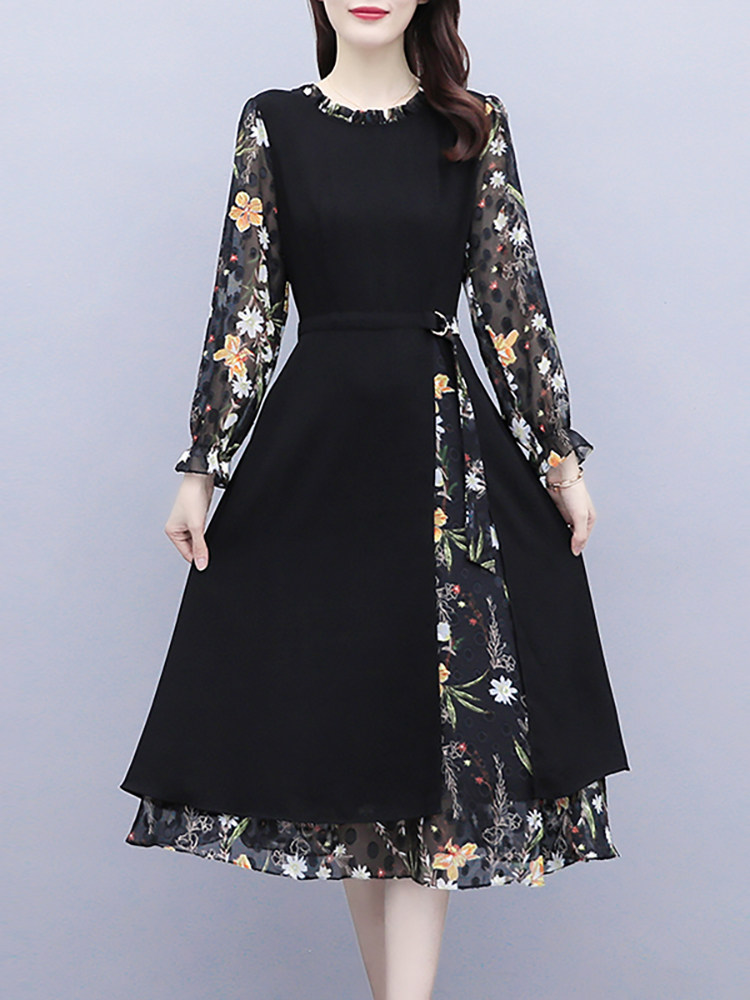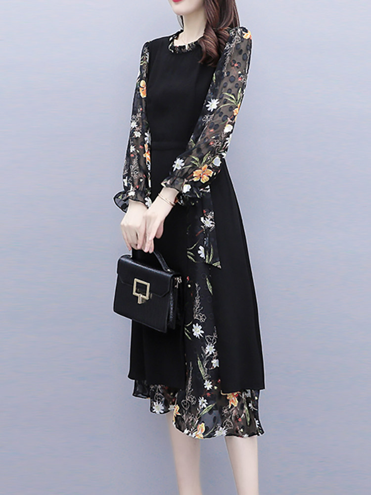 Шифоновое осеннее платье, приталенный корсет, лонгслив, в цветочек, 2024 года, большой размер, в западном стиле