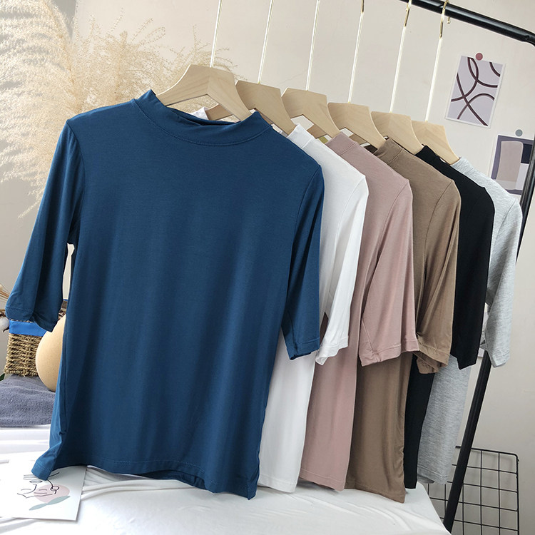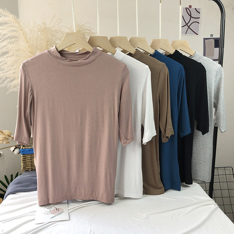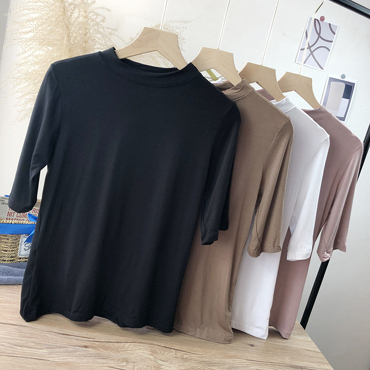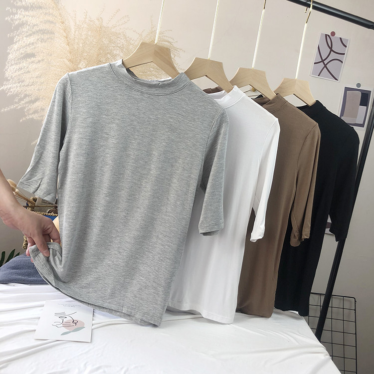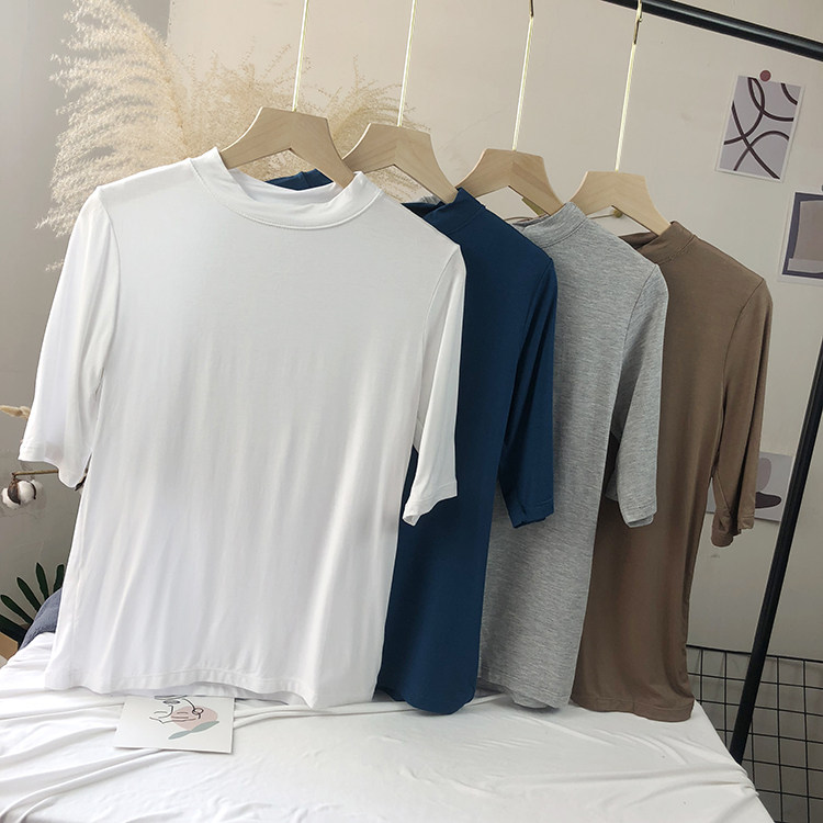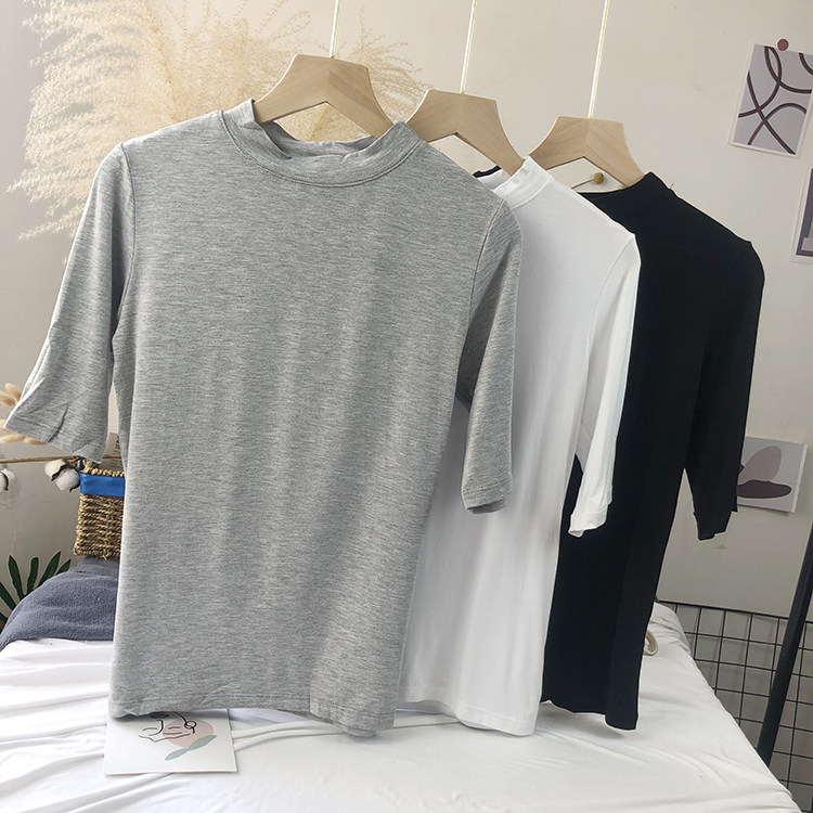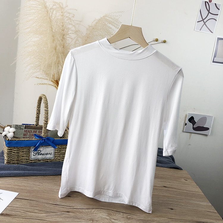 Базовая белая весенняя футболка, высокий воротник, облегающий крой