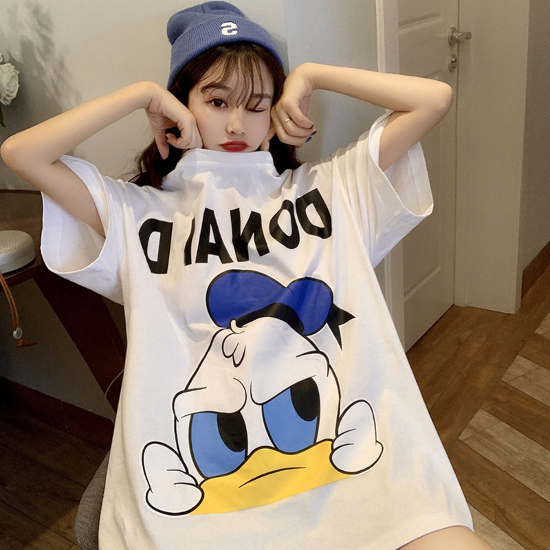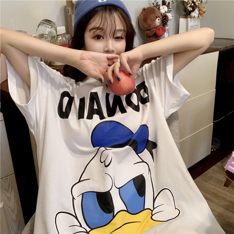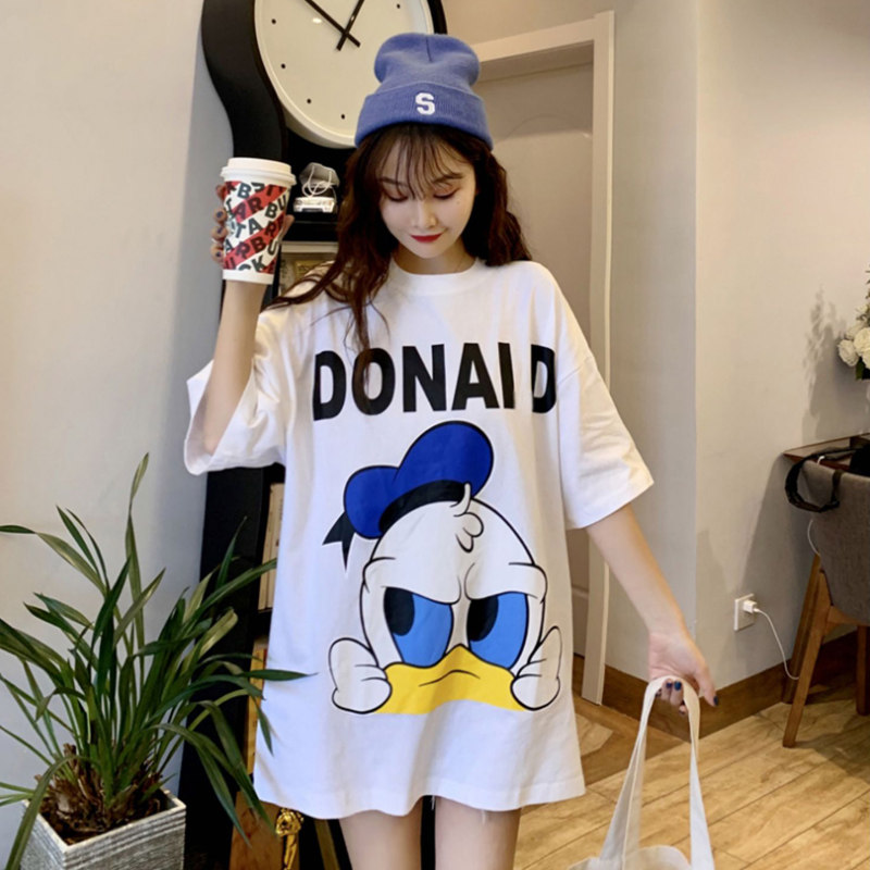 Белая мультяшная длинная футболка, короткий рукав, коллекция 2023, свободный крой, средней длины