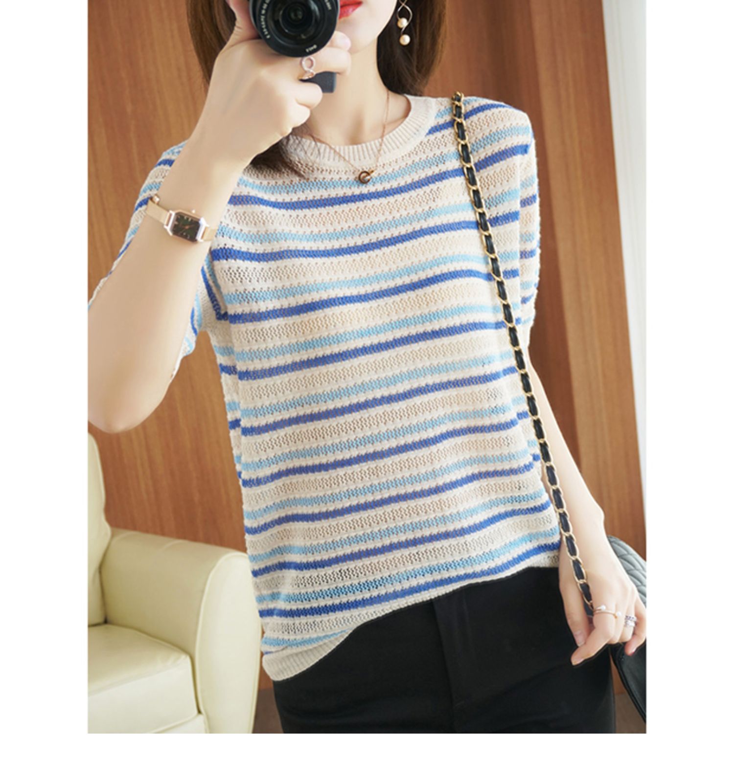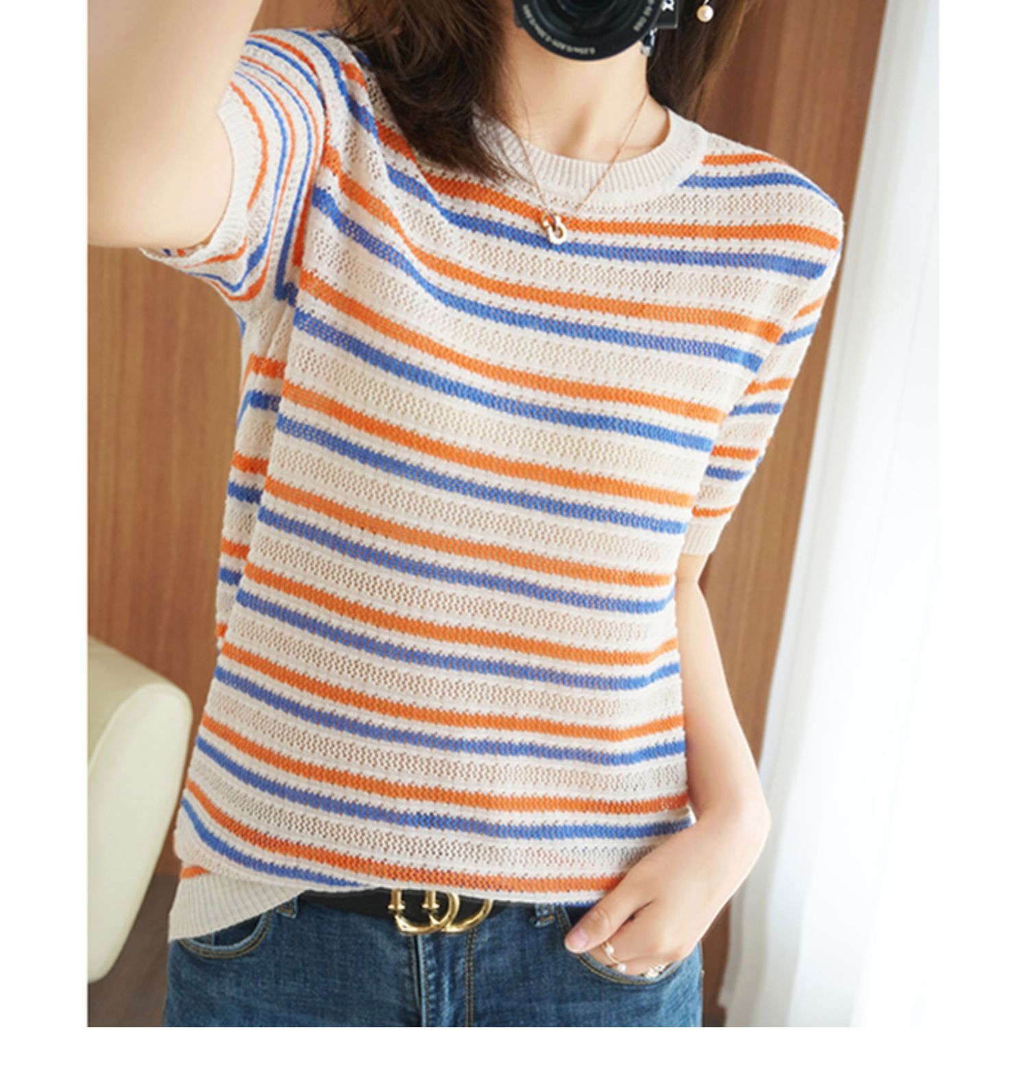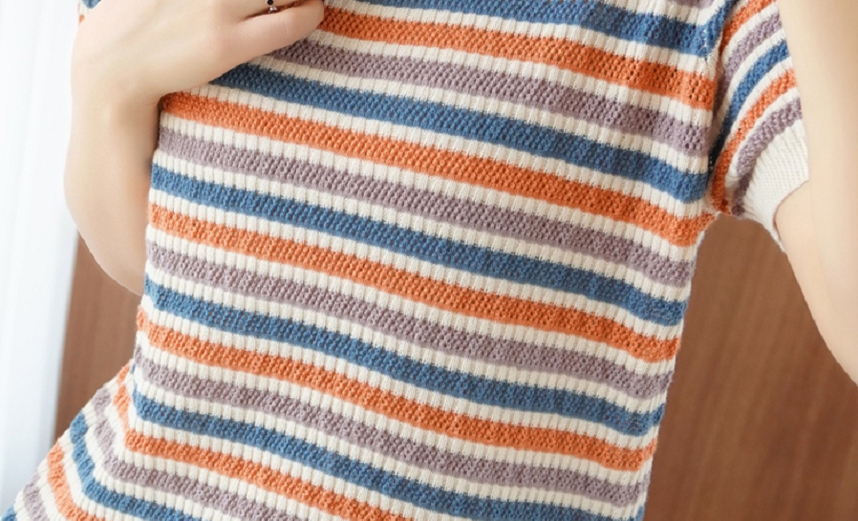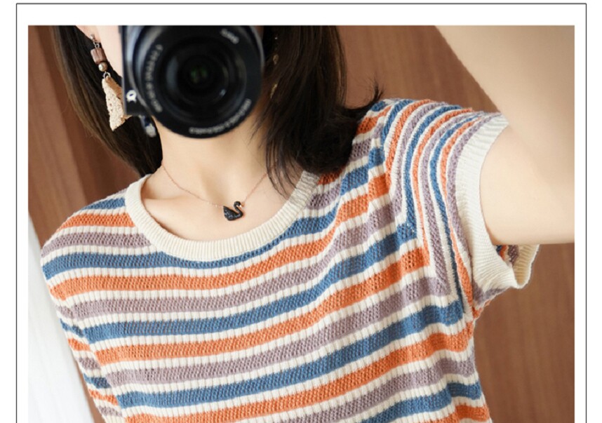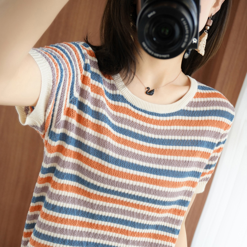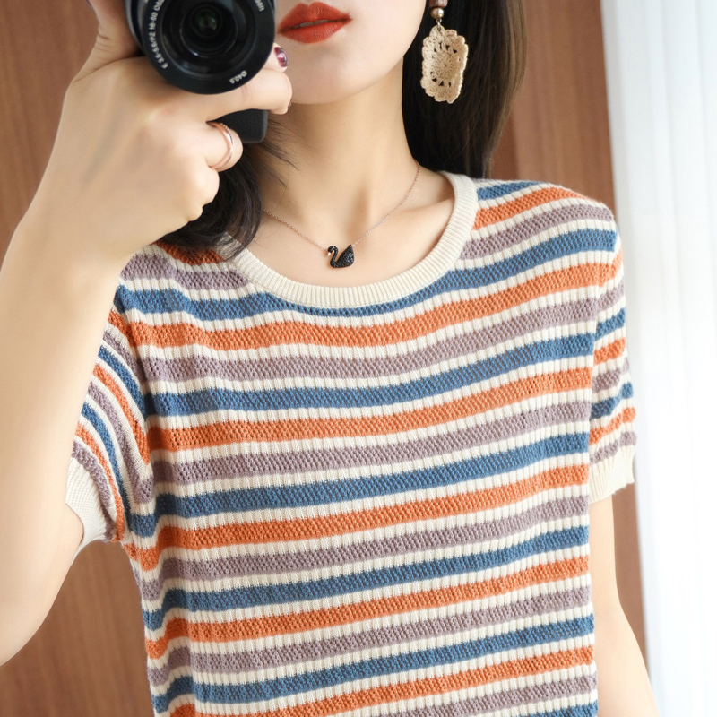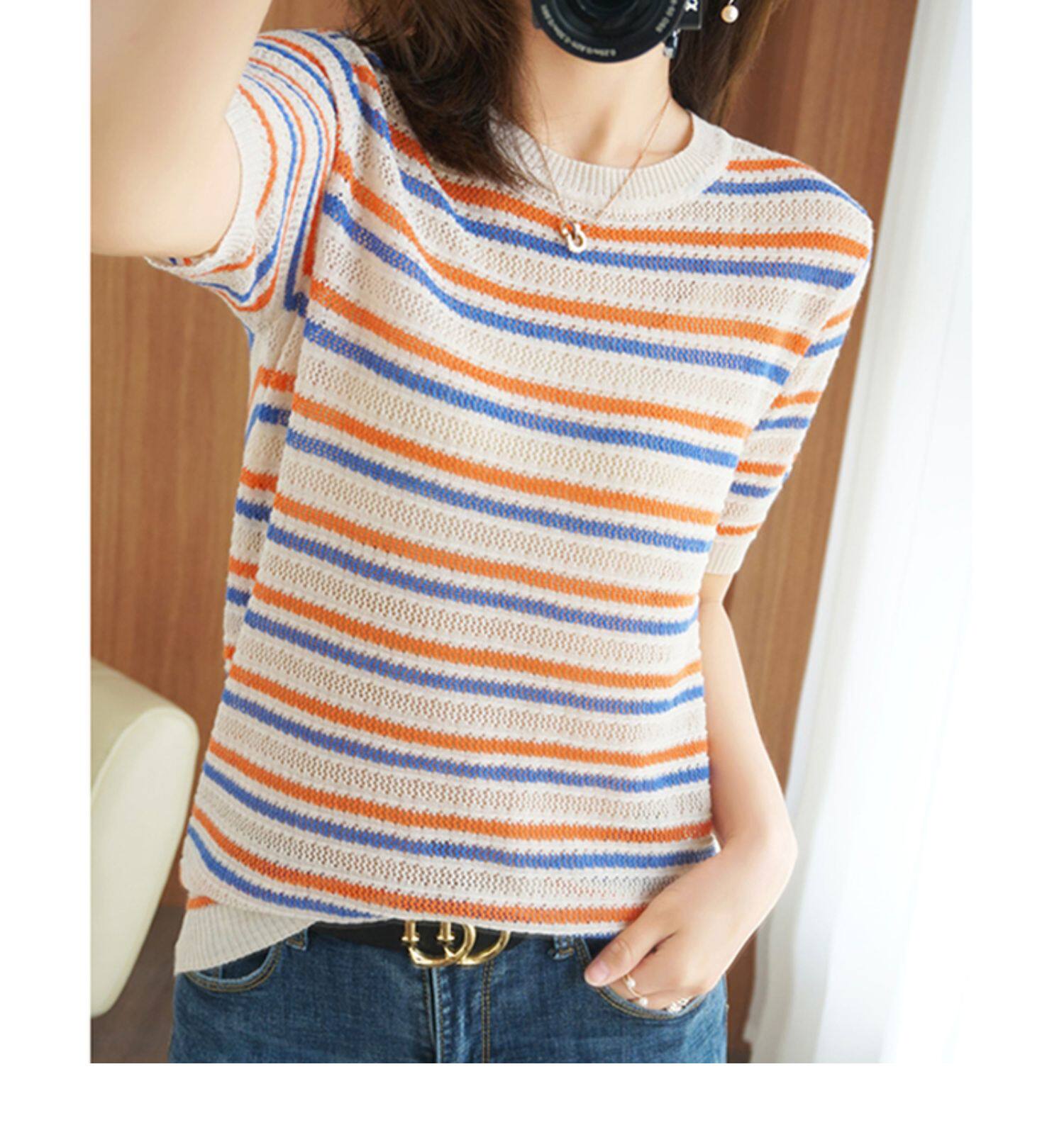 Радужная тонкая летняя футболка, трикотажный свитер, короткий рукав, из хлопка и льна, круглый воротник
