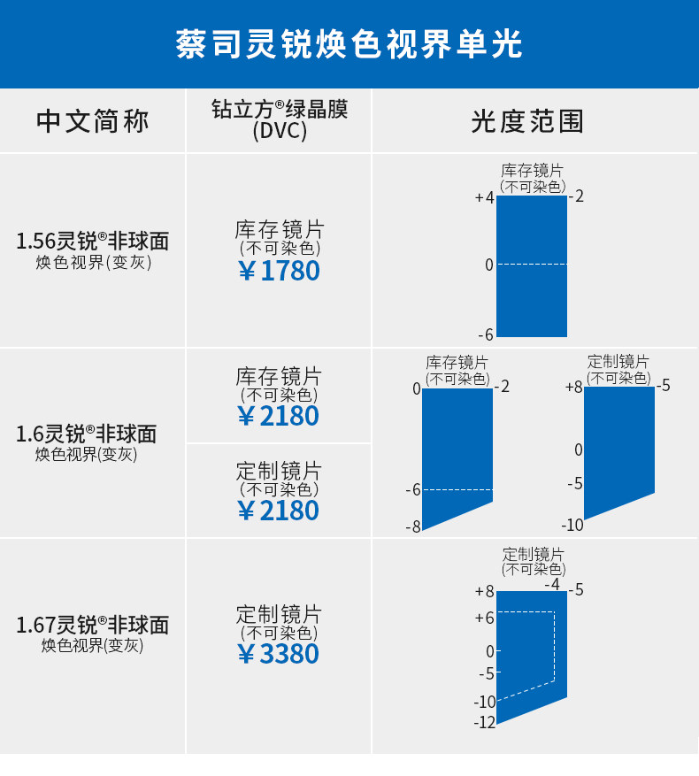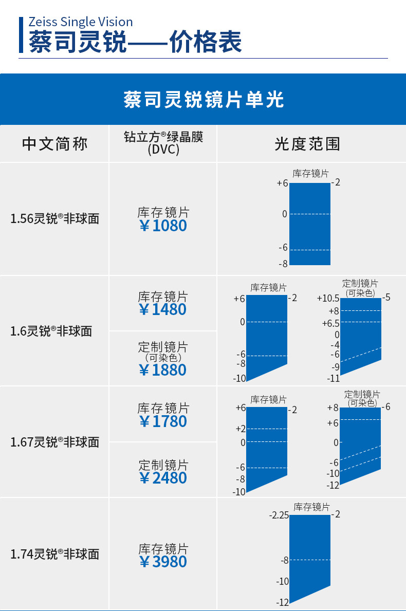 | Показатель преломления линзы: | 1.50 (обычный), 1,56 (тонкий), 1,60 (тонкий), 1,67 (ультра -тщательный), 1,74 (ультра -тщательный) |