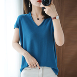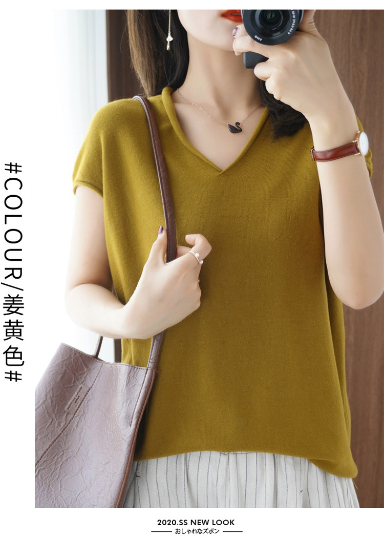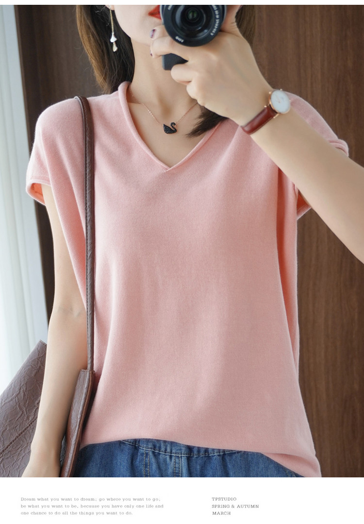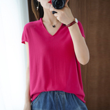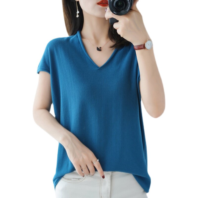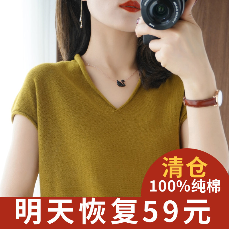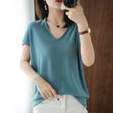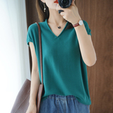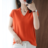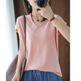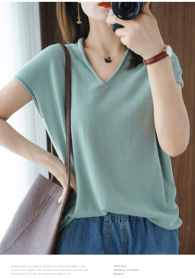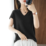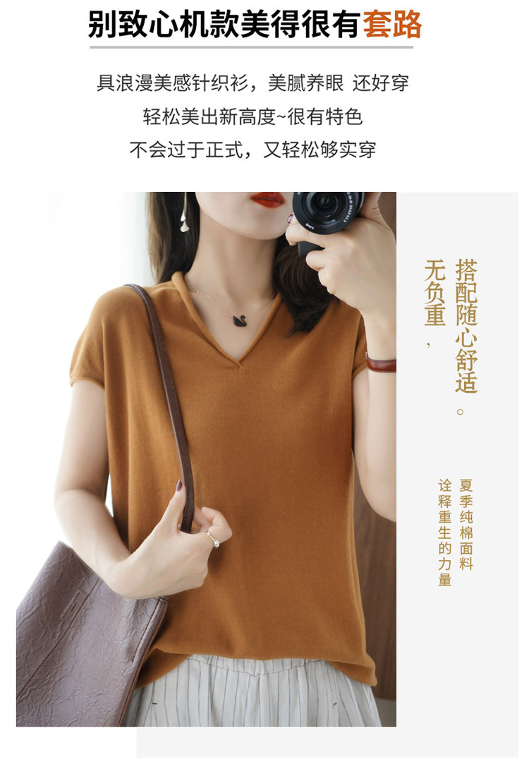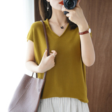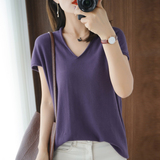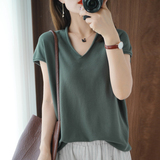 Хлопковая футболка, трикотажный свитер, коллекция 2021, 100% хлопок, из хлопка и льна, V-образный вырез, короткий рукав, свободный крой