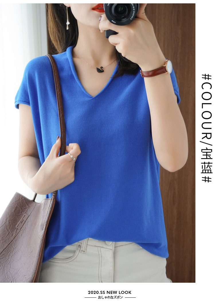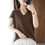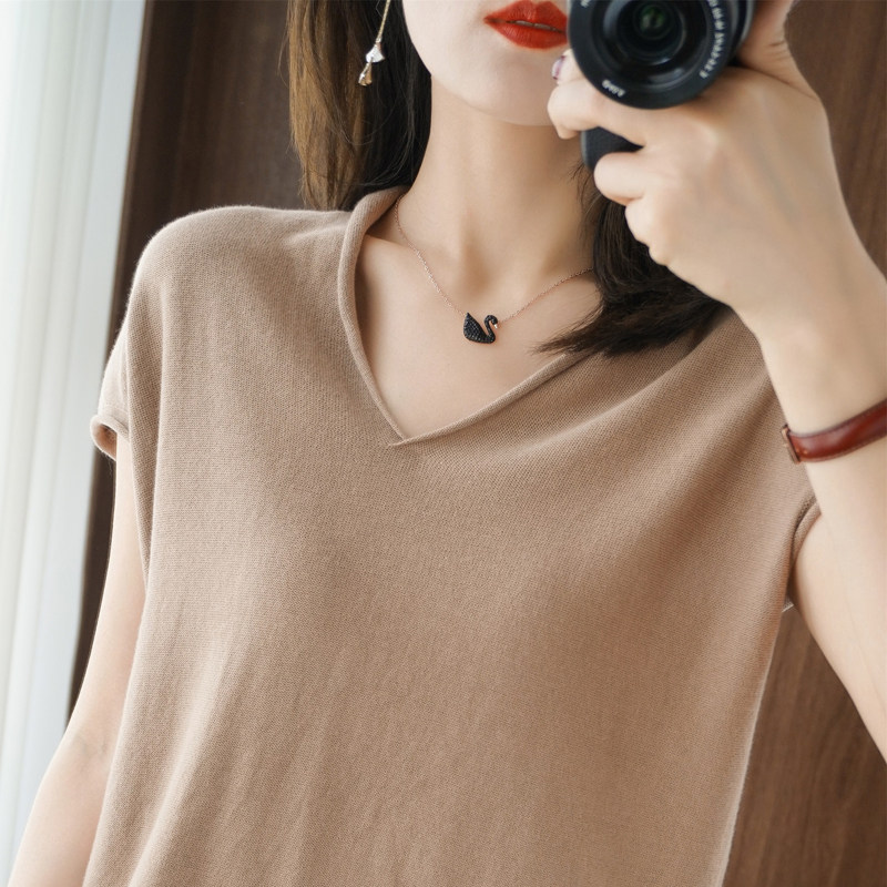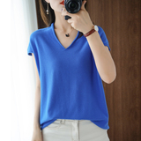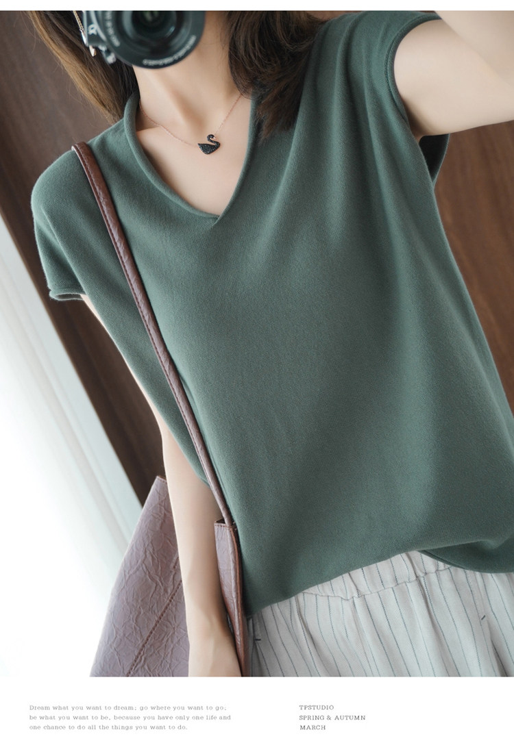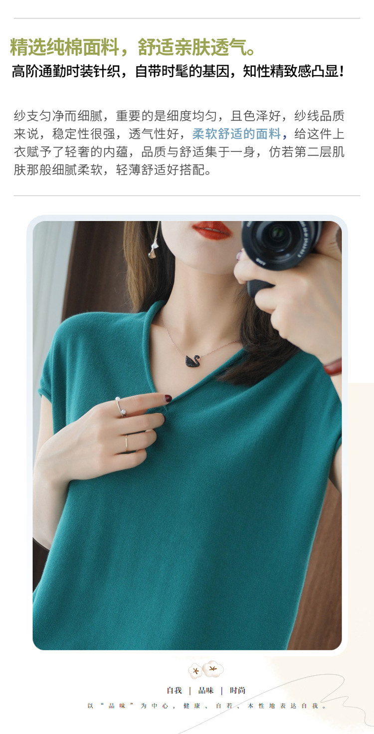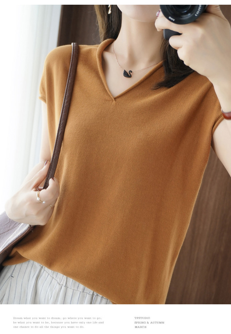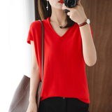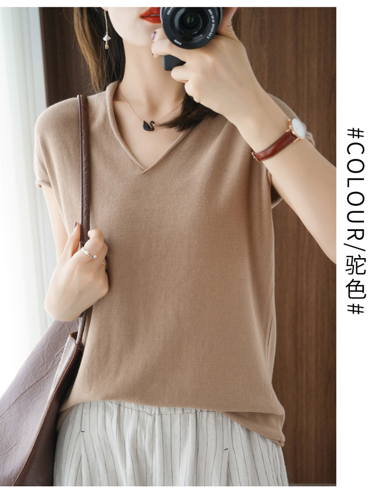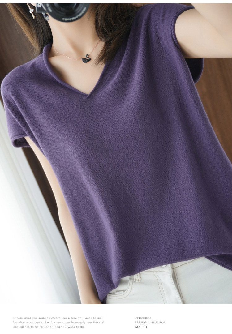 Хлопковая футболка, трикотажный свитер, коллекция 2021, 100% хлопок, из хлопка и льна, V-образный вырез, короткий рукав, свободный крой