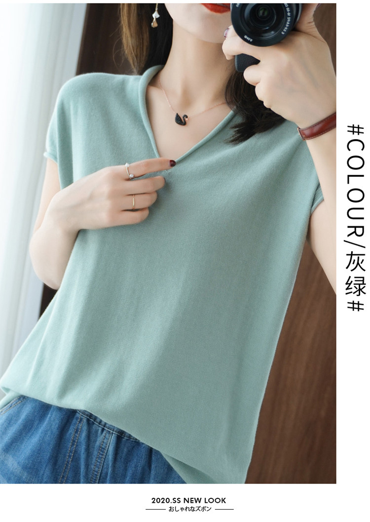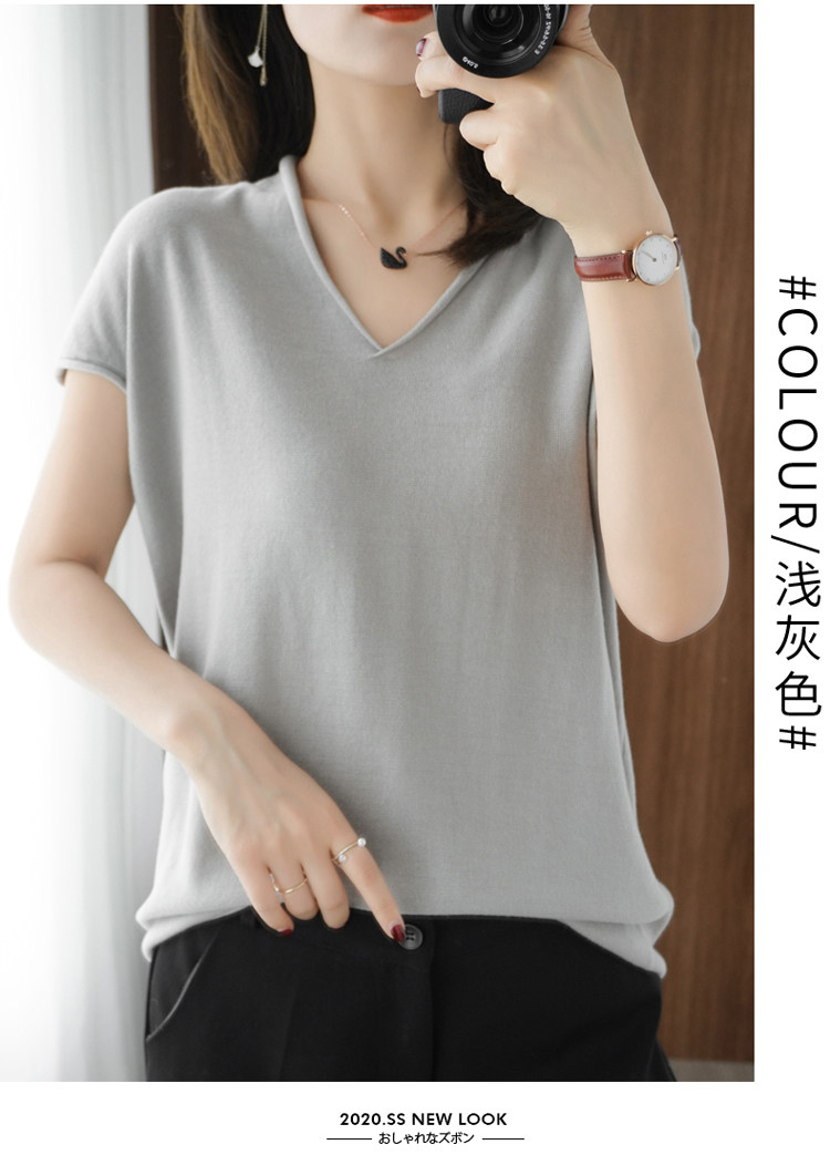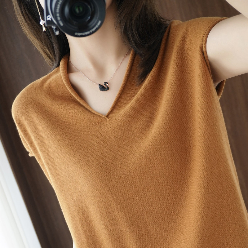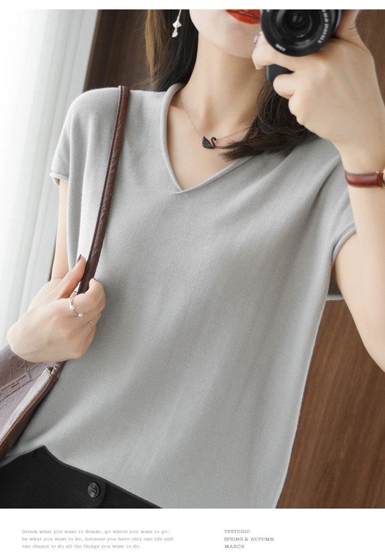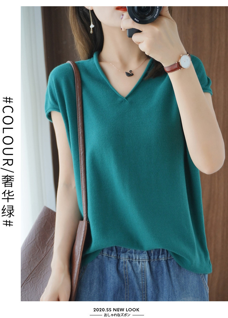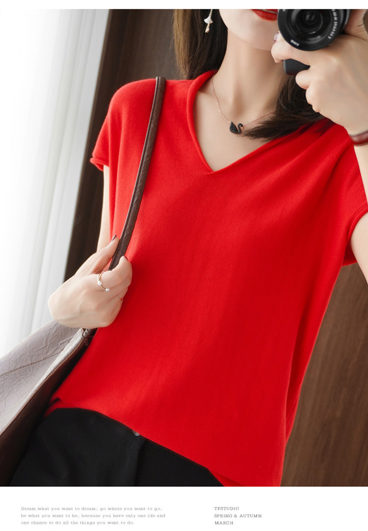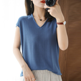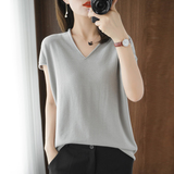 Хлопковая футболка, трикотажный свитер, коллекция 2021, 100% хлопок, из хлопка и льна, V-образный вырез, короткий рукав, свободный крой