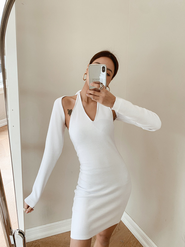 Трикотажный комплект, платье, юбка, V-образный вырез, 2 шт, с открытой спиной, в обтяжку, с акцентом на бедрах