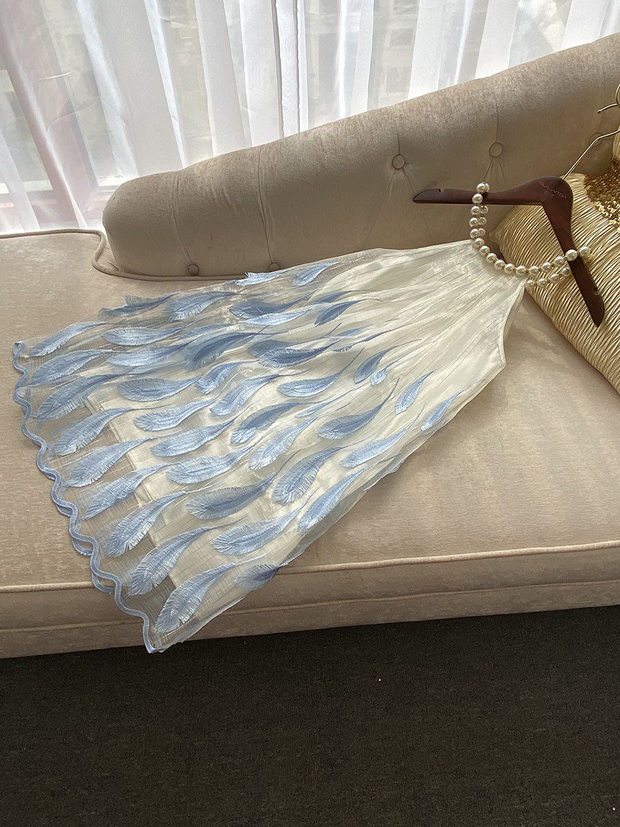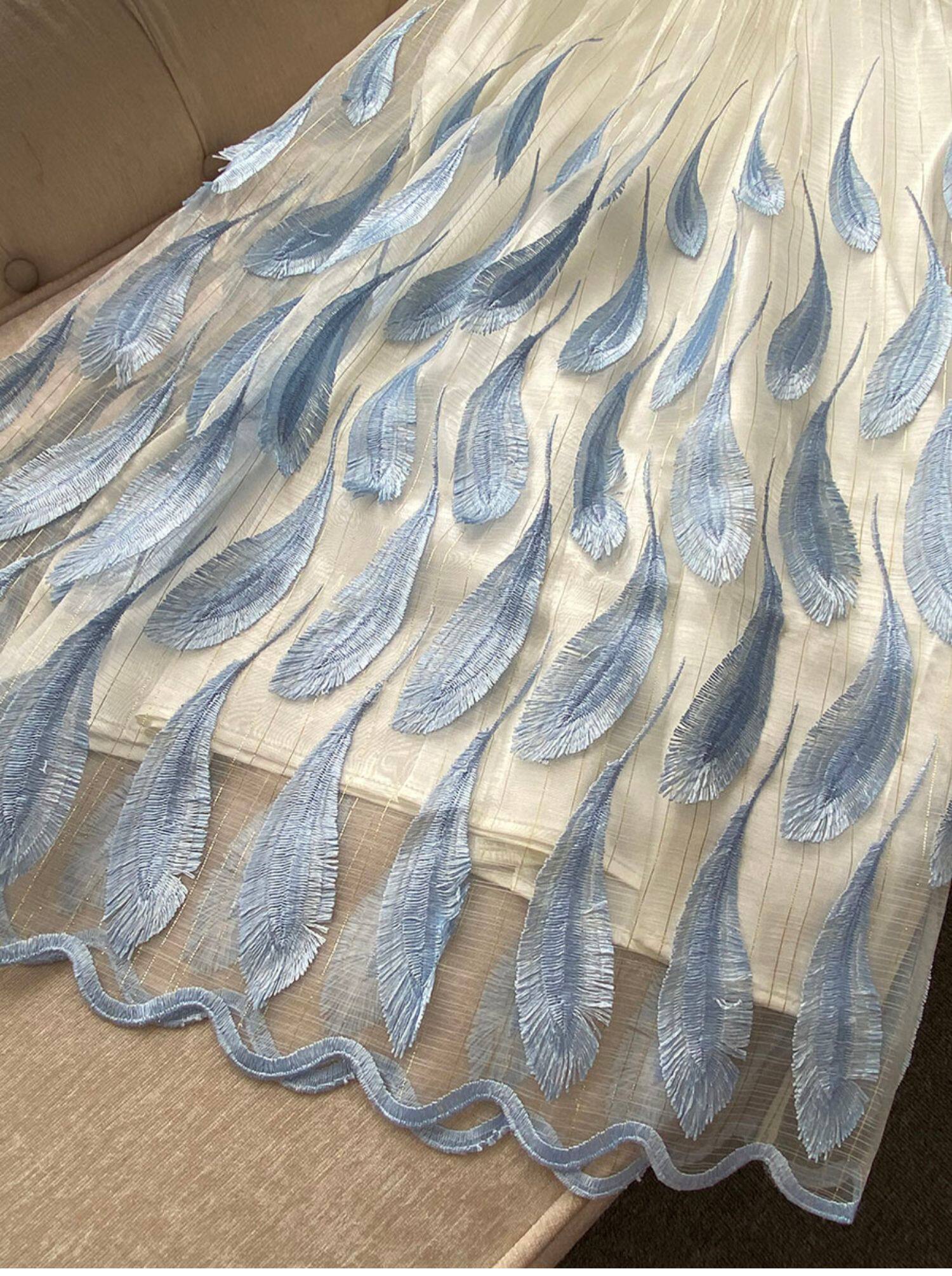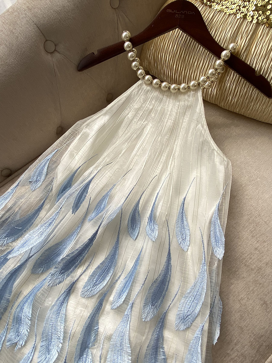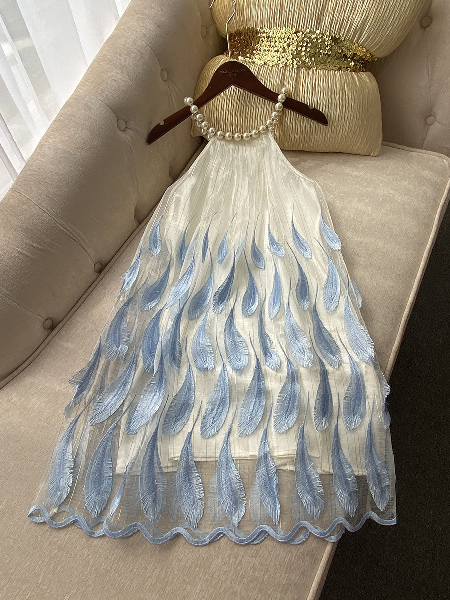 Свежее милое летнее синее платье без рукавов, набивка пером, с вышивкой, изысканный стиль